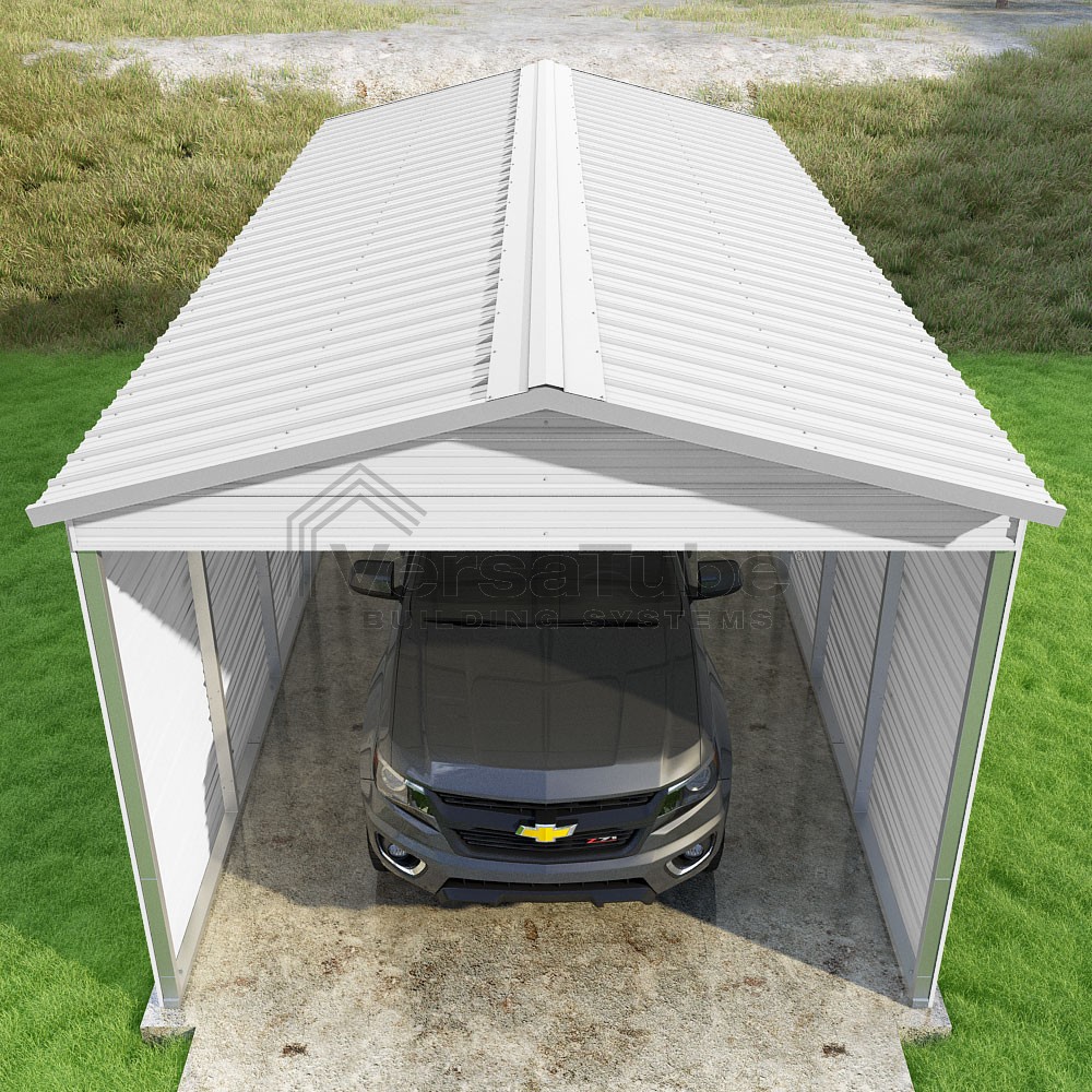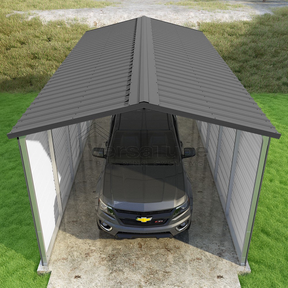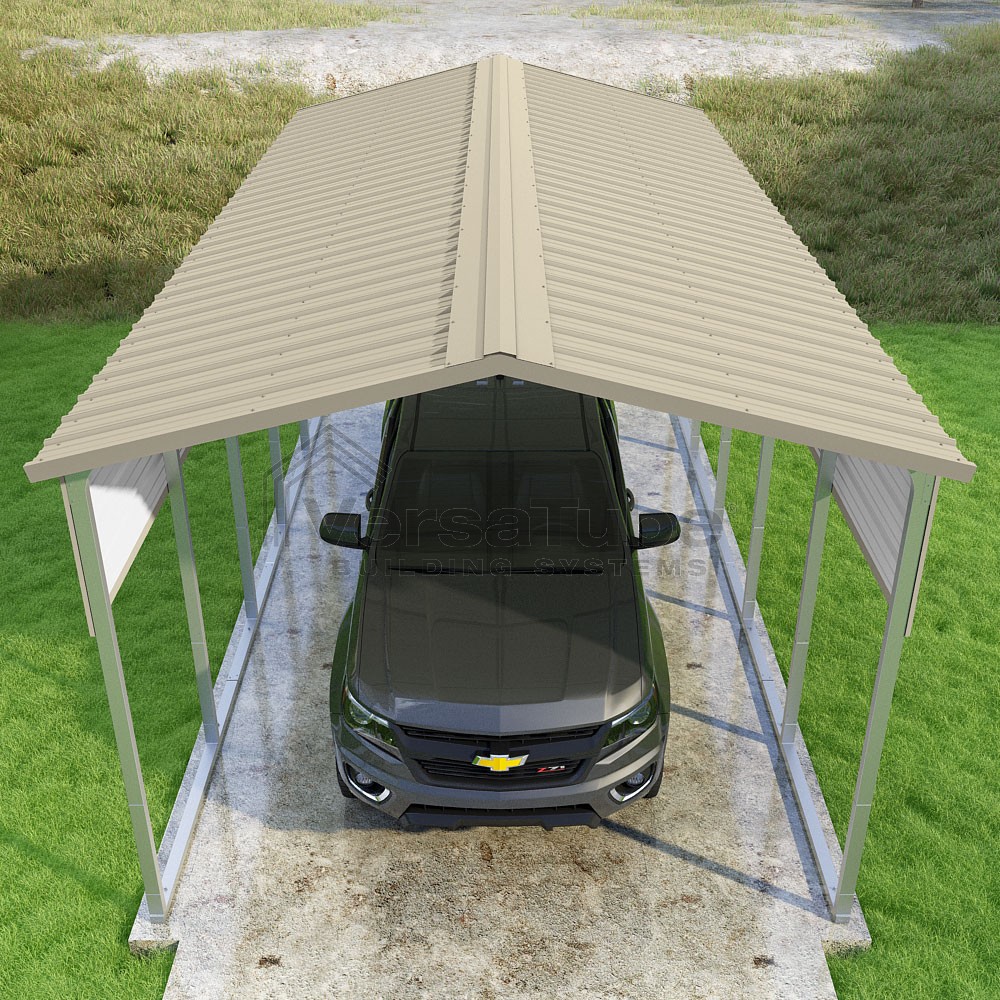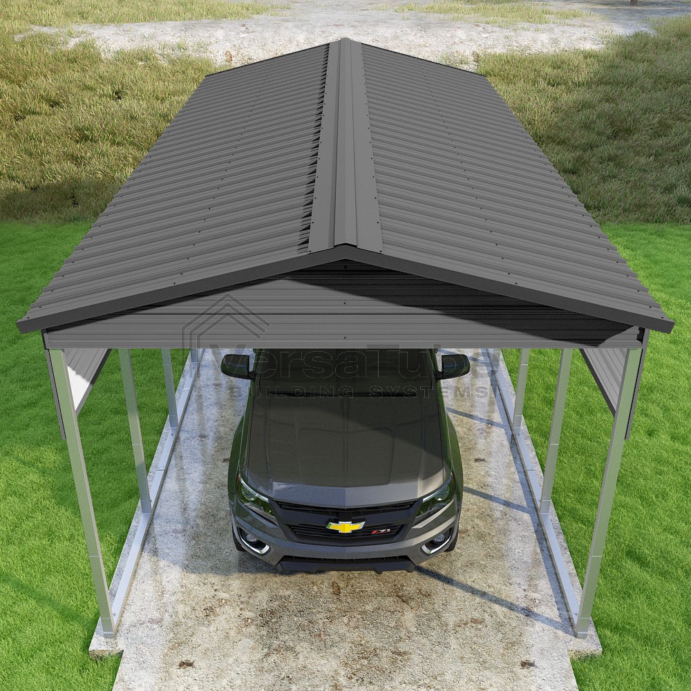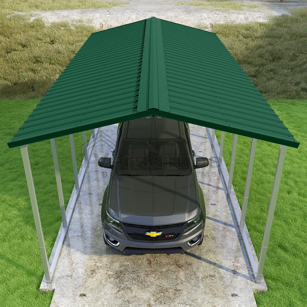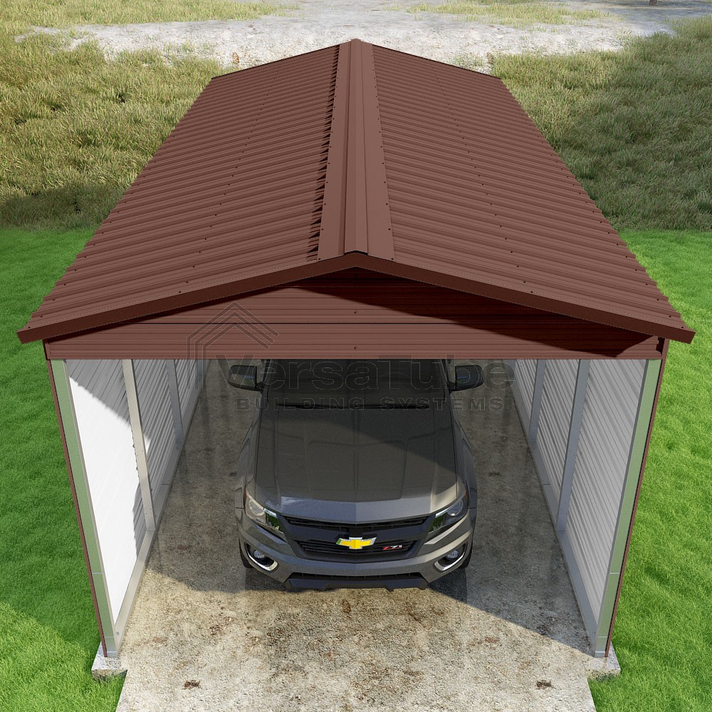 Pinnacle Series DIY carport kit features vertical sheet metal roof panels with ridge cap, gable and eave trim for an A-frame roof style and extended coverage on both ends.