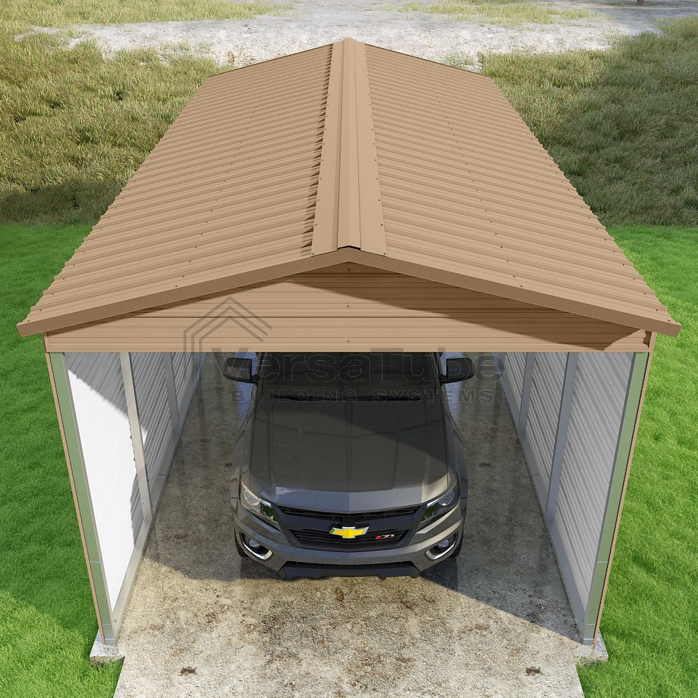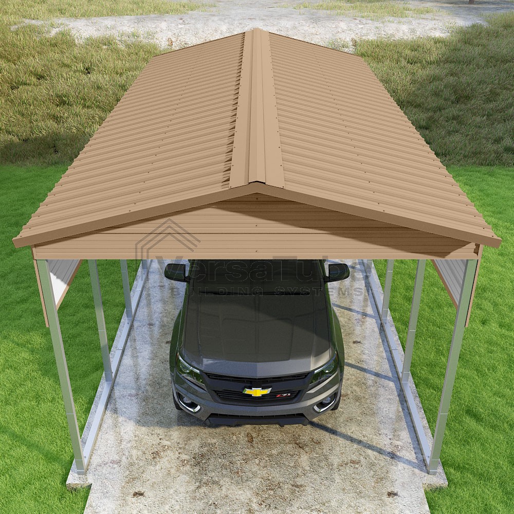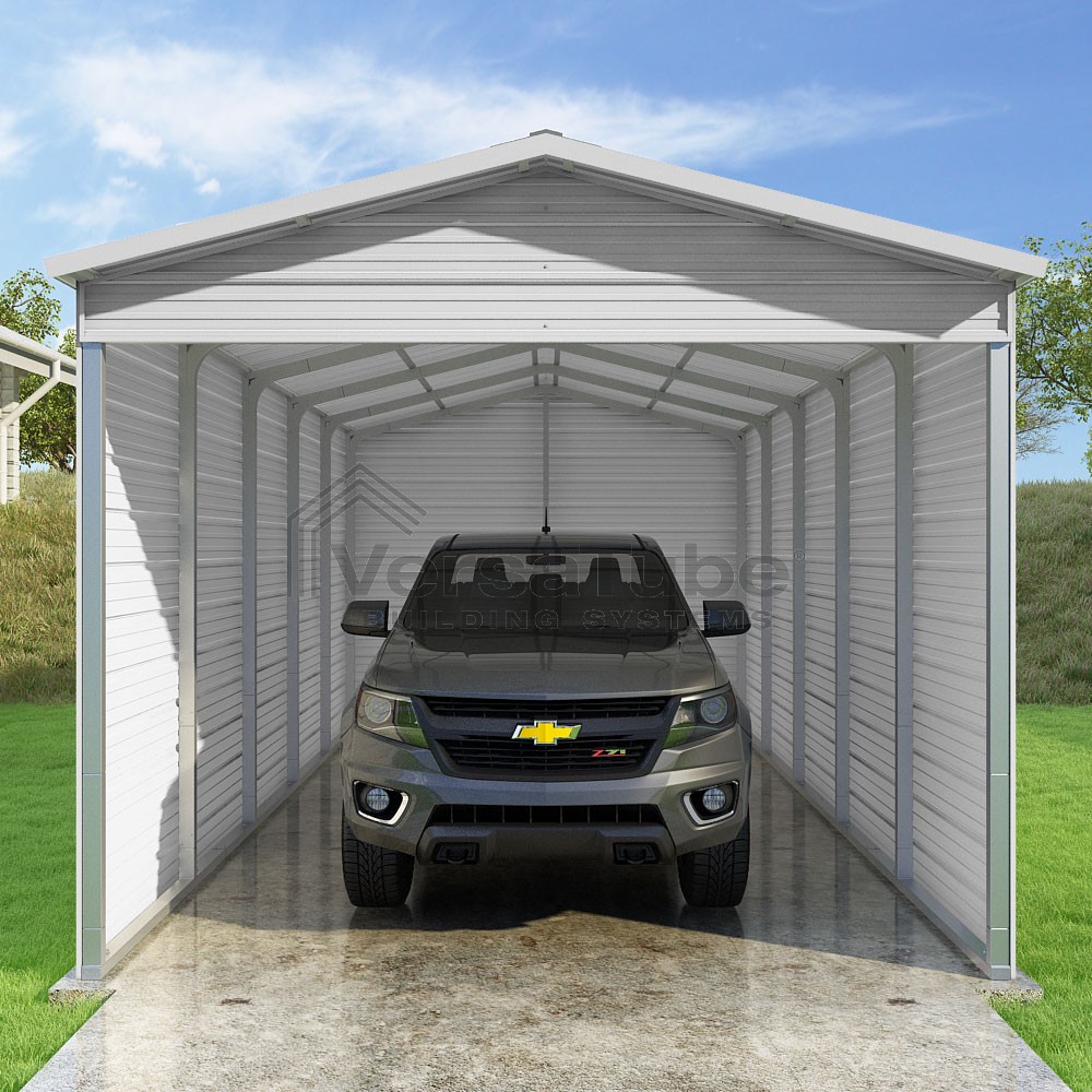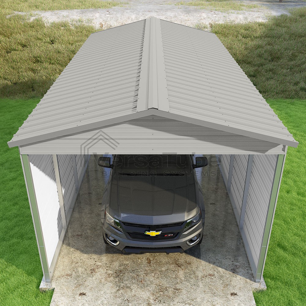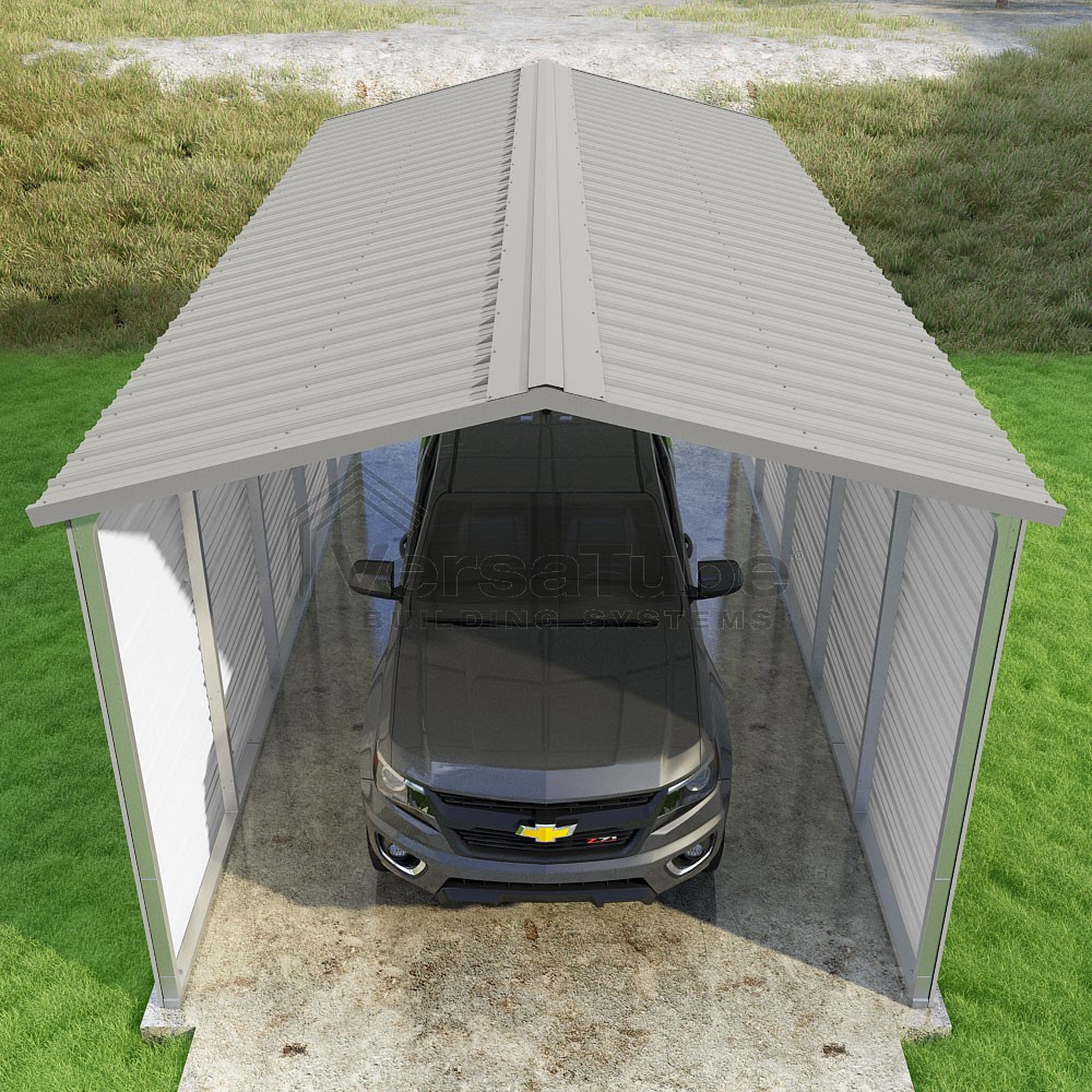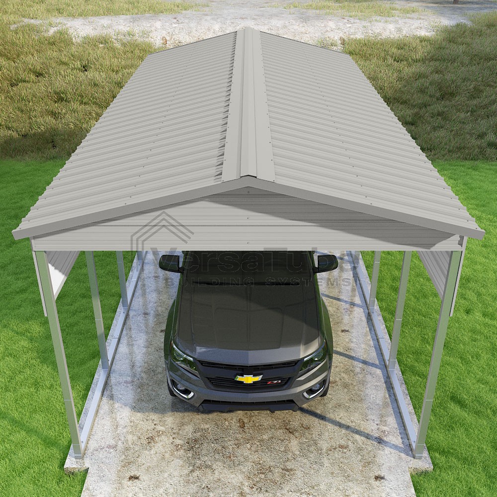 Pinnacle Series DIY carport kit features vertical sheet metal roof panels with ridge cap, gable and eave trim for an A-frame roof style and extended coverage on both ends.