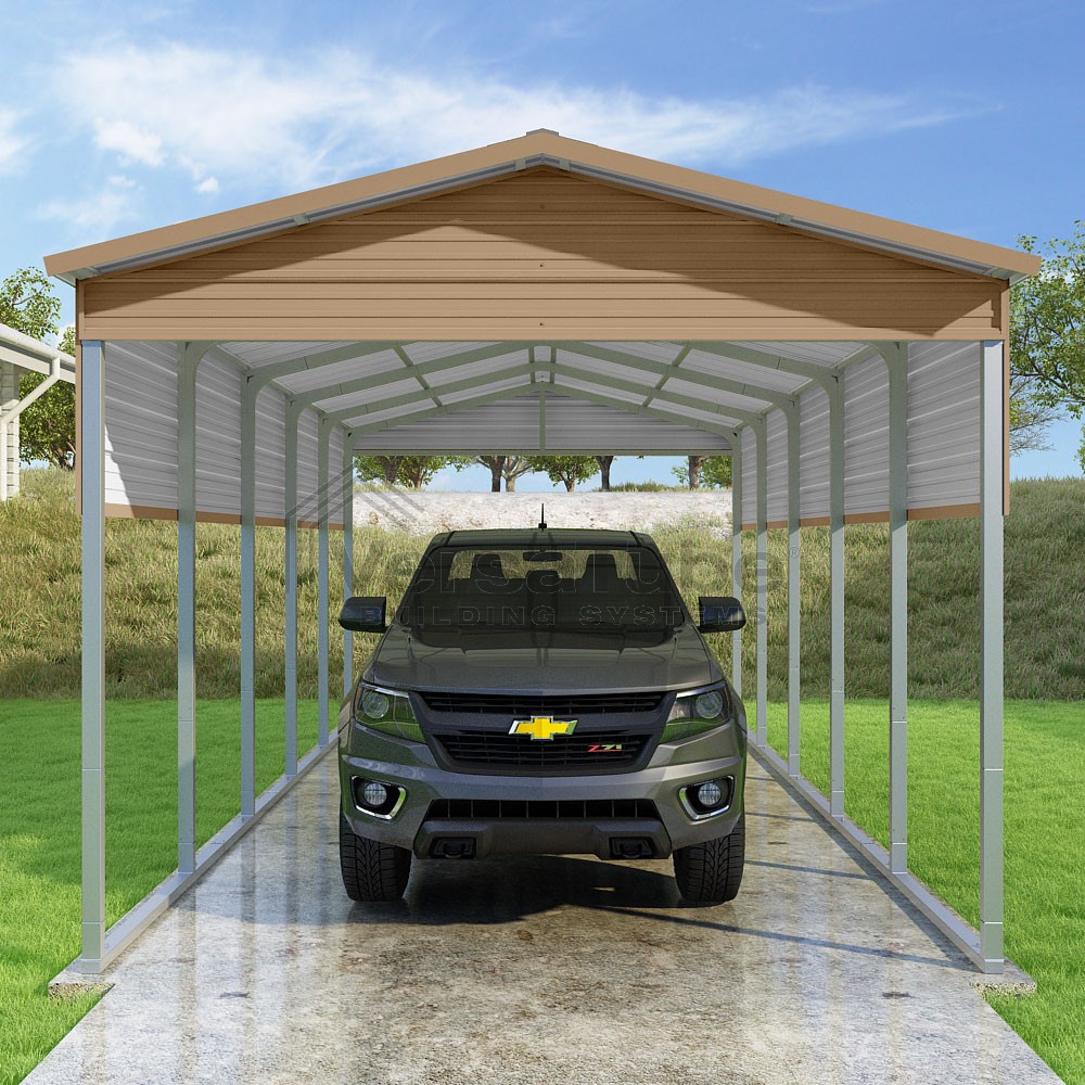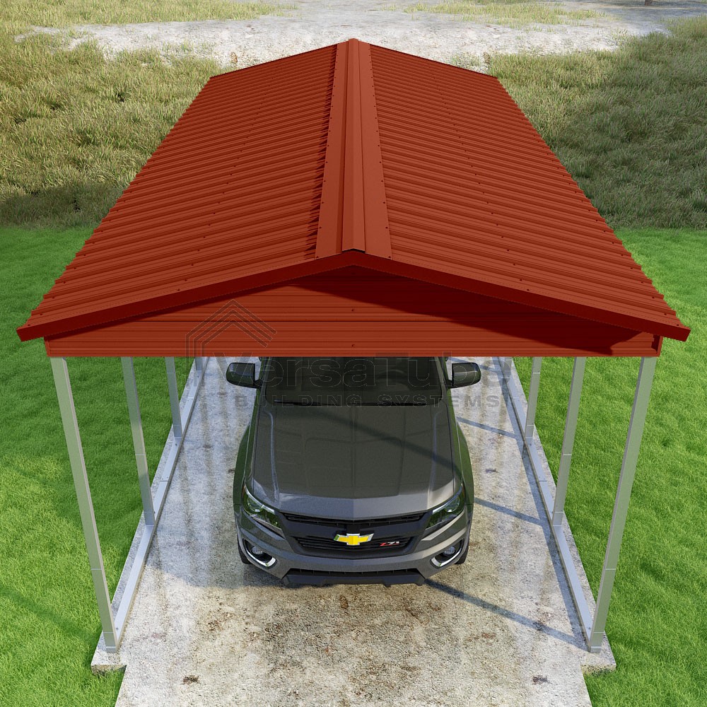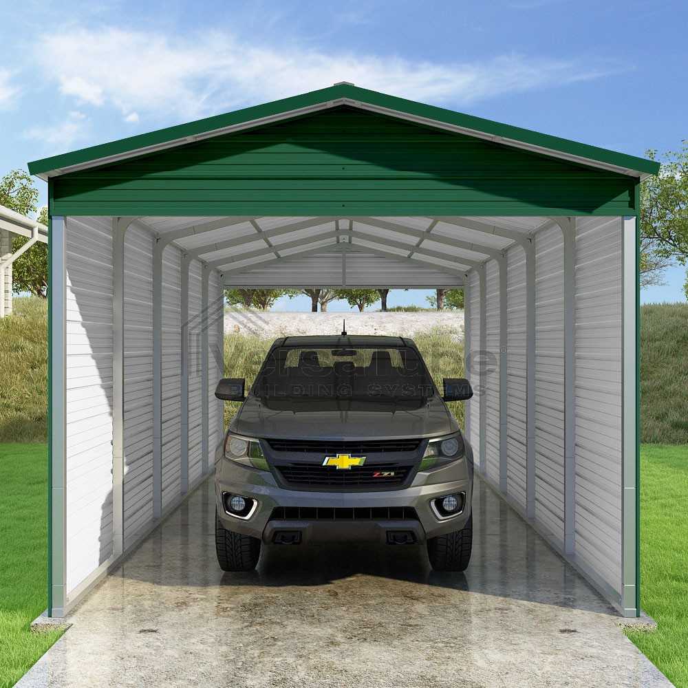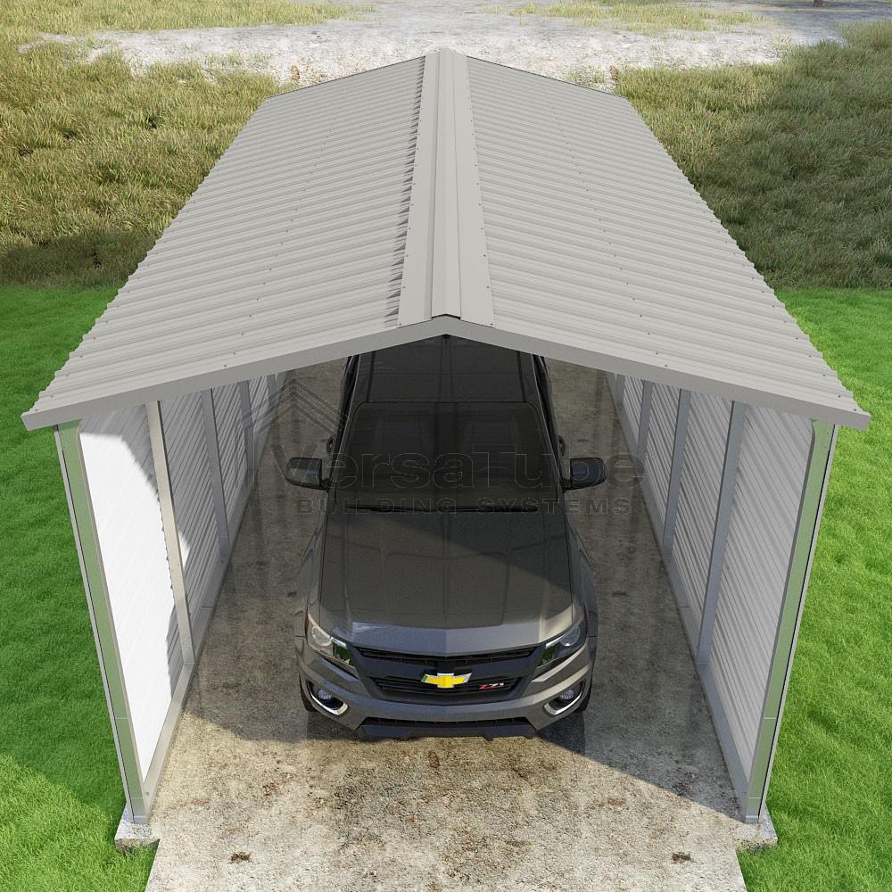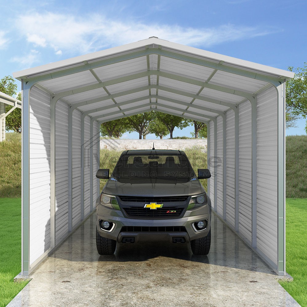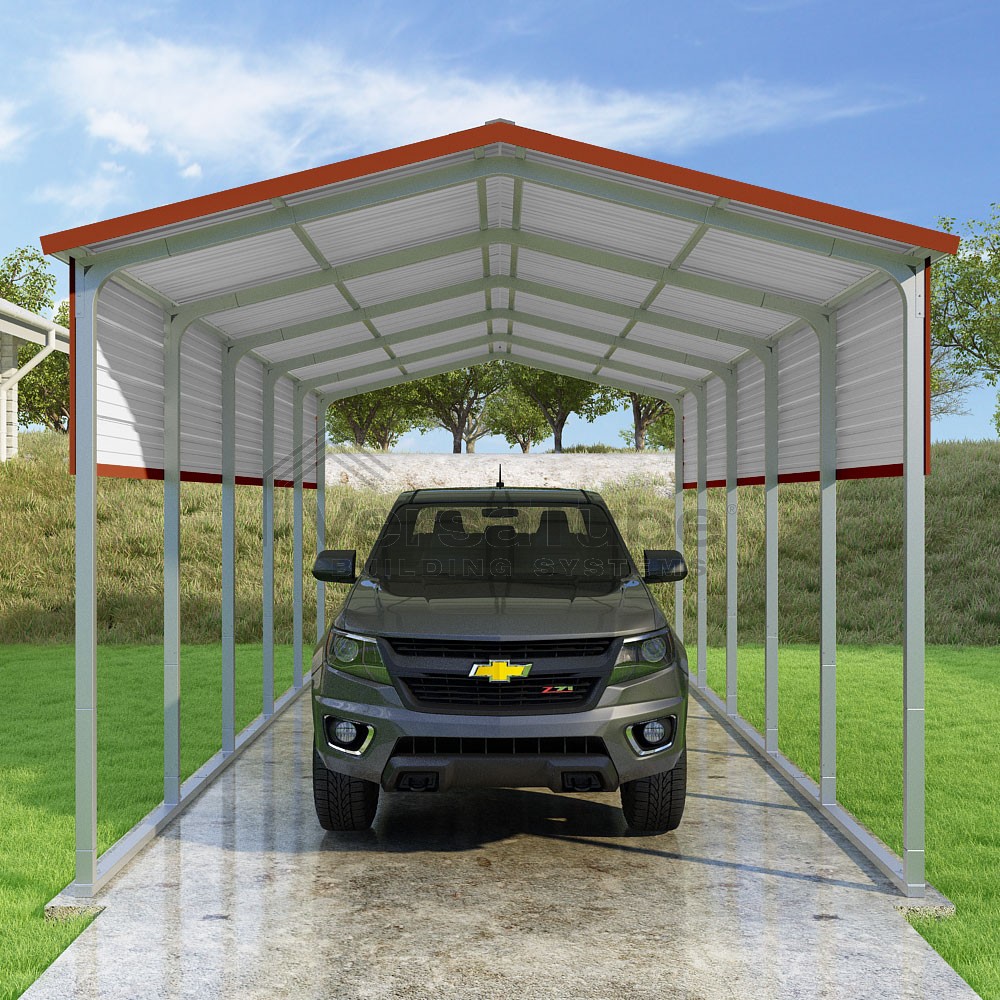 Pinnacle Series DIY carport kit features vertical sheet metal roof panels with ridge cap, gable and eave trim for an A-frame roof style and extended coverage on both ends.