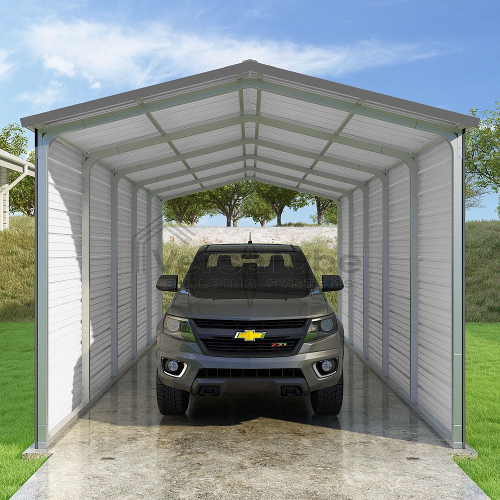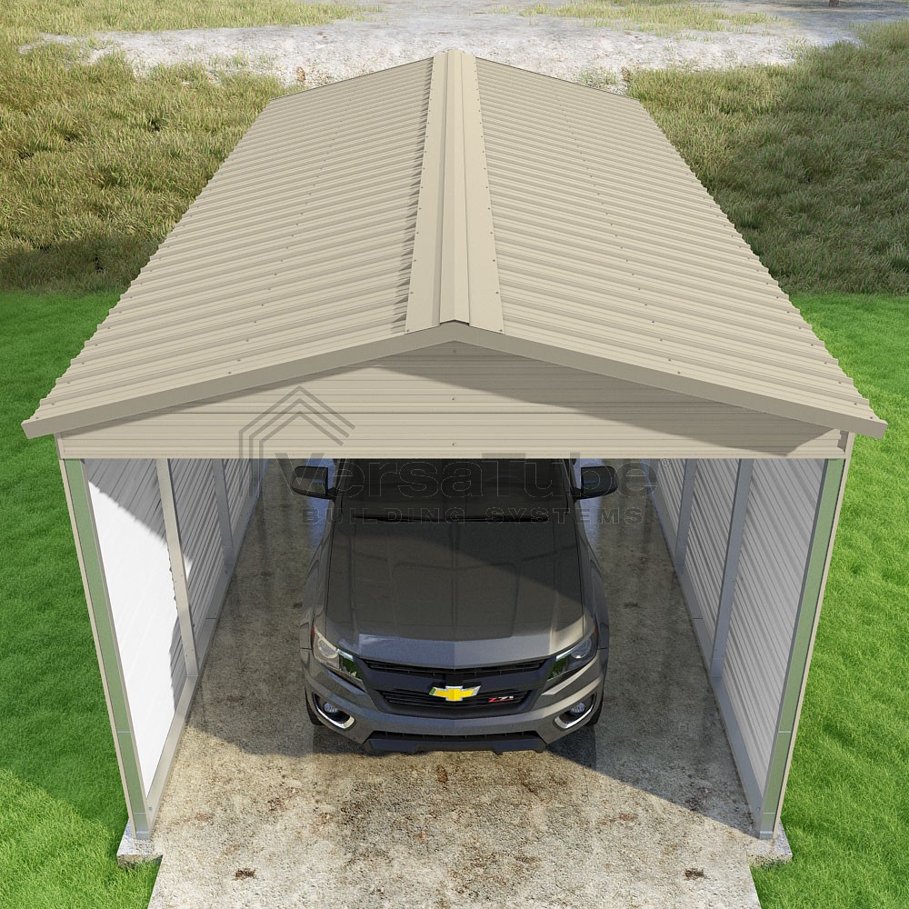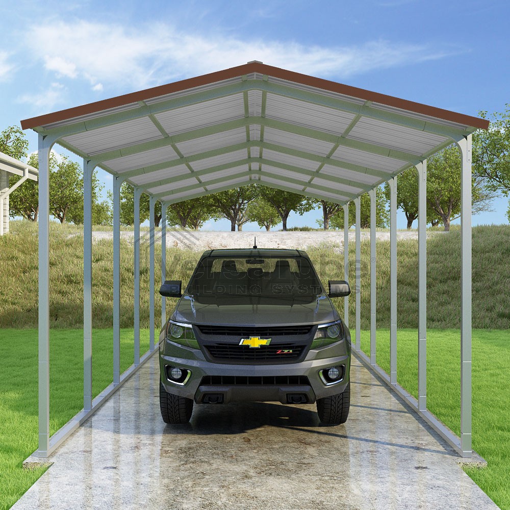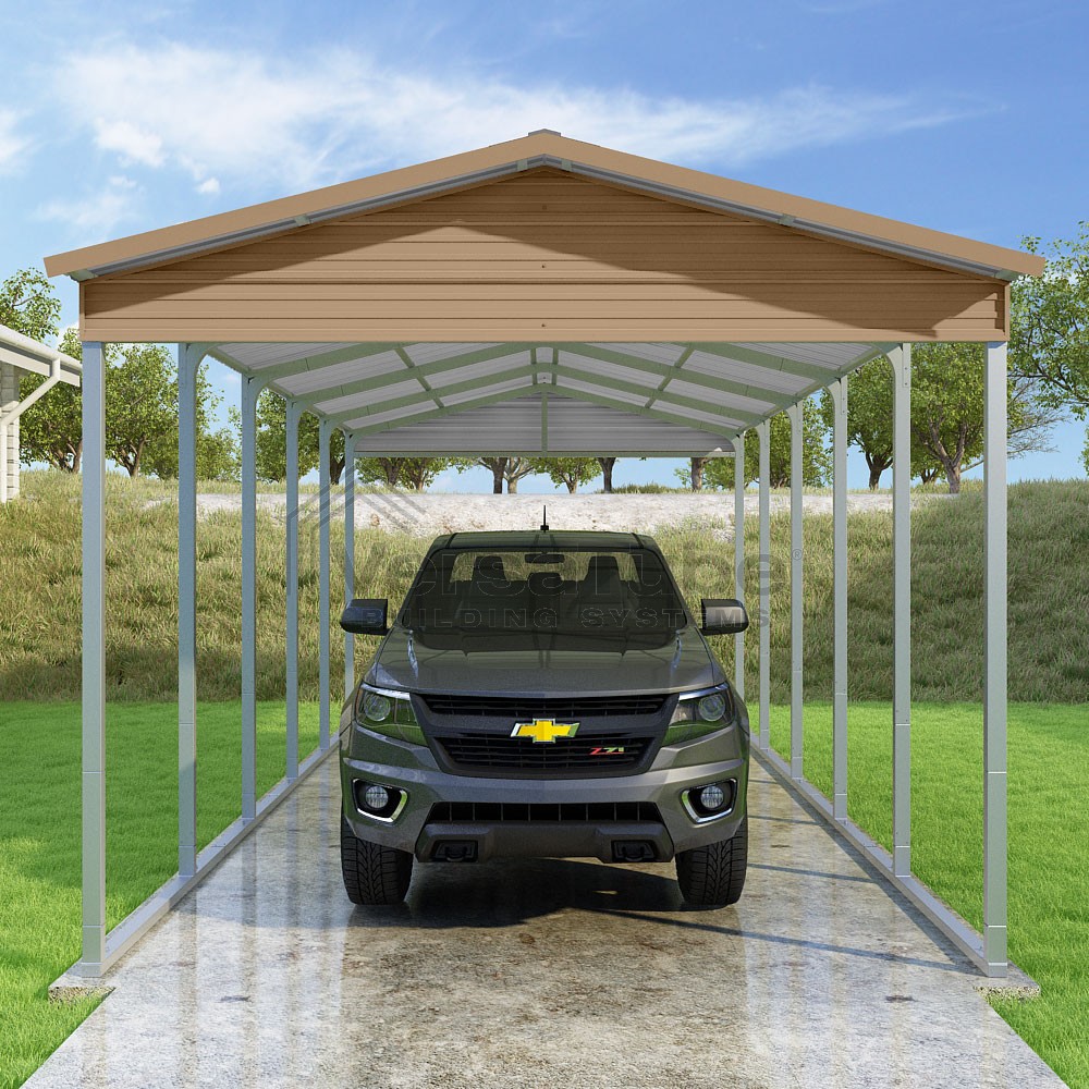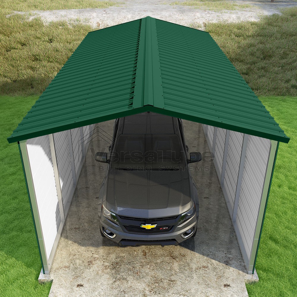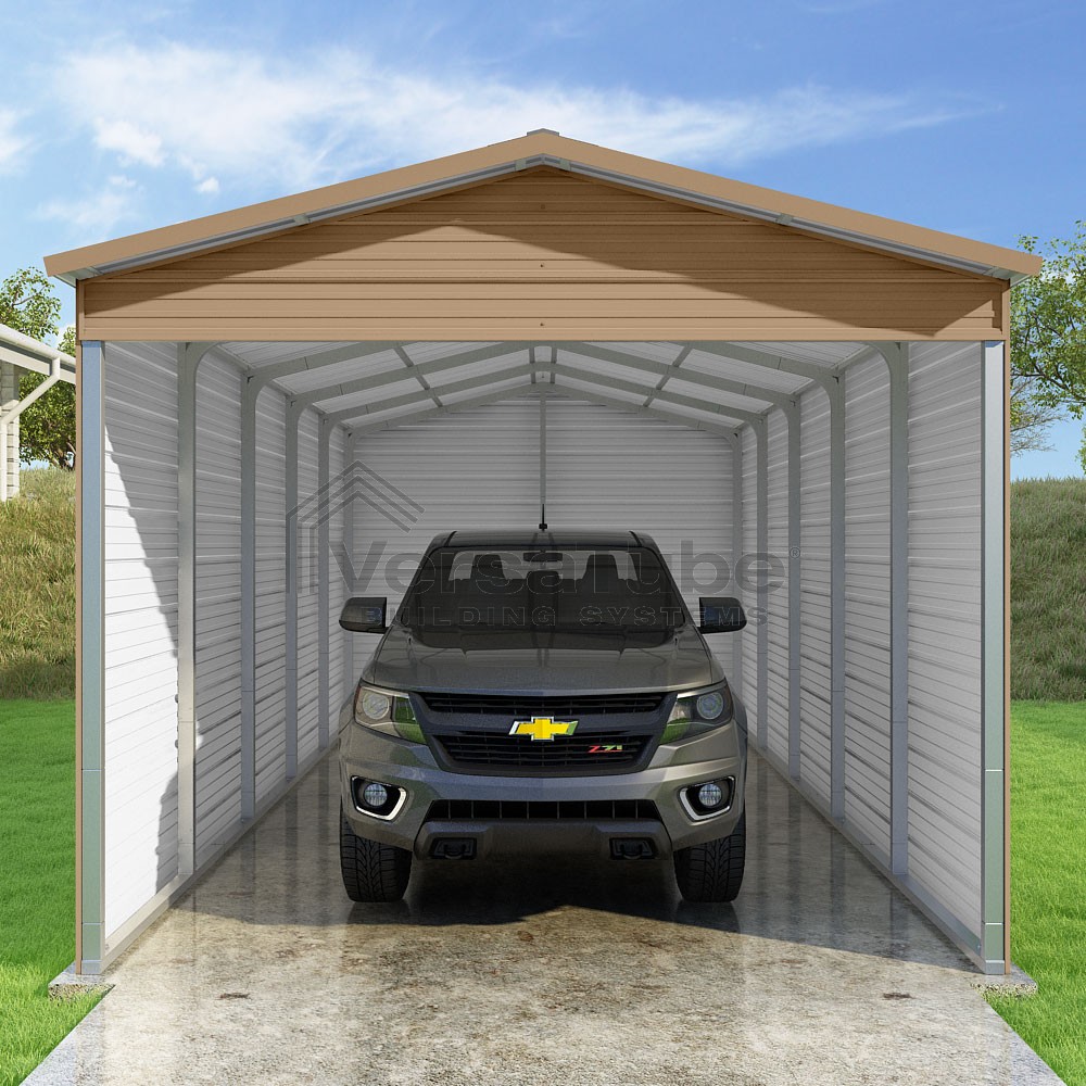 Pinnacle Series DIY carport kit features vertical sheet metal roof panels with ridge cap, gable and eave trim for an A-frame roof style and extended coverage on both ends.