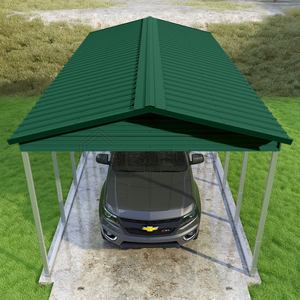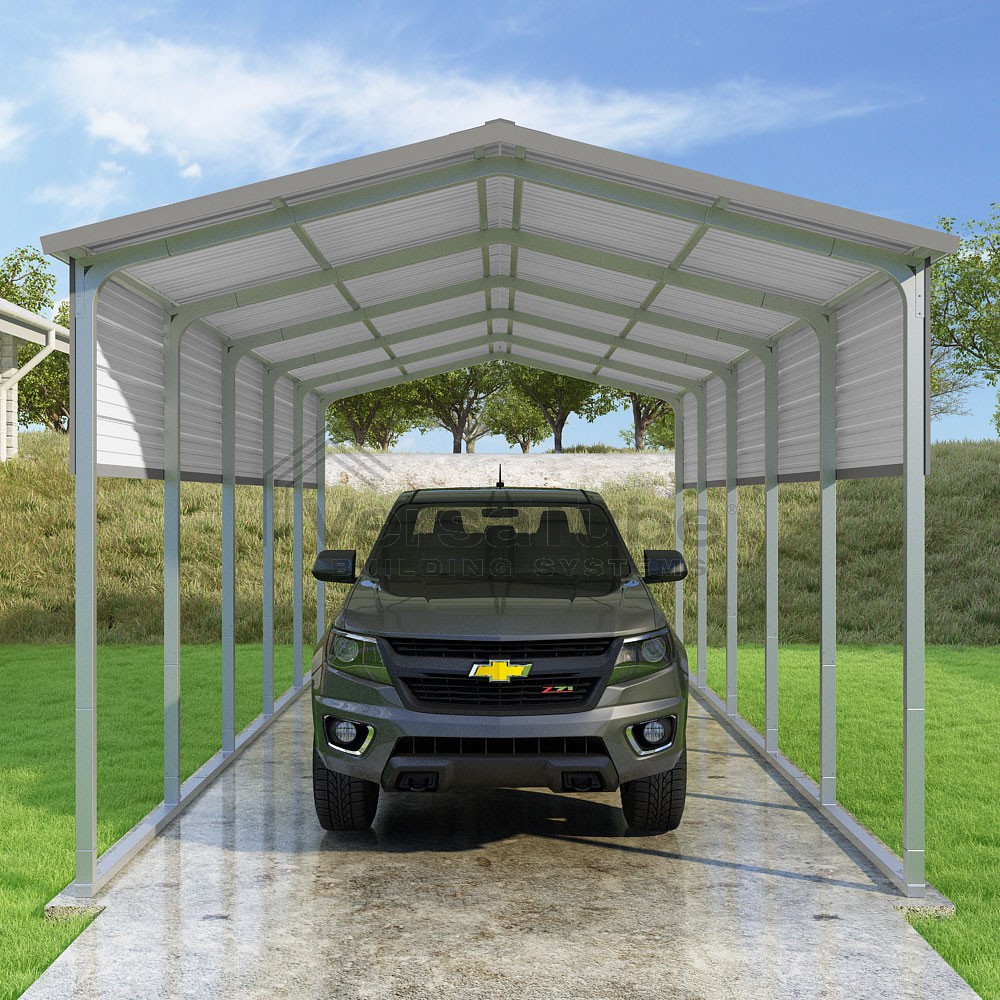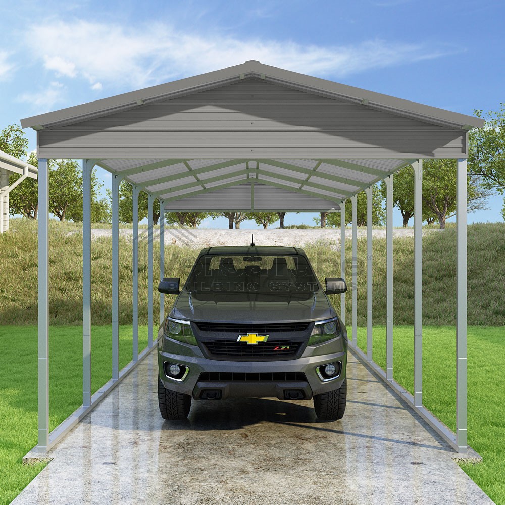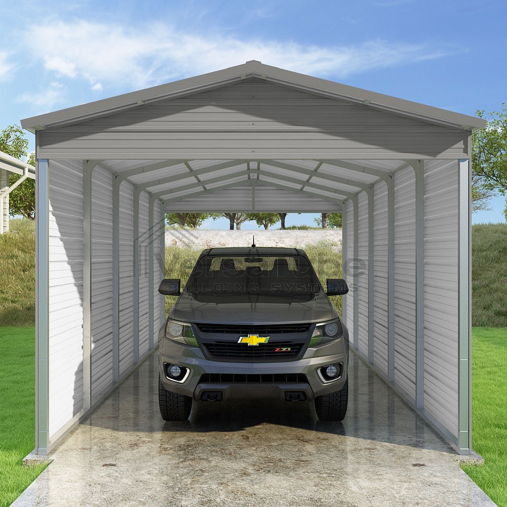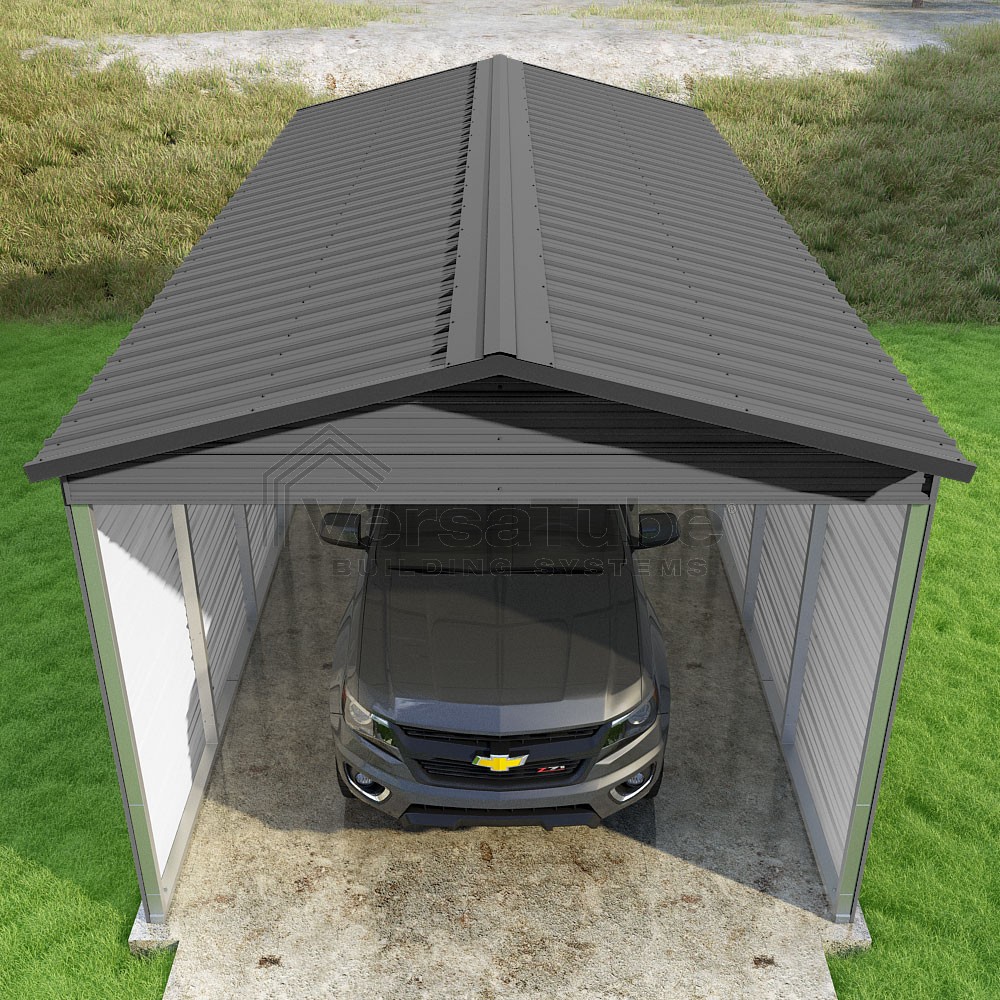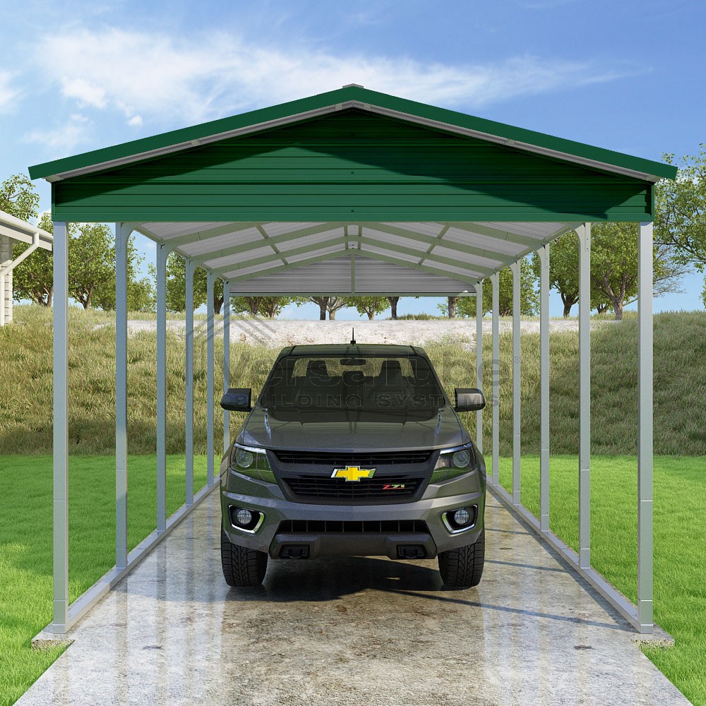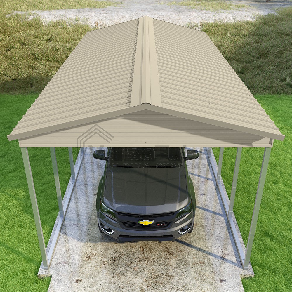 Pinnacle Series DIY carport kit features vertical sheet metal roof panels with ridge cap, gable and eave trim for an A-frame roof style and extended coverage on both ends.