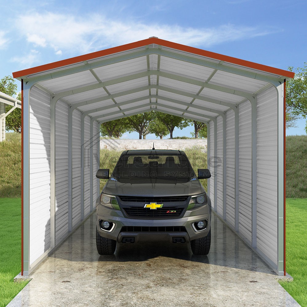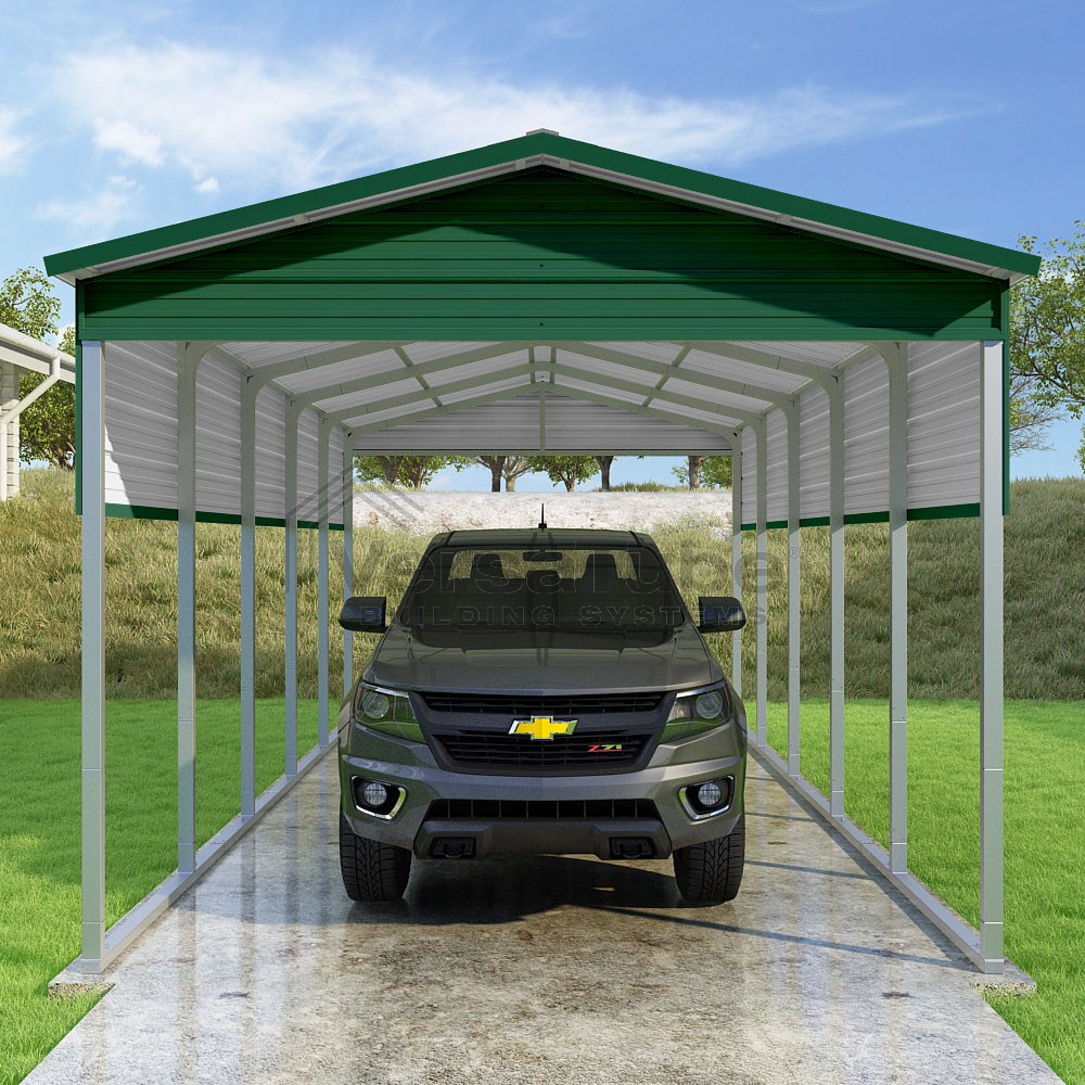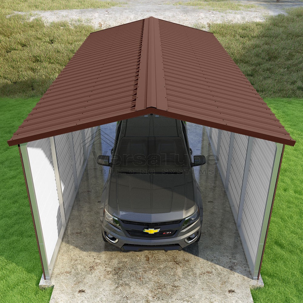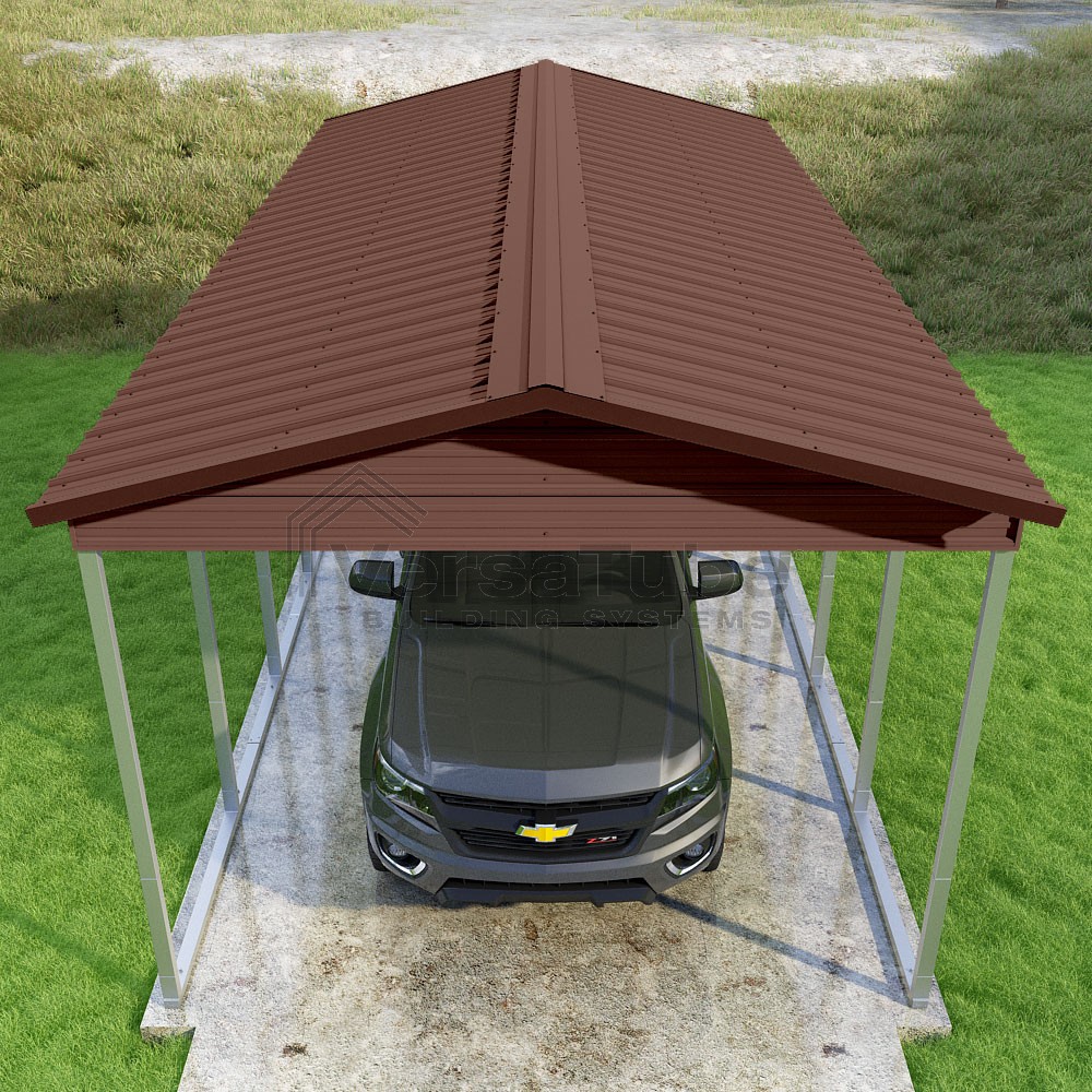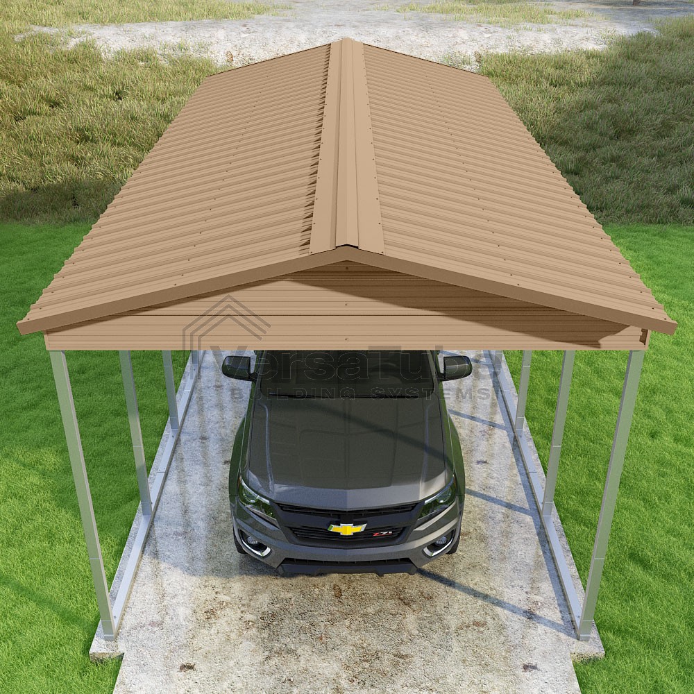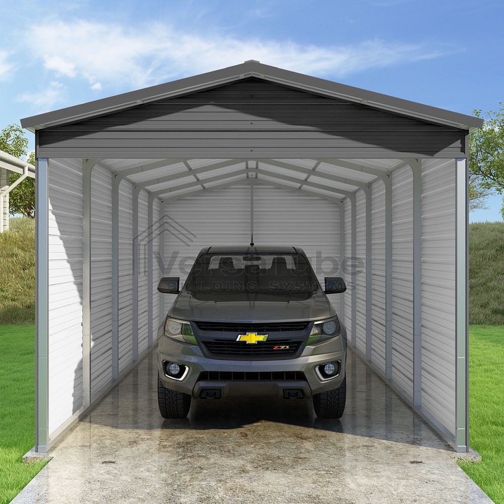 Pinnacle Series DIY carport kit features vertical sheet metal roof panels with ridge cap, gable and eave trim for an A-frame roof style and extended coverage on both ends.