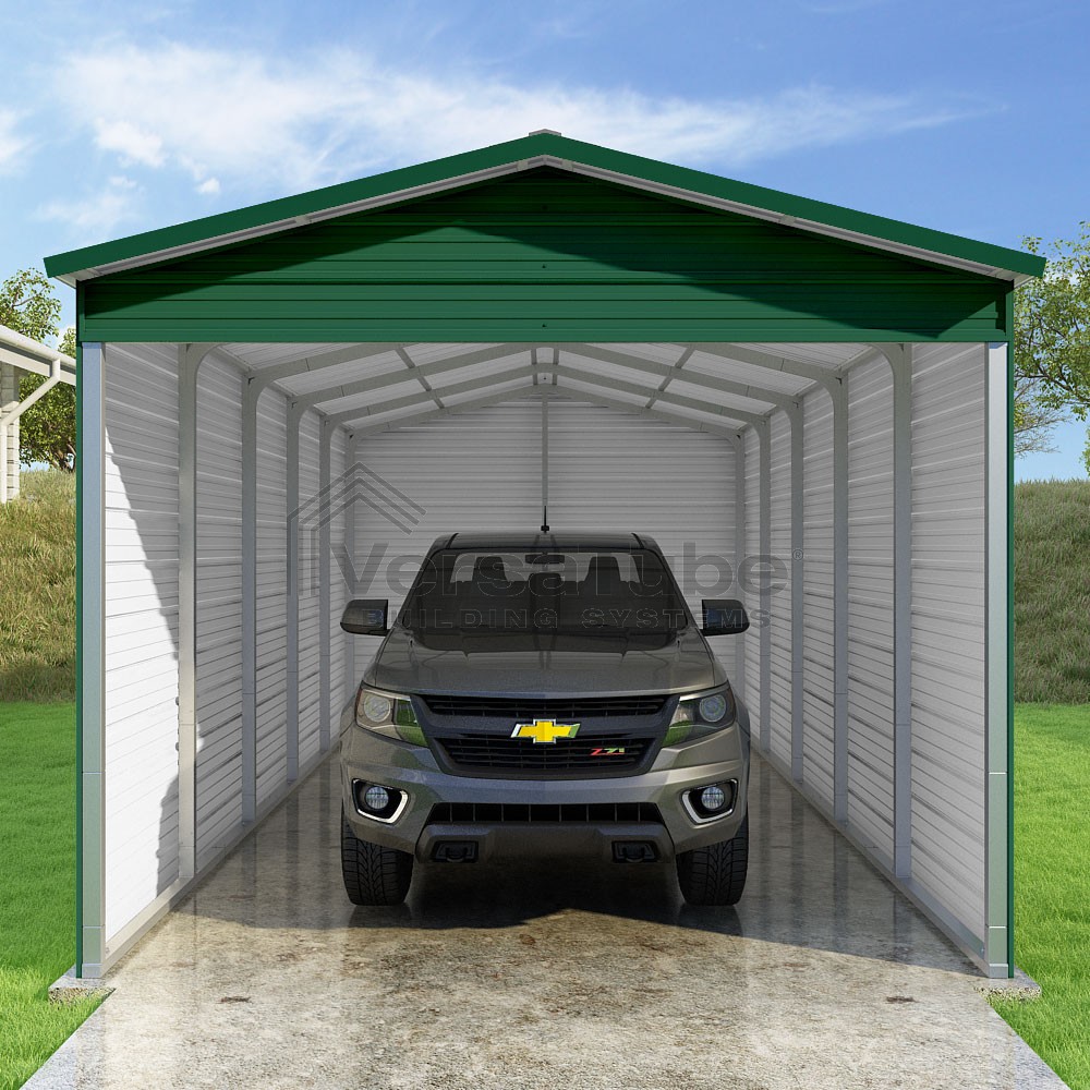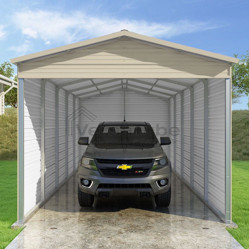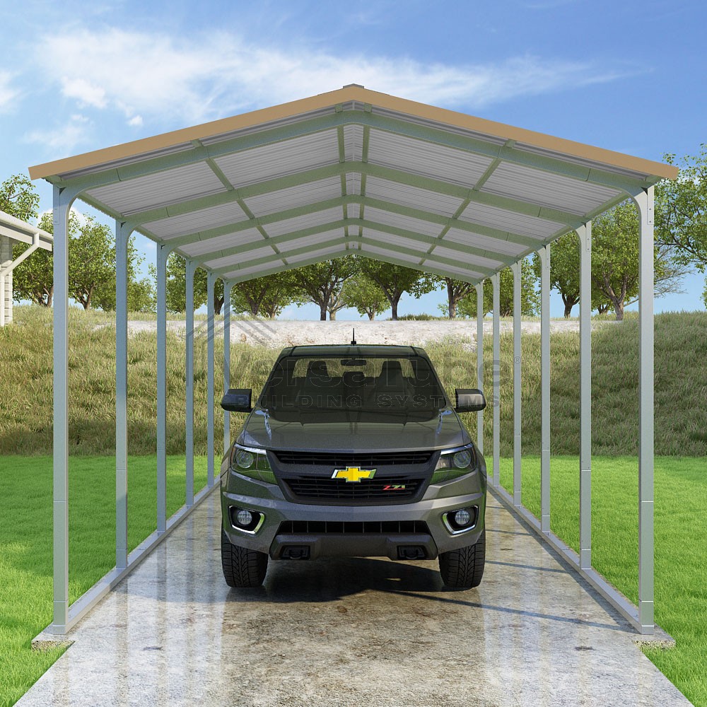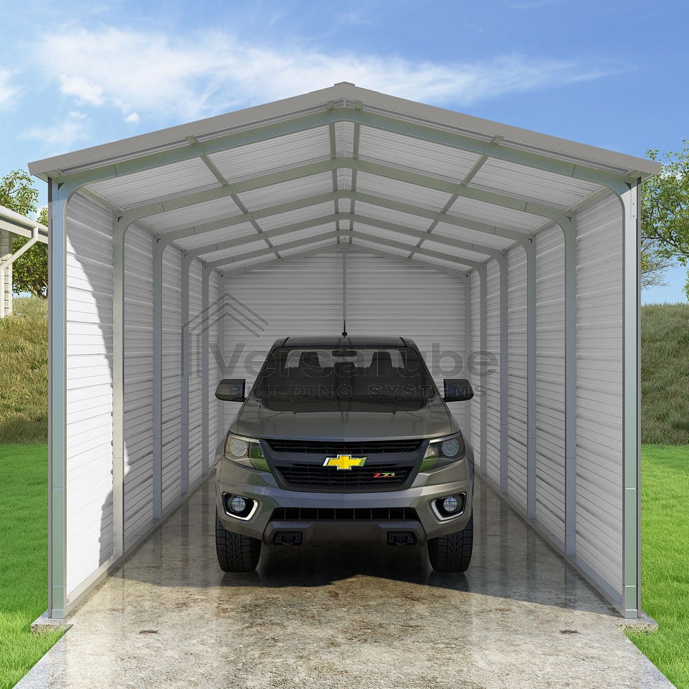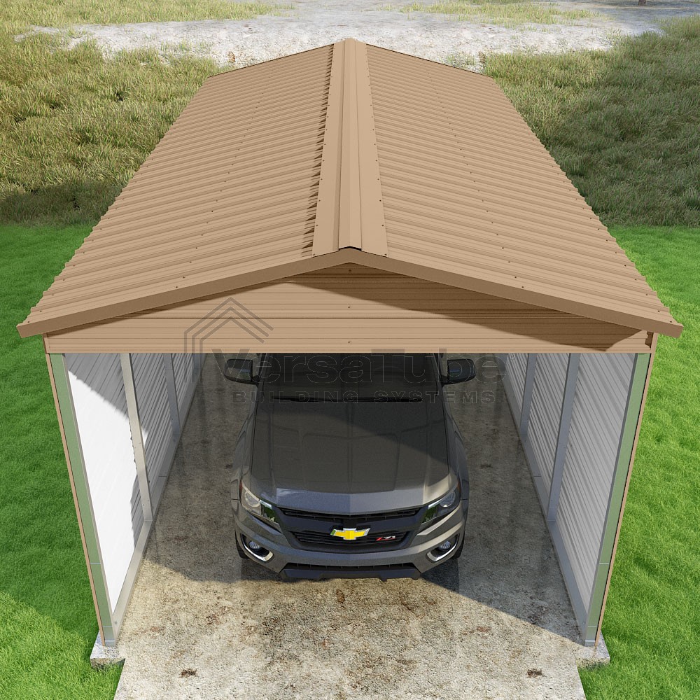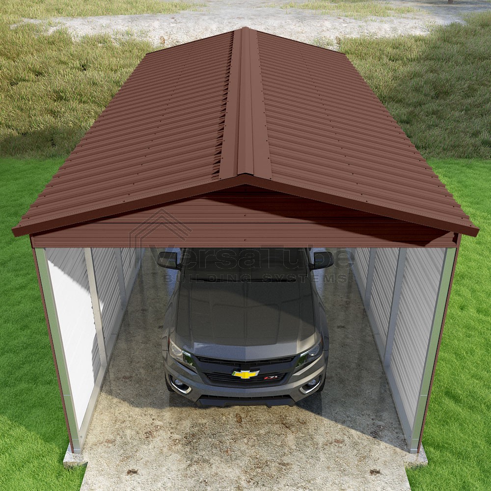 Pinnacle Series DIY carport kit features vertical sheet metal roof panels with ridge cap, gable and eave trim for an A-frame roof style and extended coverage on both ends.