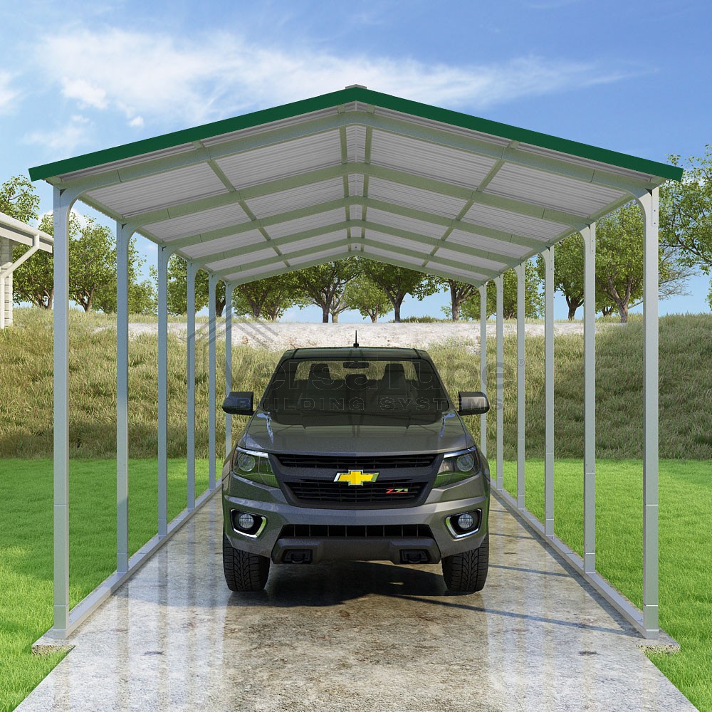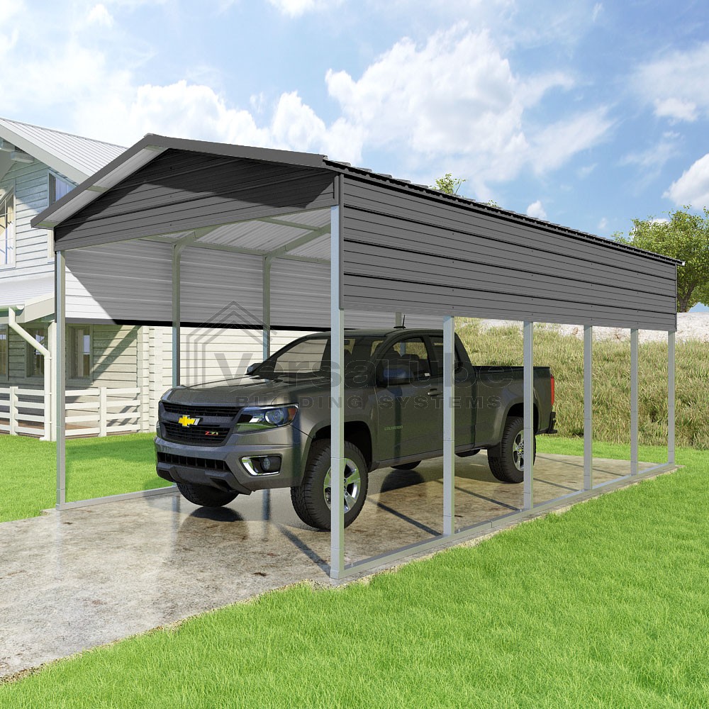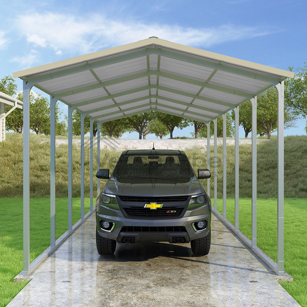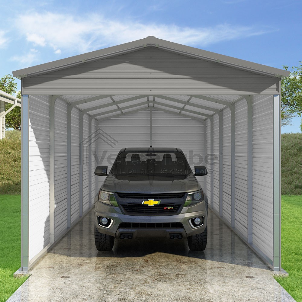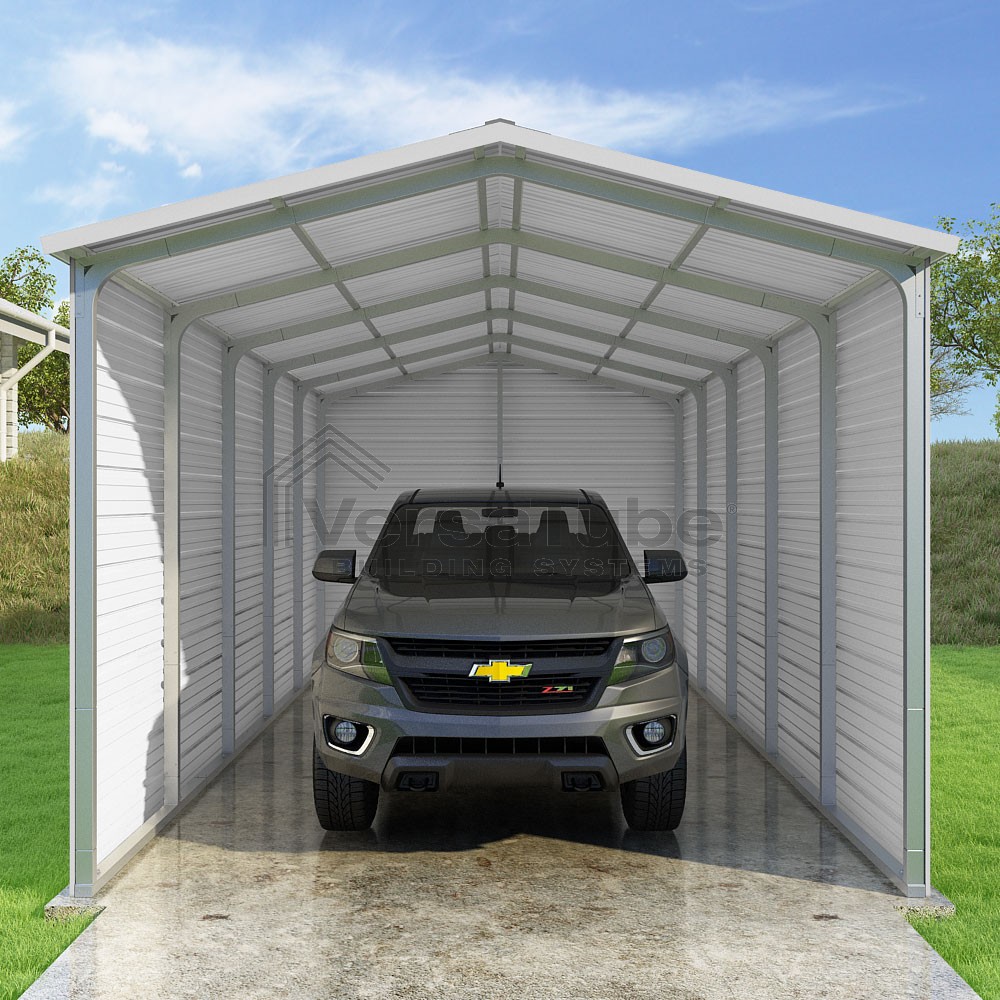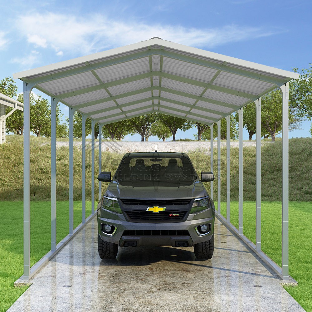 Pinnacle Series DIY carport kit features vertical sheet metal roof panels with ridge cap, gable and eave trim for an A-frame roof style and extended coverage on both ends.