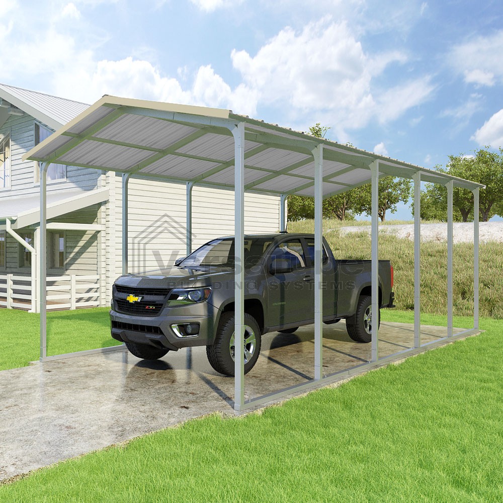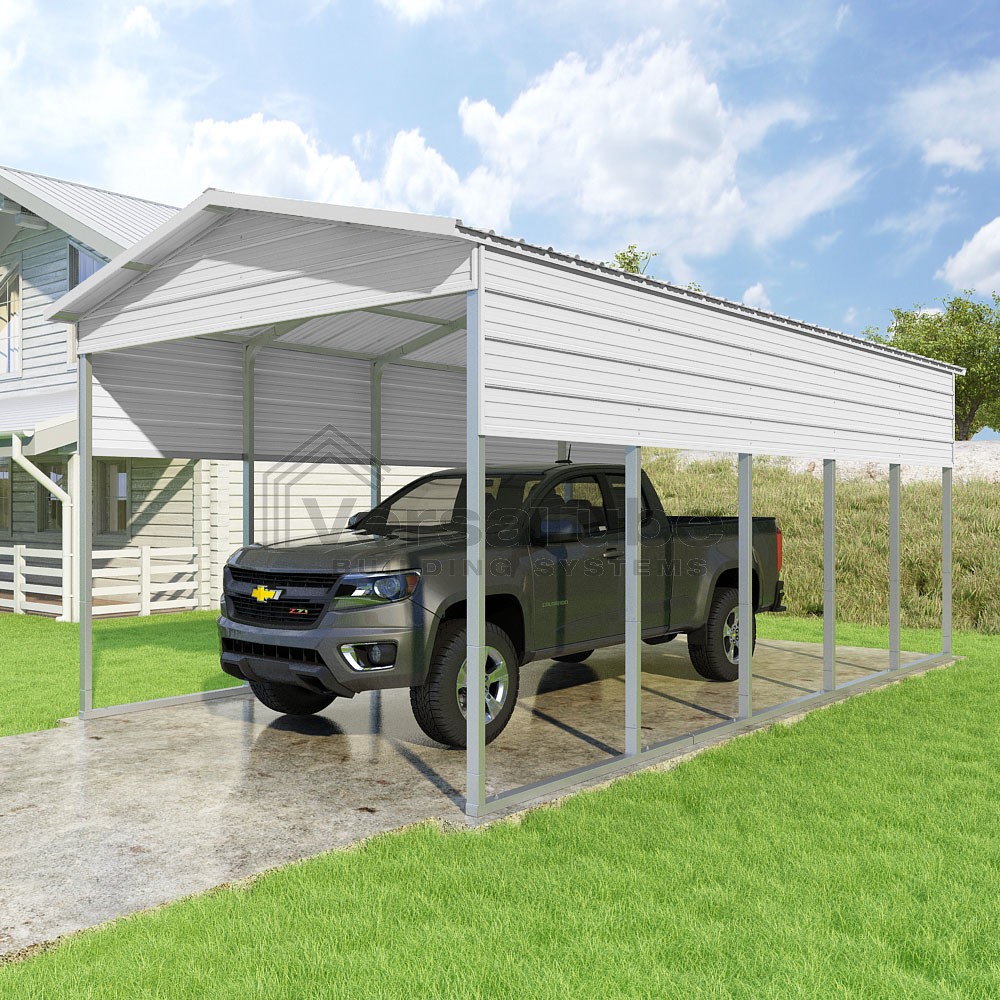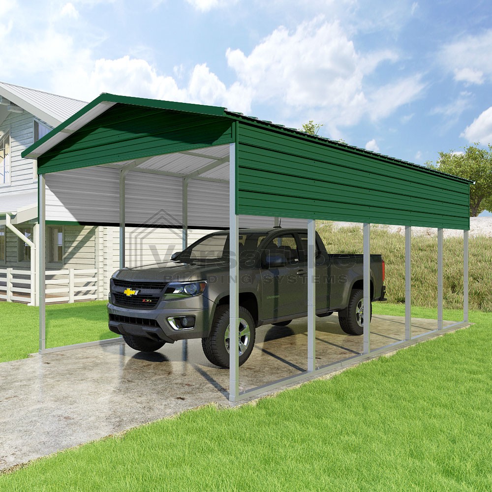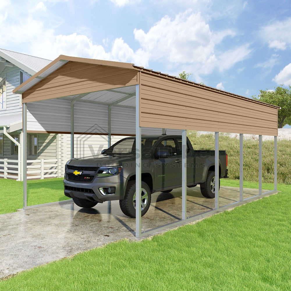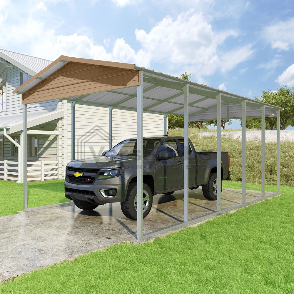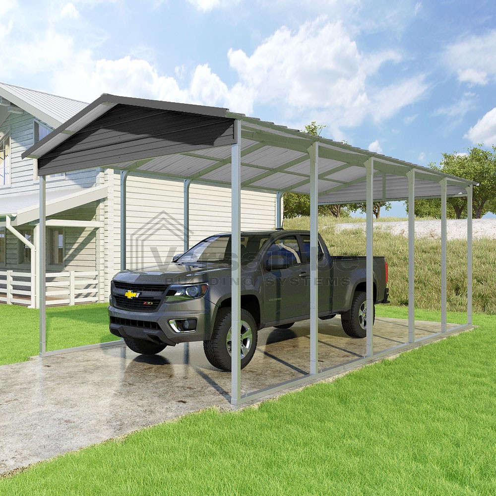Pinnacle Series DIY carport kit features vertical sheet metal roof panels with ridge cap, gable and eave trim for an A-frame roof style and extended coverage on both ends.