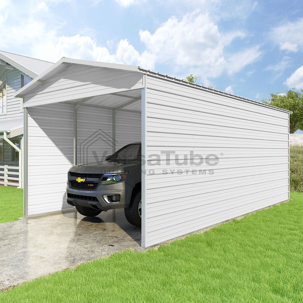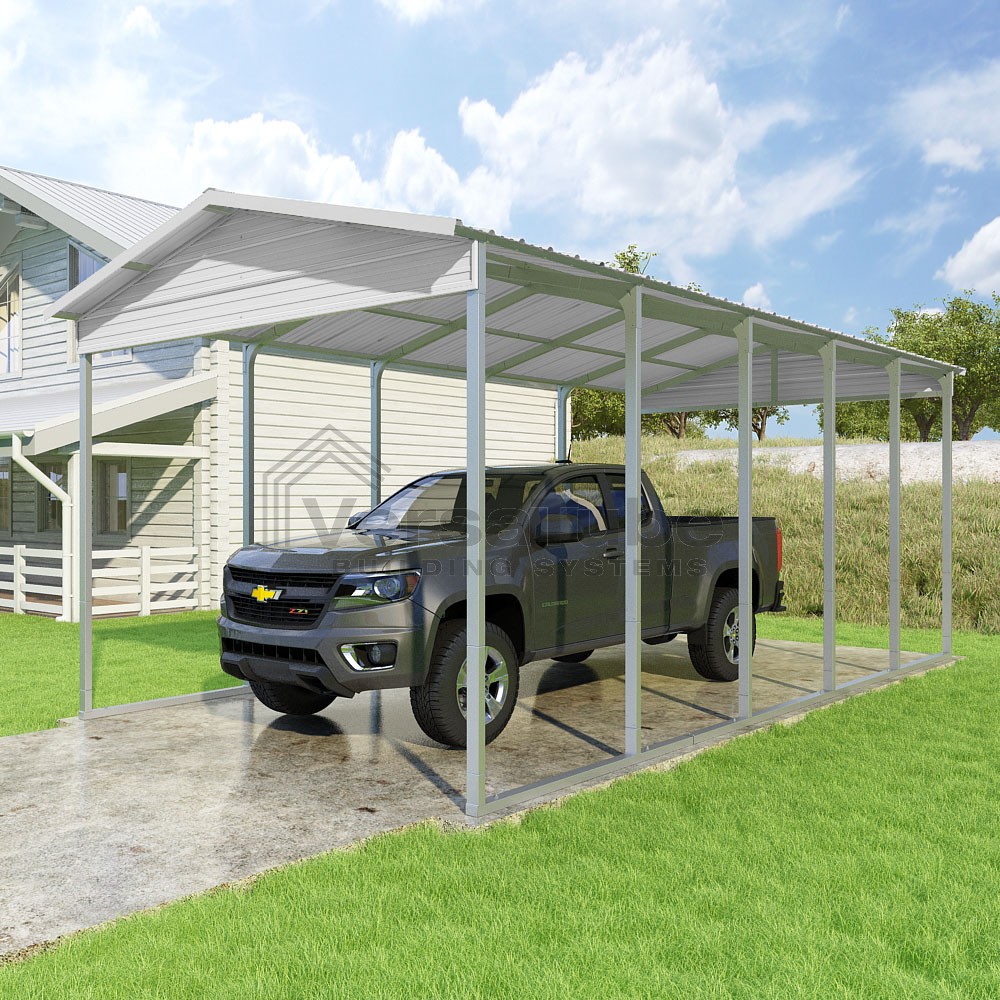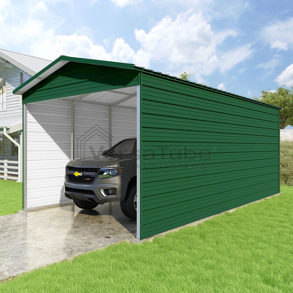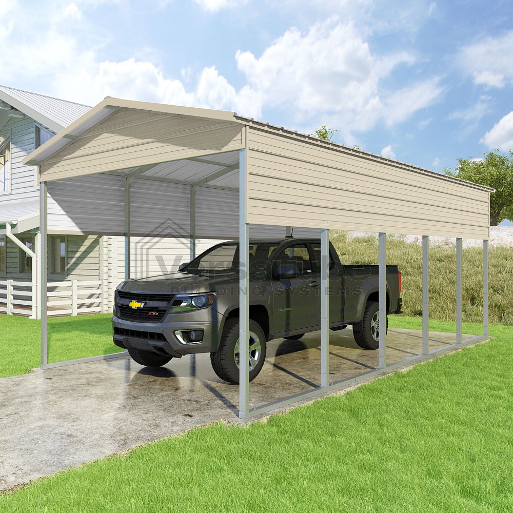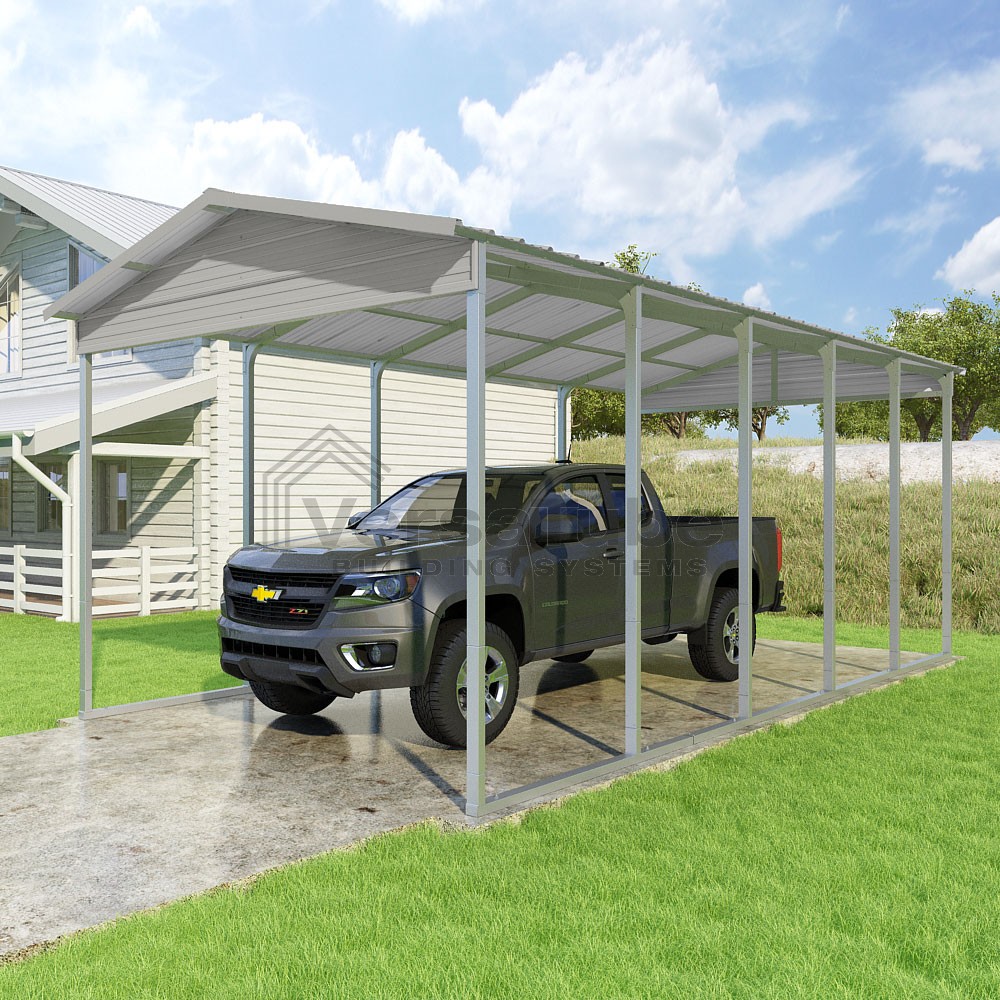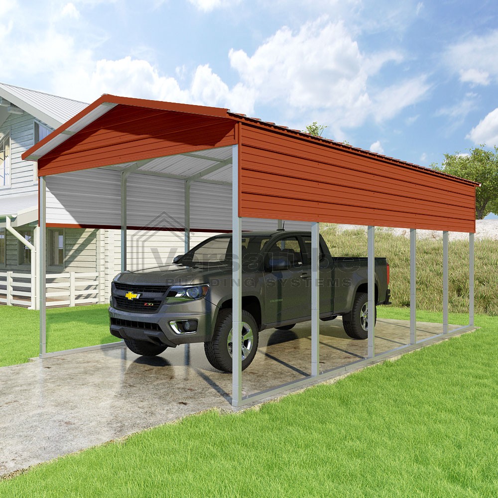 Pinnacle Series DIY carport kit features vertical sheet metal roof panels with ridge cap, gable and eave trim for an A-frame roof style and extended coverage on both ends.