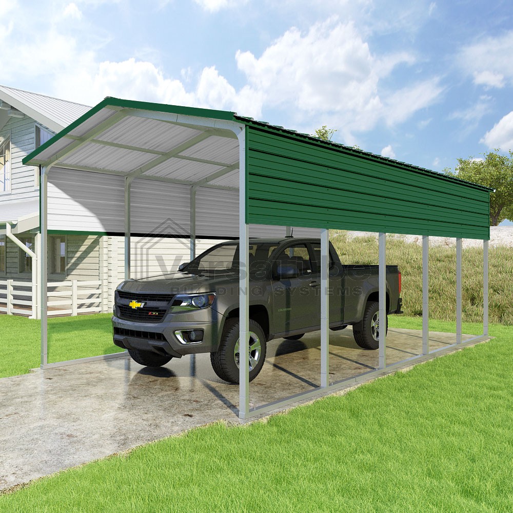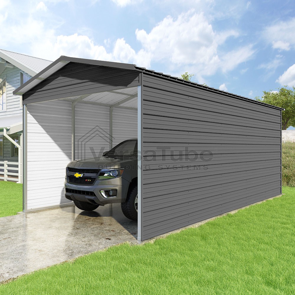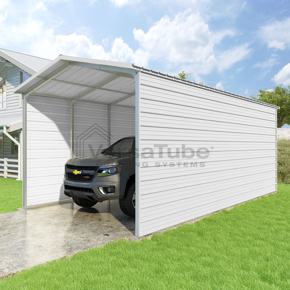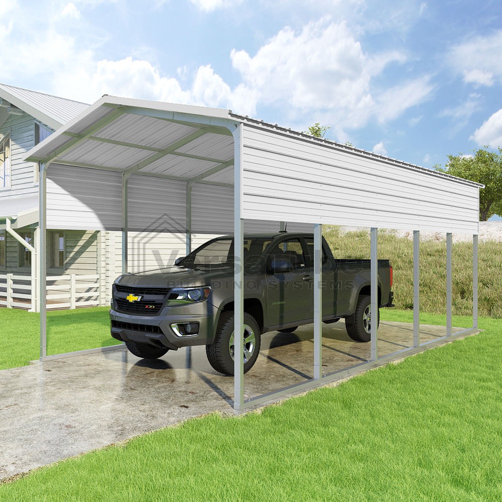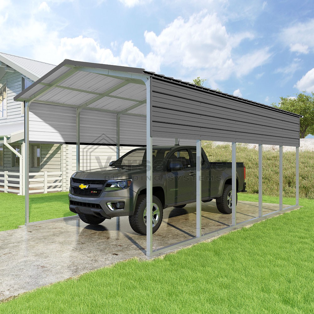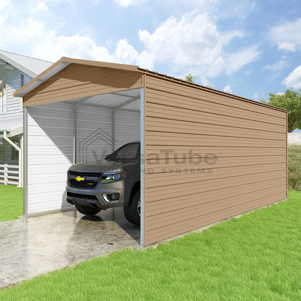 Pinnacle Series DIY carport kit features vertical sheet metal roof panels with ridge cap, gable and eave trim for an A-frame roof style and extended coverage on both ends.