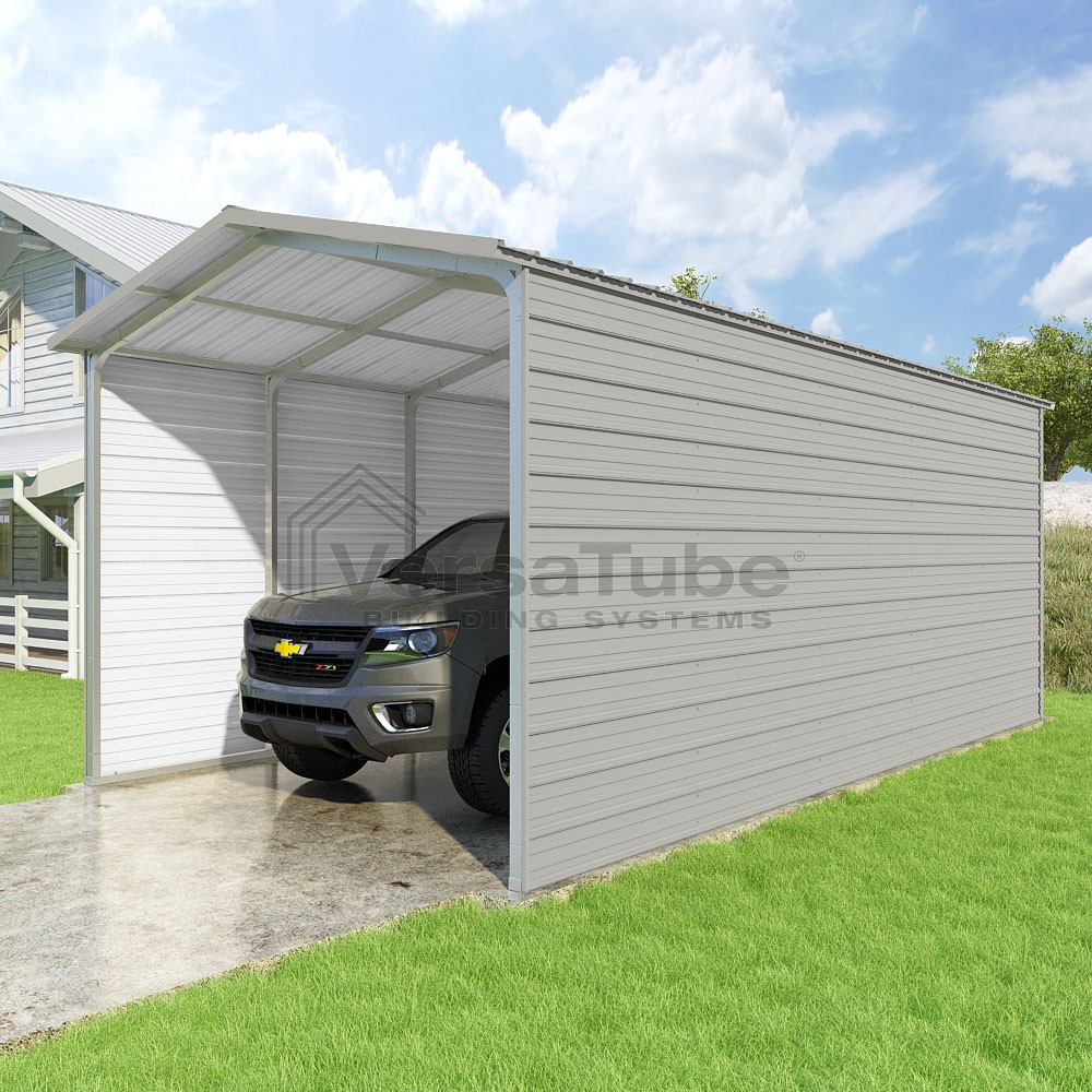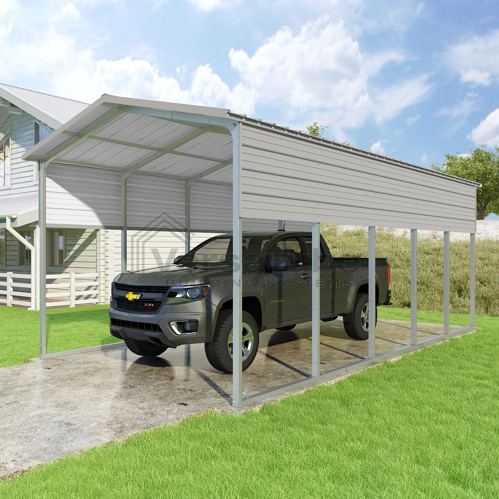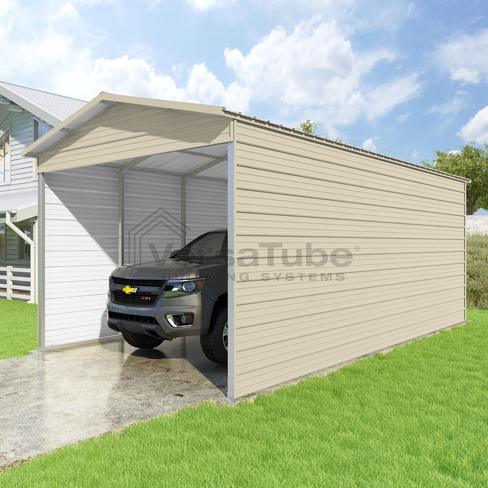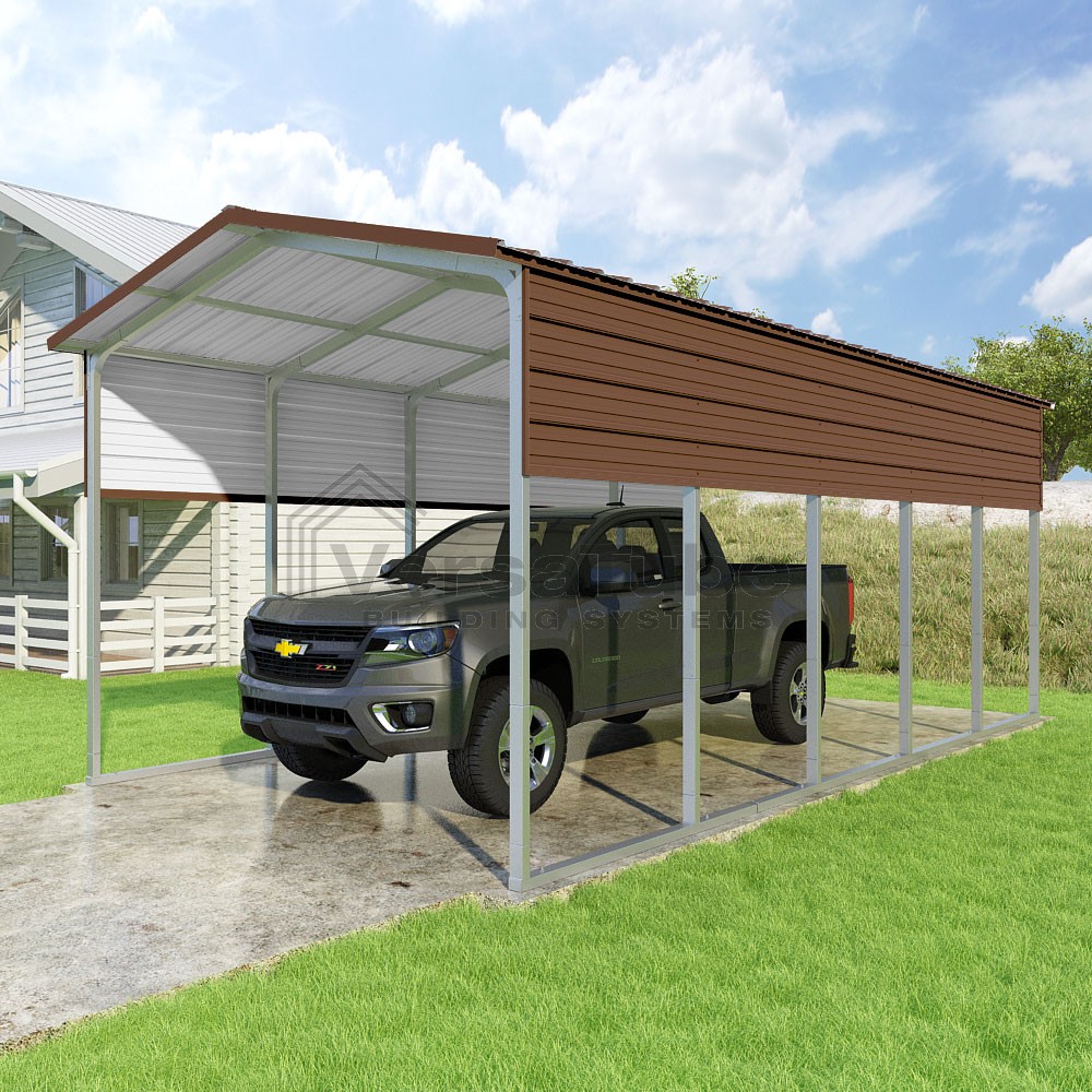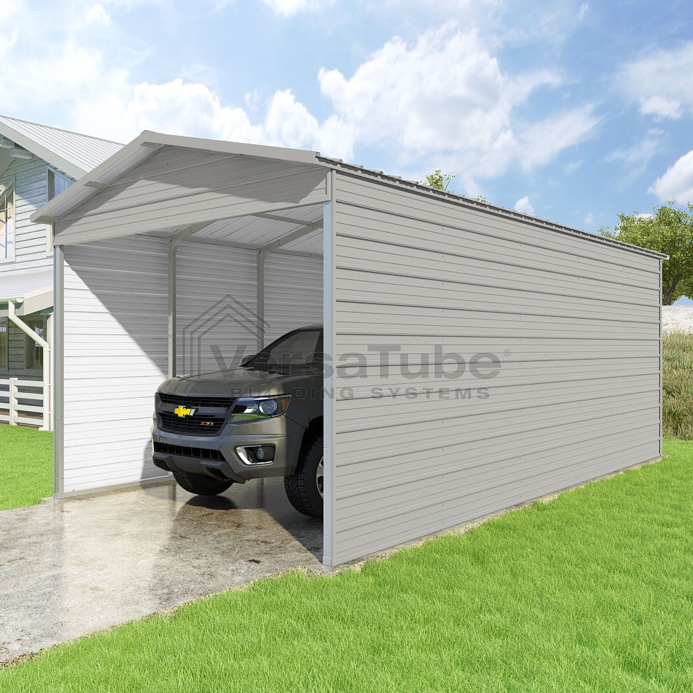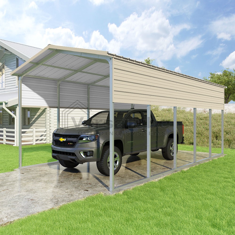 Pinnacle Series DIY carport kit features vertical sheet metal roof panels with ridge cap, gable and eave trim for an A-frame roof style and extended coverage on both ends.