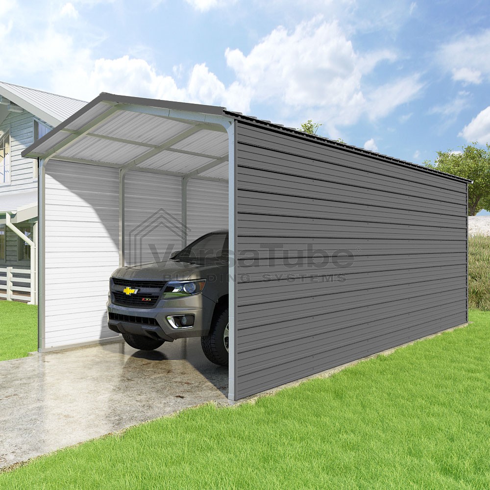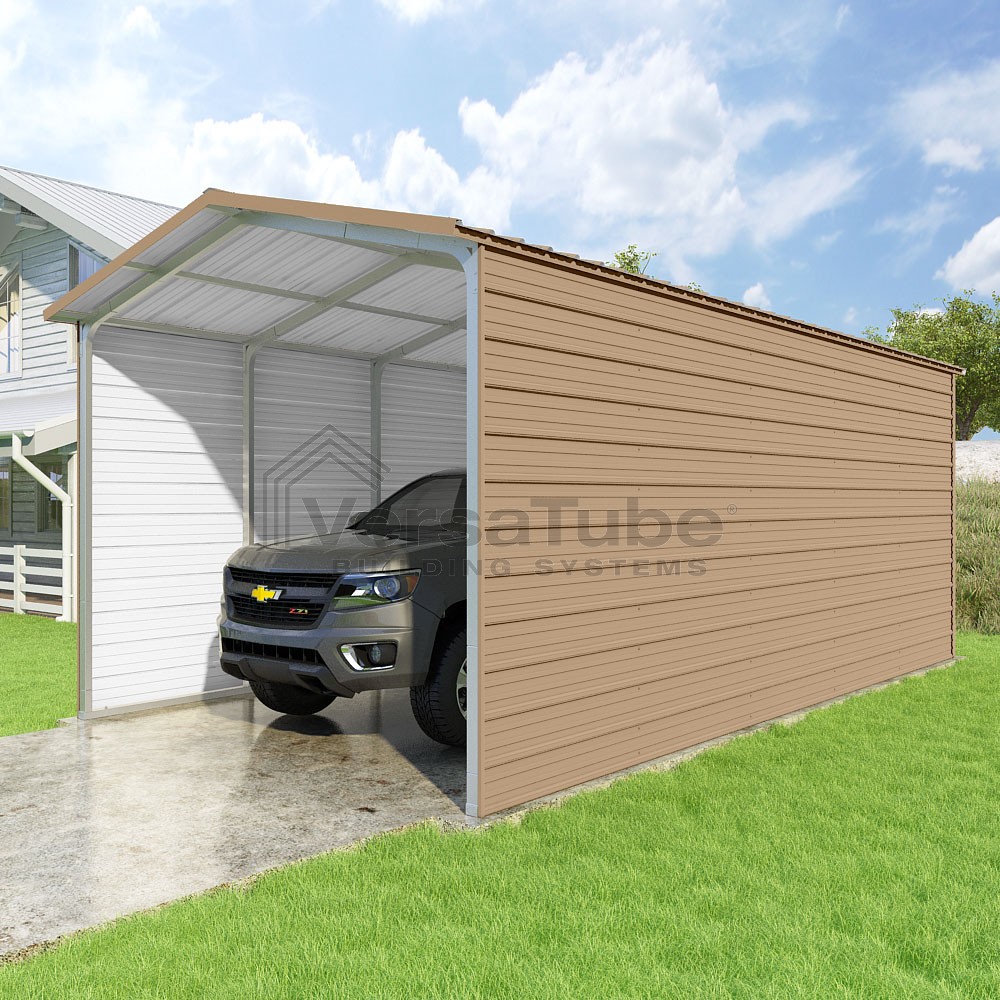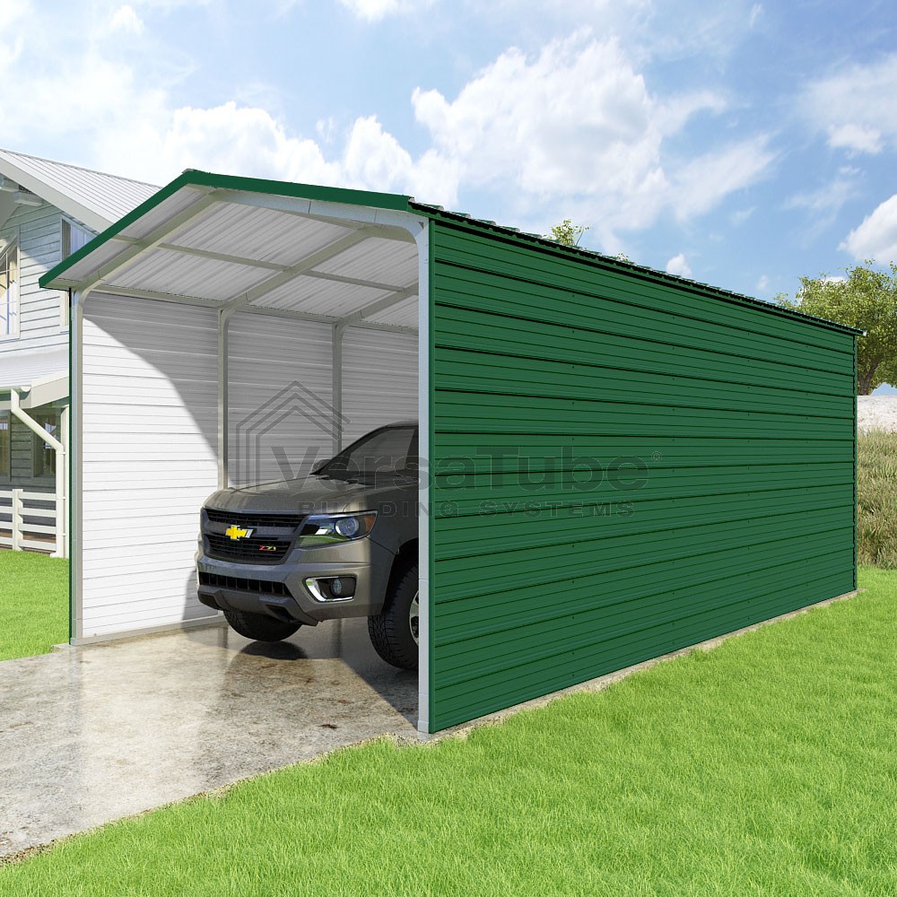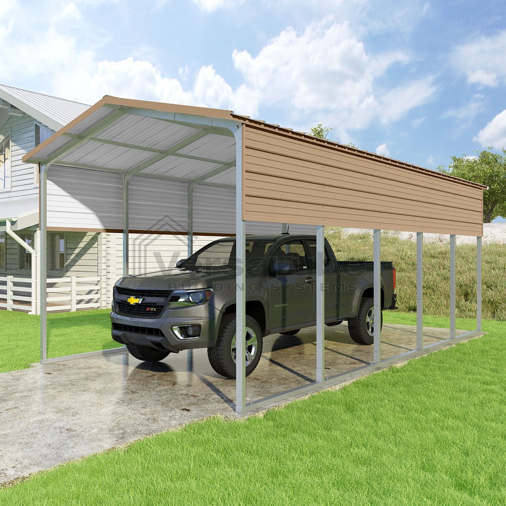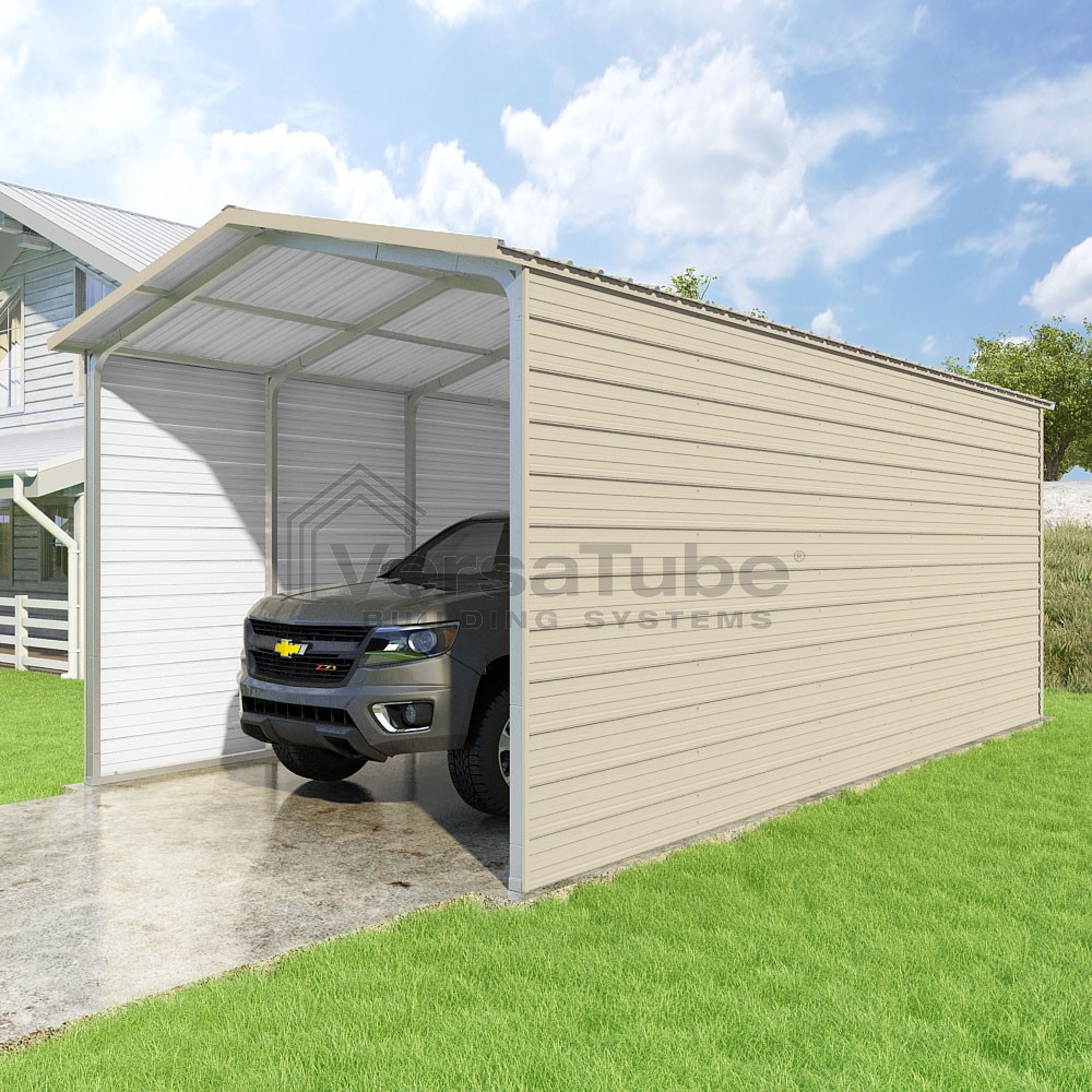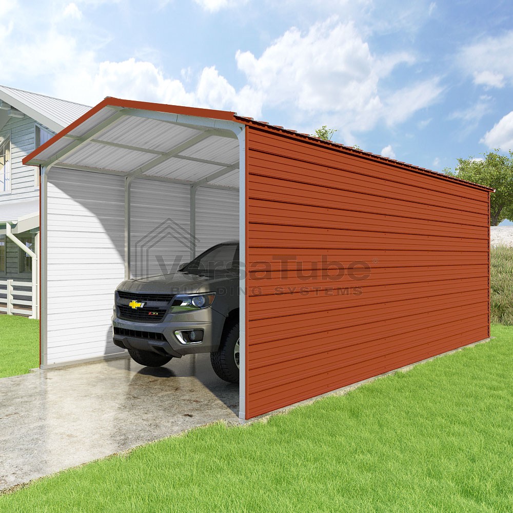 Pinnacle Series DIY carport kit features vertical sheet metal roof panels with ridge cap, gable and eave trim for an A-frame roof style and extended coverage on both ends.