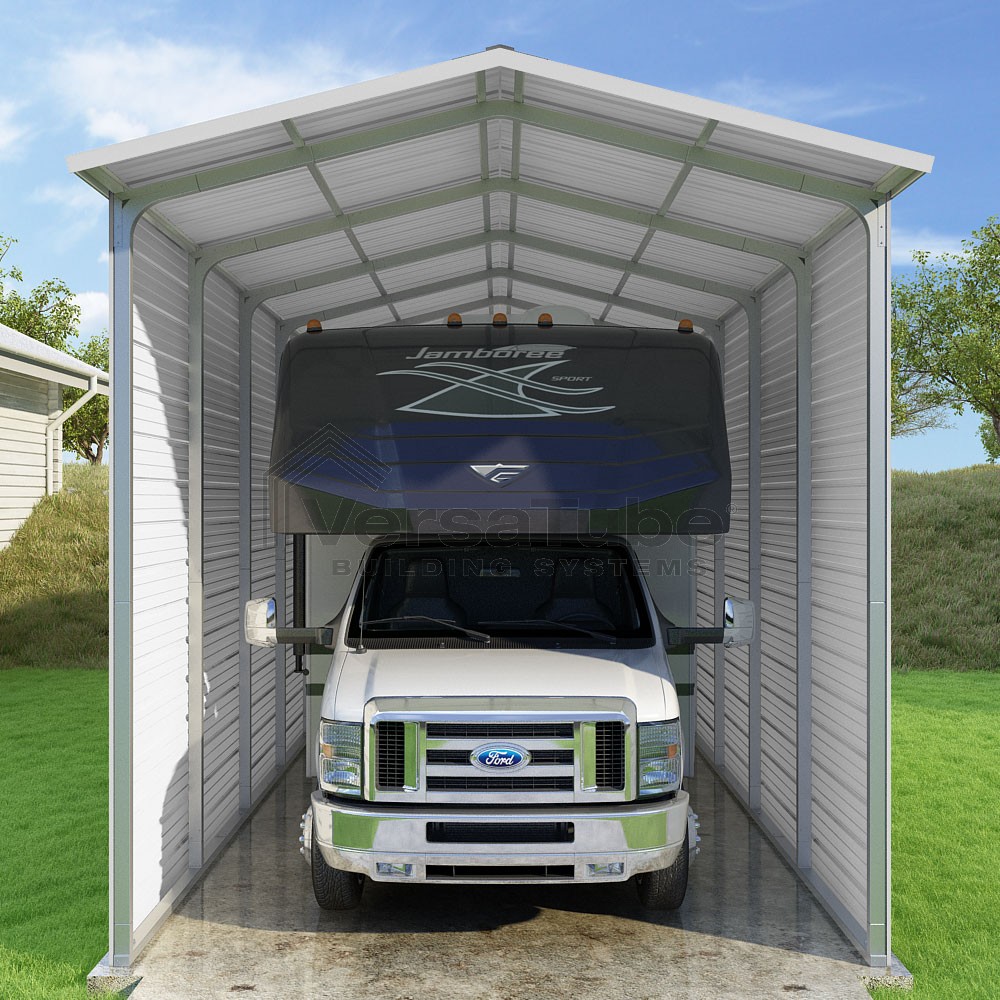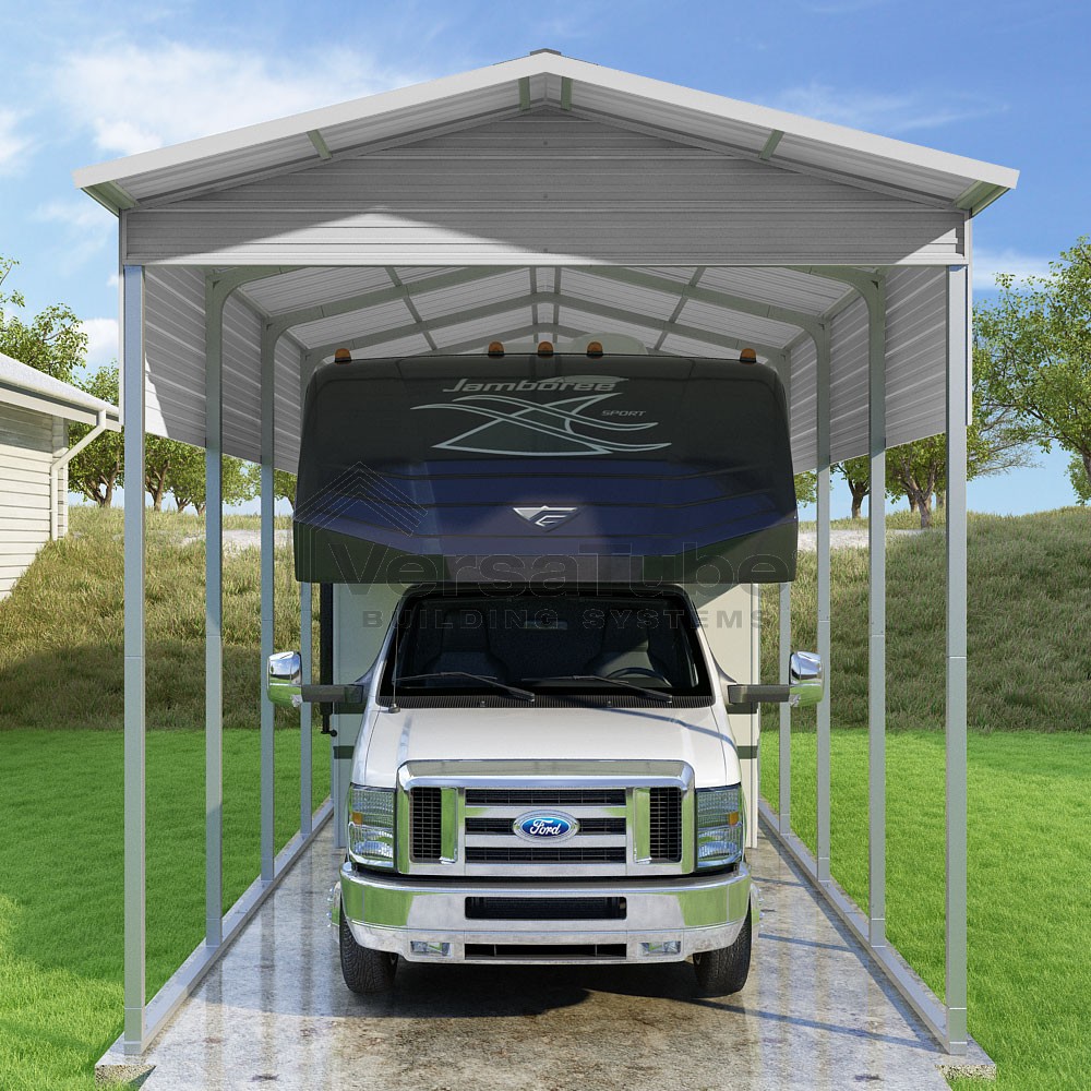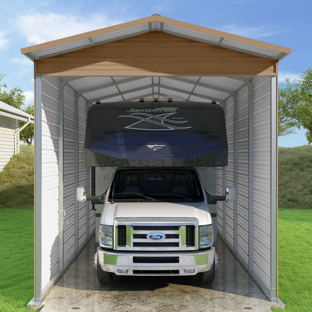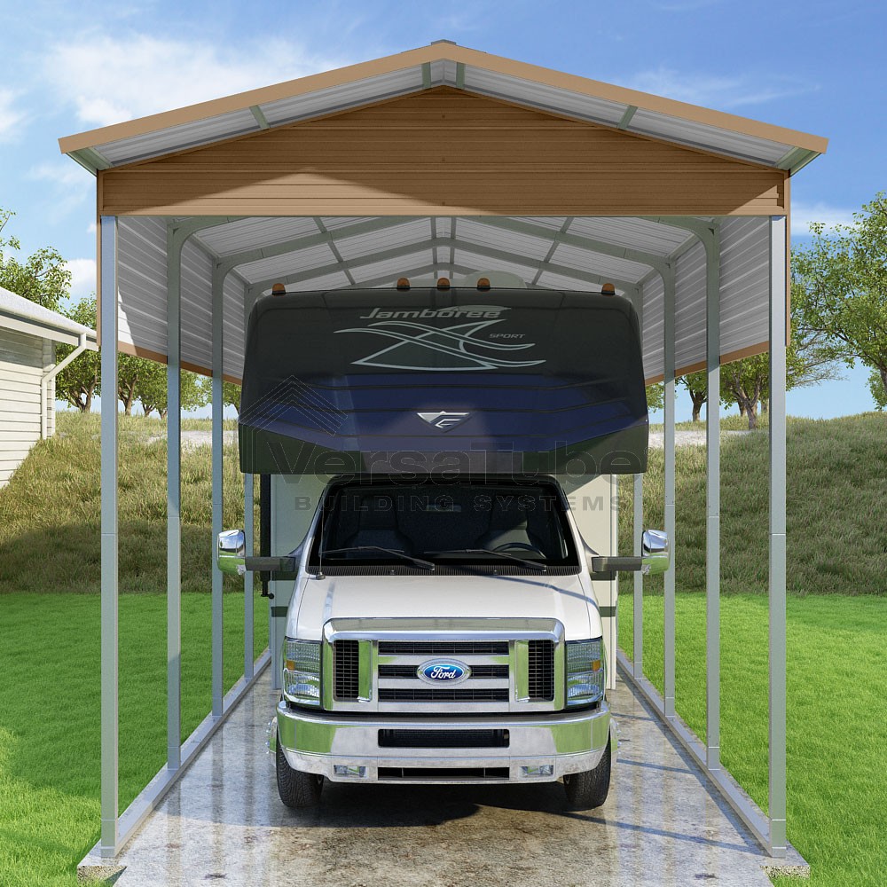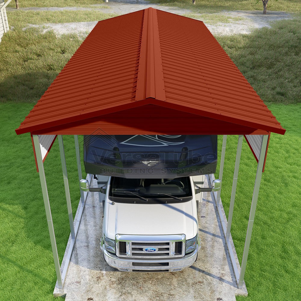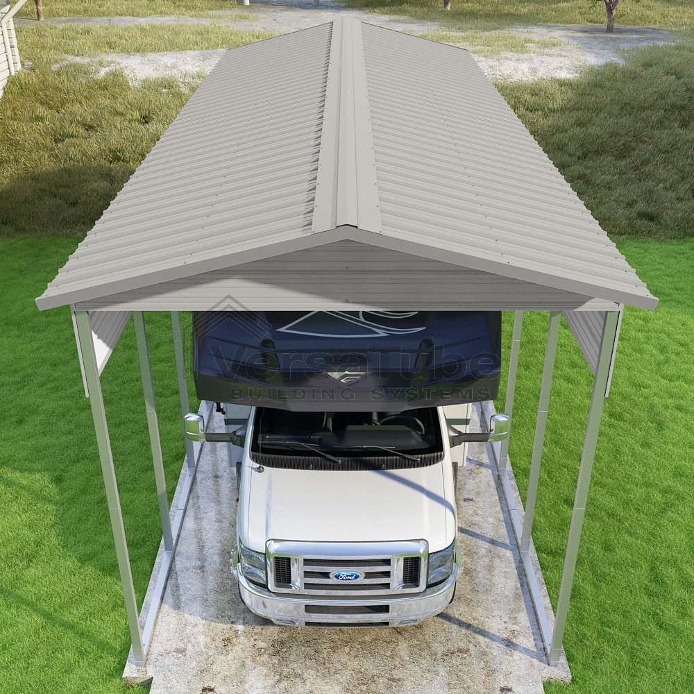 Pinnacle Series DIY carport kit features vertical sheet metal roof panels with ridge cap, gable and eave trim for an A-frame roof style and extended coverage on both ends.
