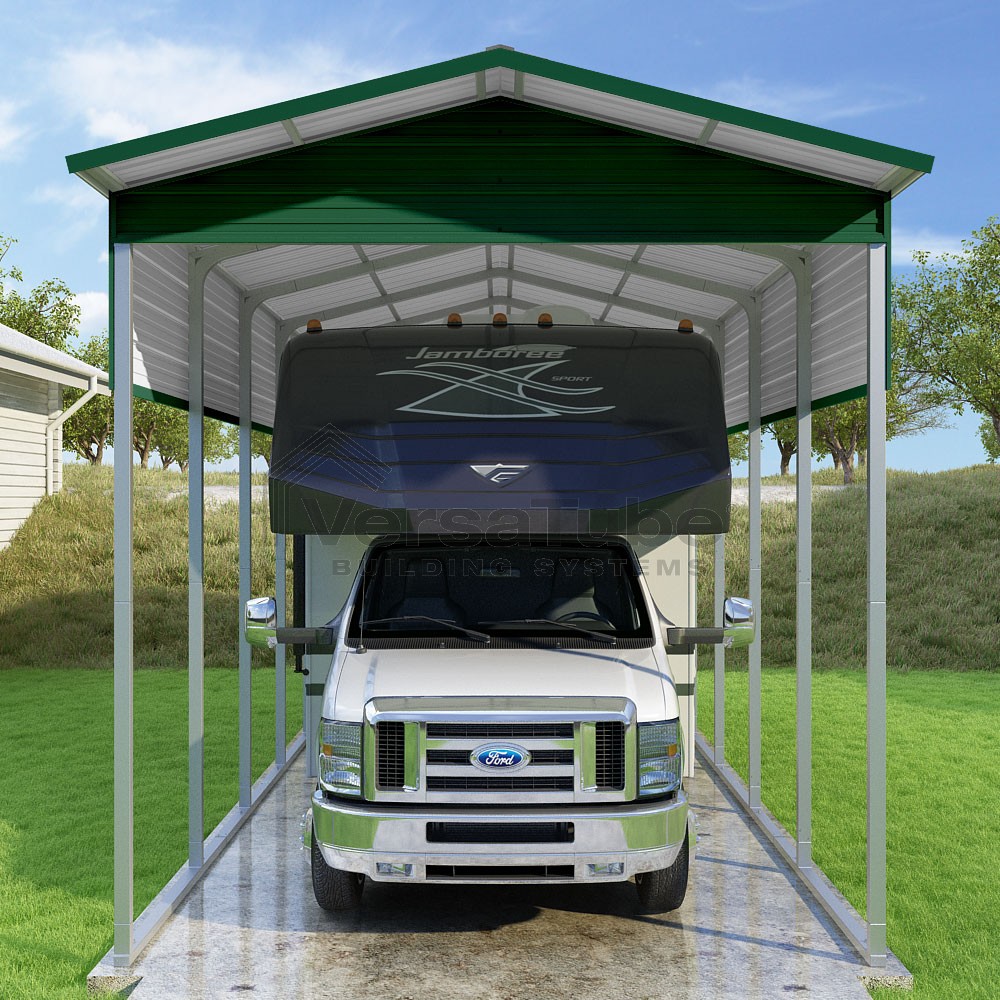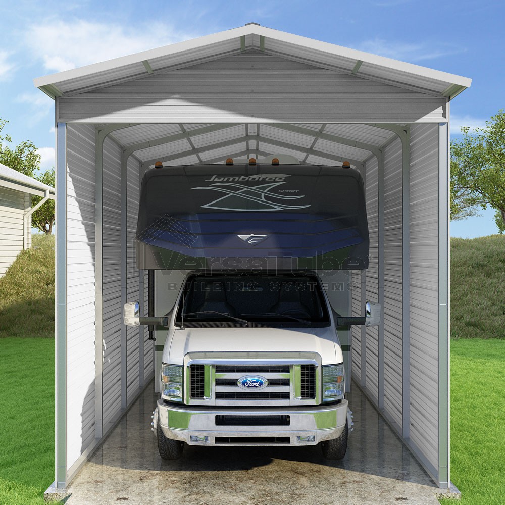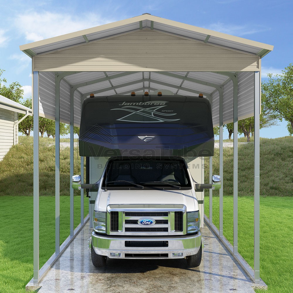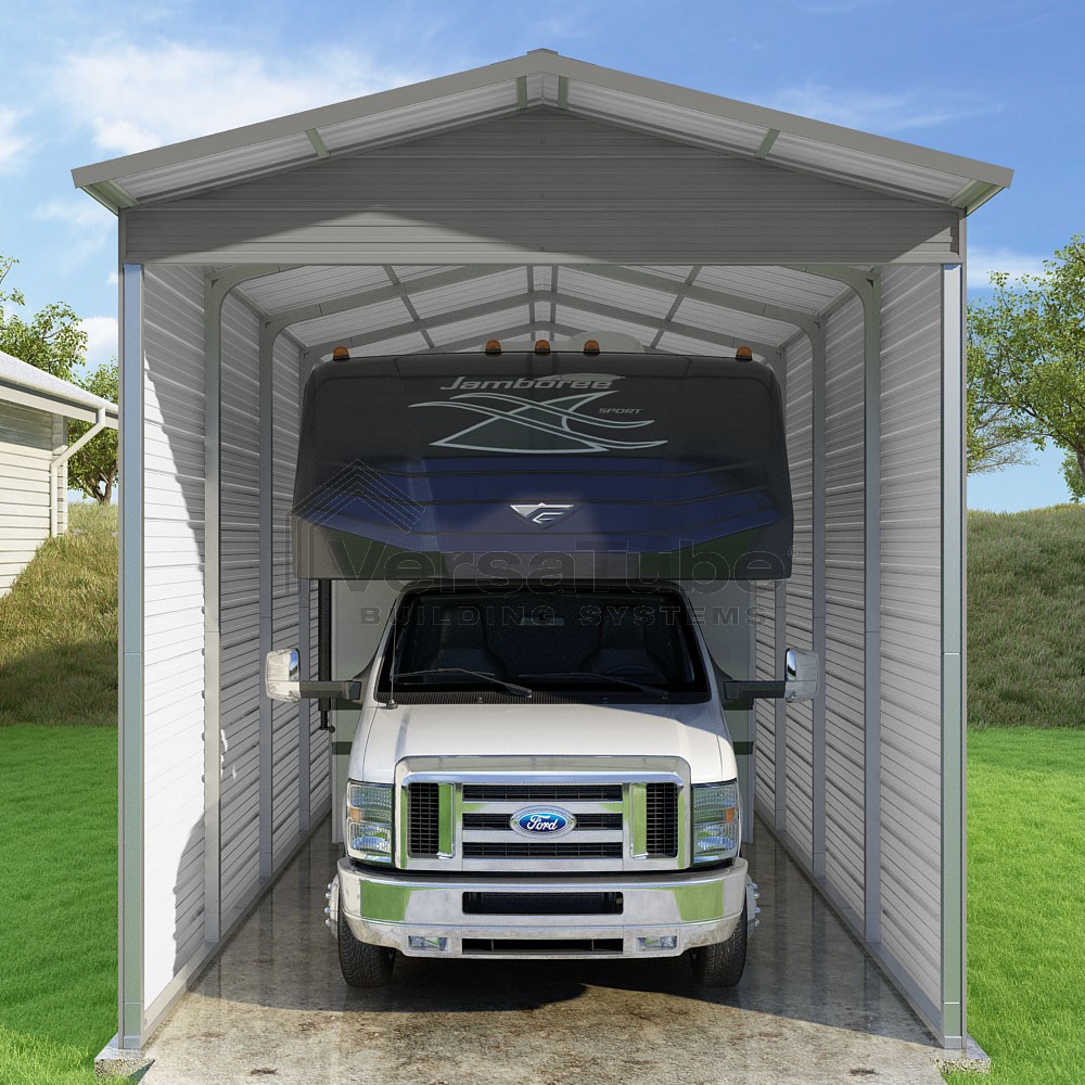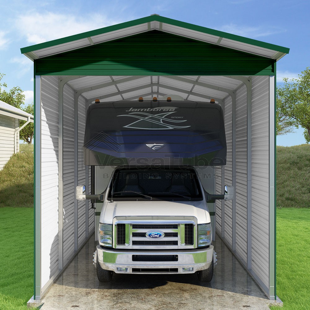 Pinnacle Series DIY carport kit features vertical sheet metal roof panels with ridge cap, gable and eave trim for an A-frame roof style and extended coverage on both ends.