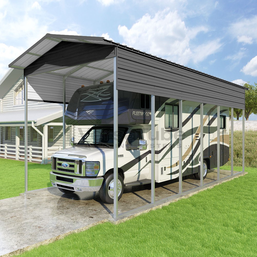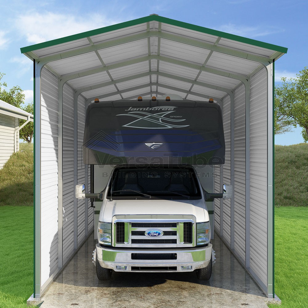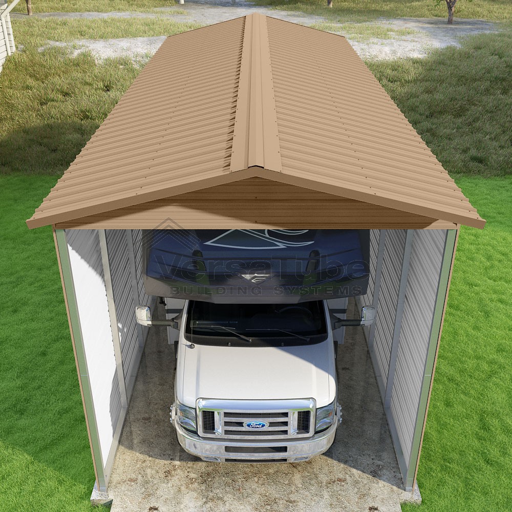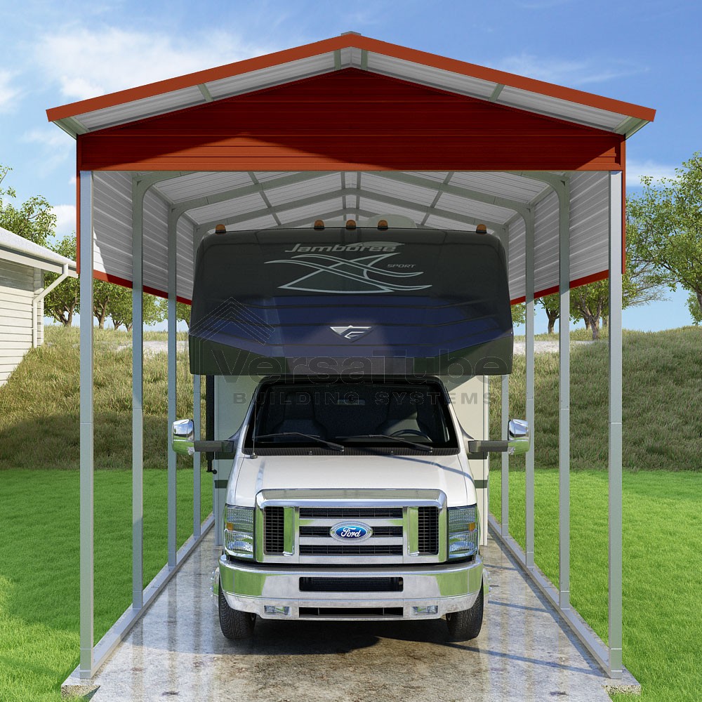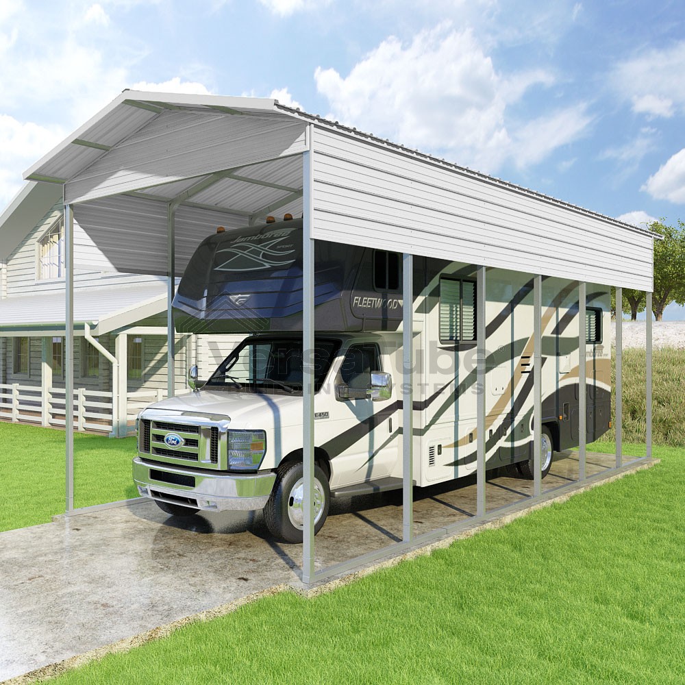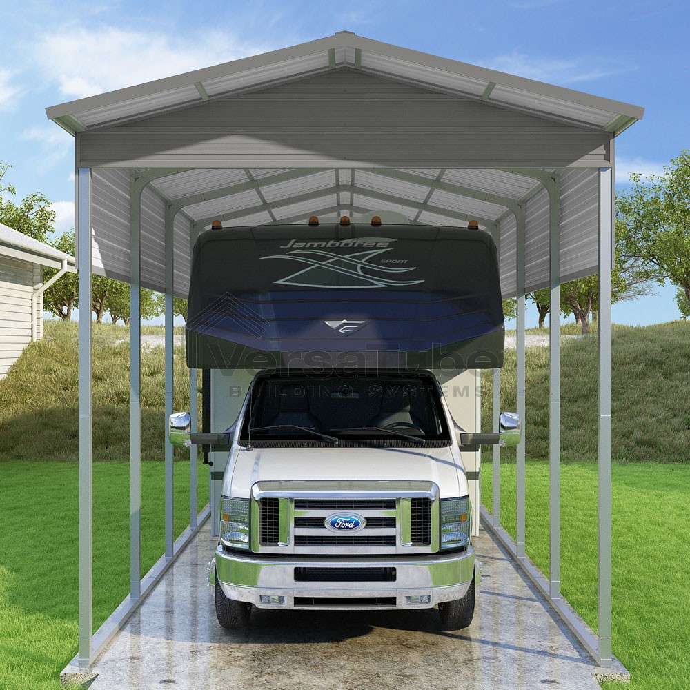 Pinnacle Series DIY carport kit features vertical sheet metal roof panels with ridge cap, gable and eave trim for an A-frame roof style and extended coverage on both ends.
