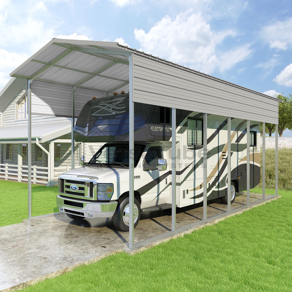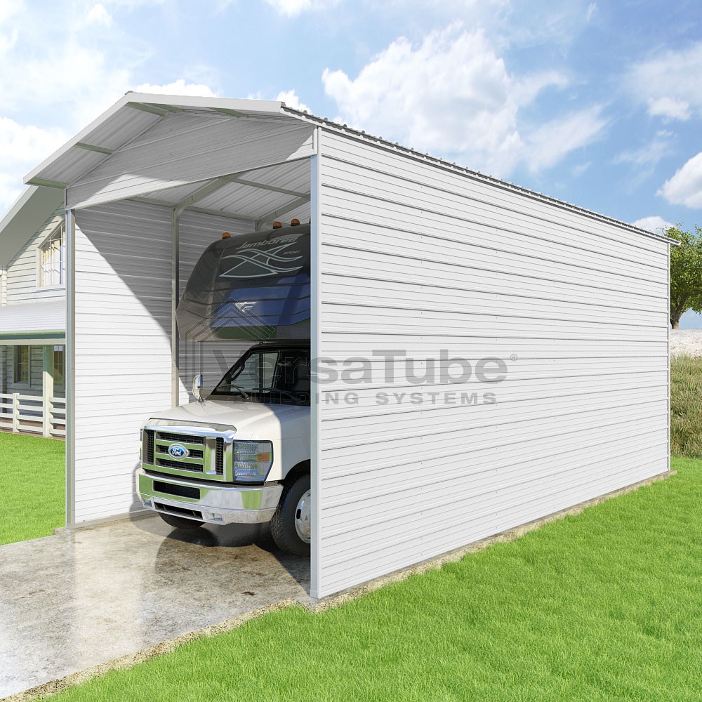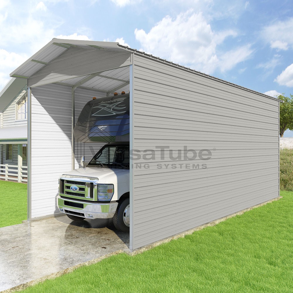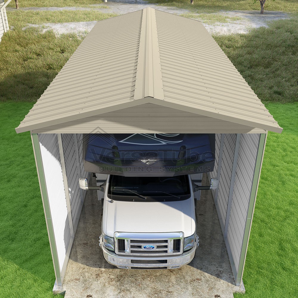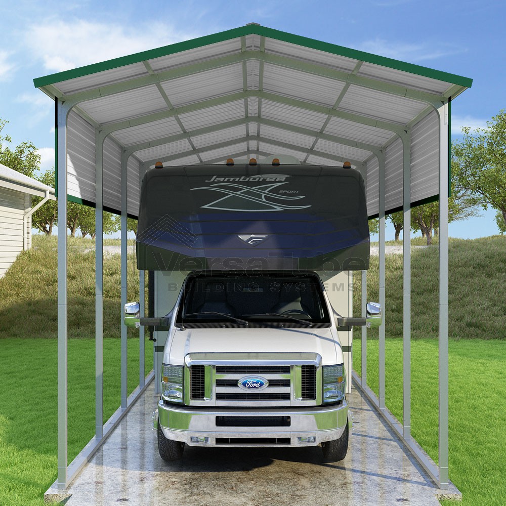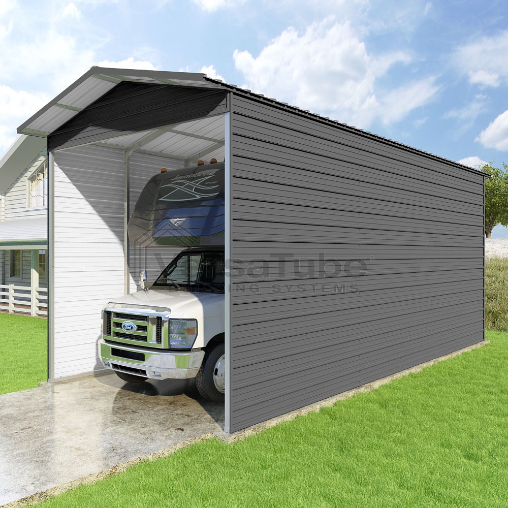 Pinnacle Series DIY carport kit features vertical sheet metal roof panels with ridge cap, gable and eave trim for an A-frame roof style and extended coverage on both ends.