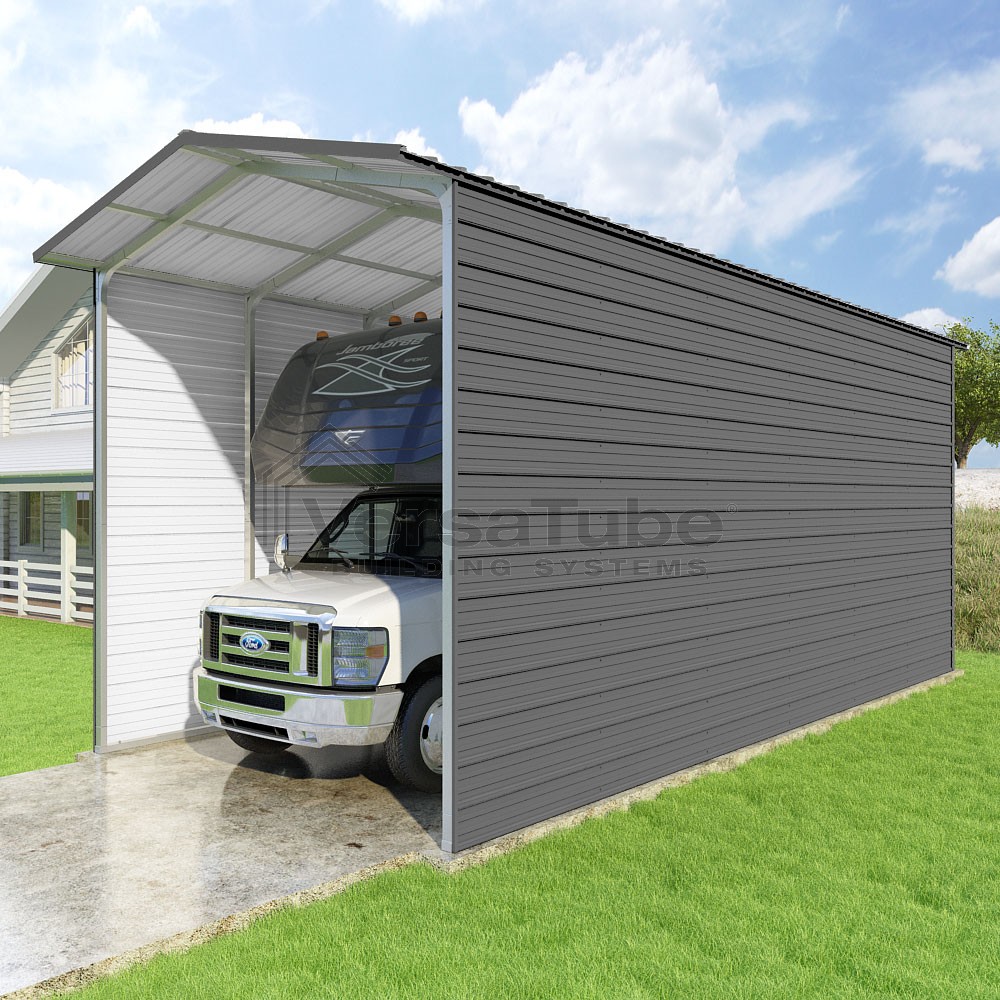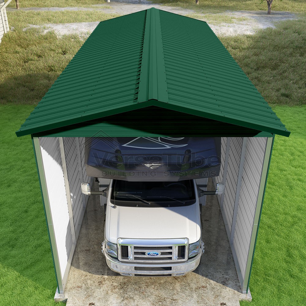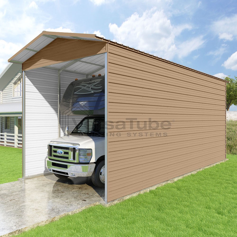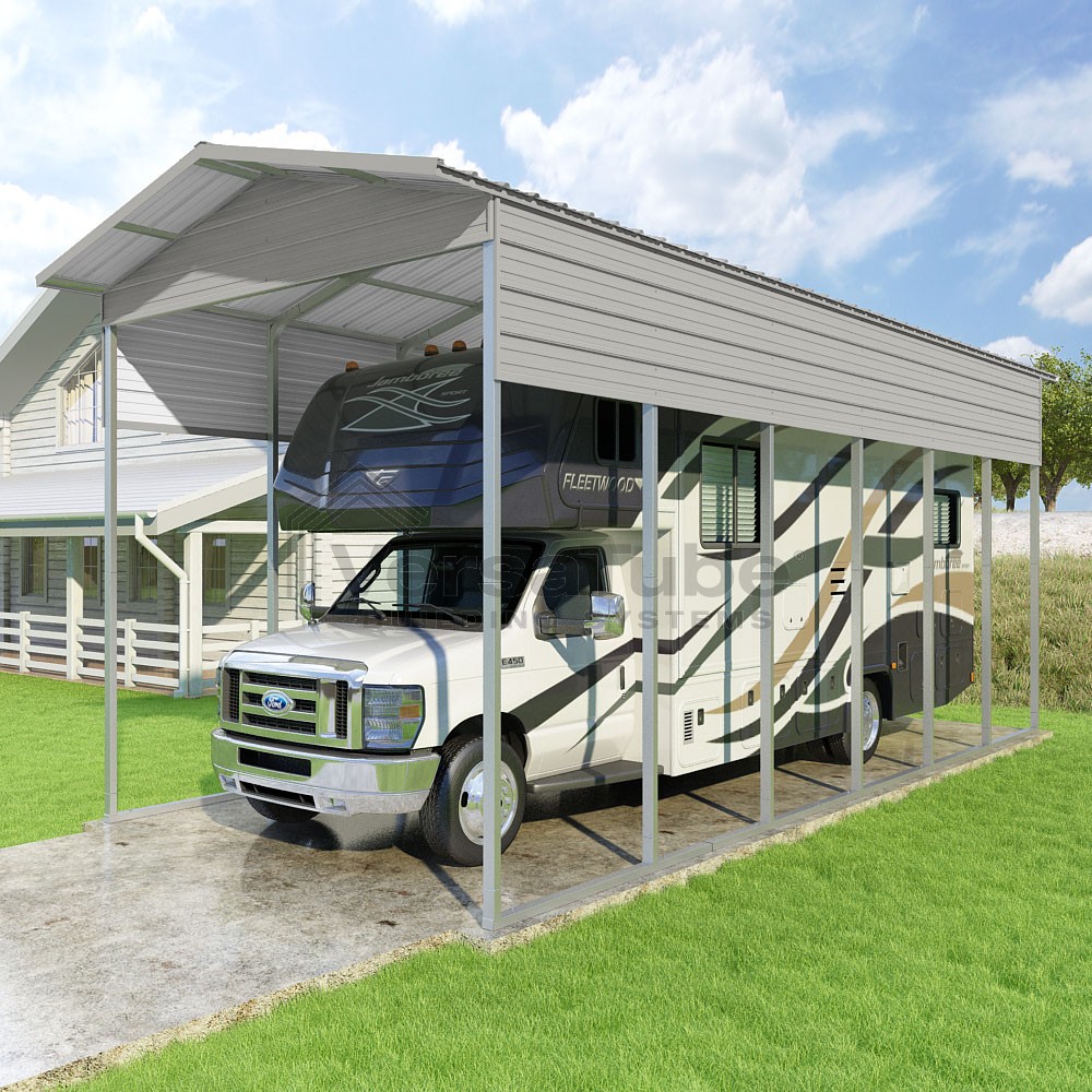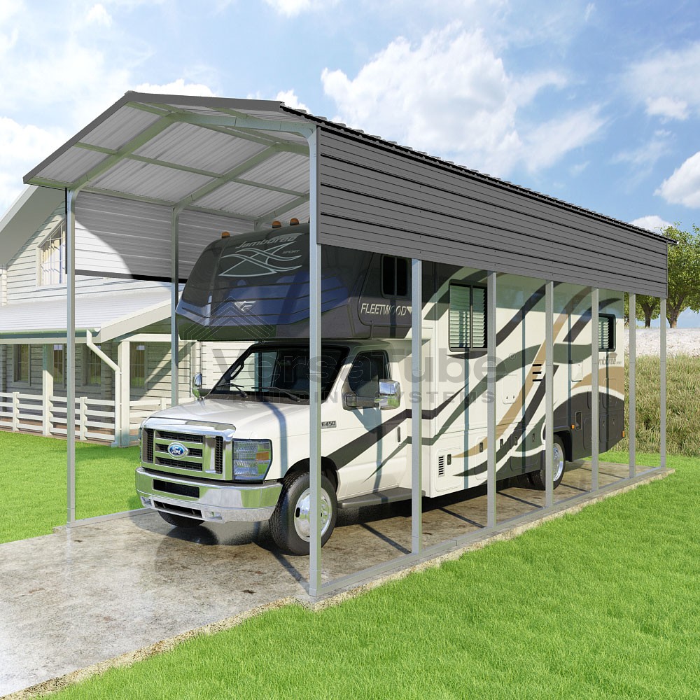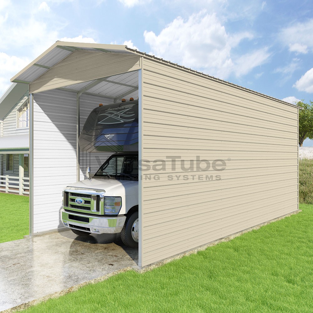 Pinnacle Series DIY carport kit features vertical sheet metal roof panels with ridge cap, gable and eave trim for an A-frame roof style and extended coverage on both ends.