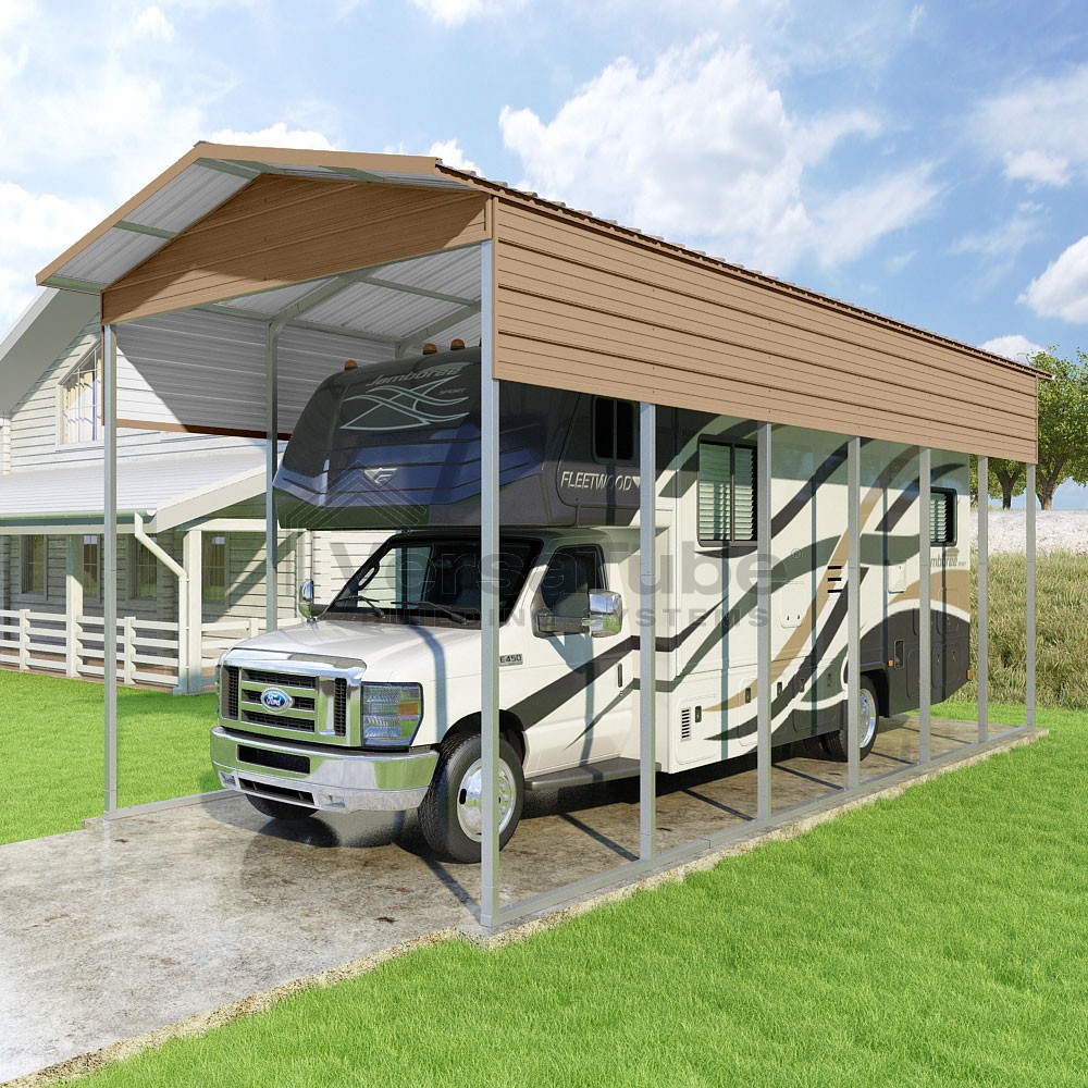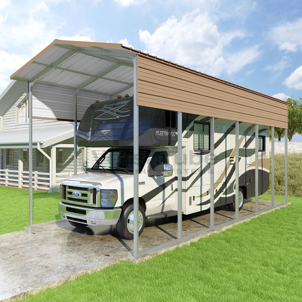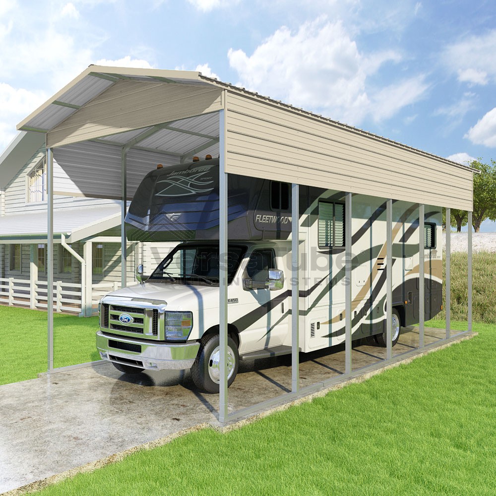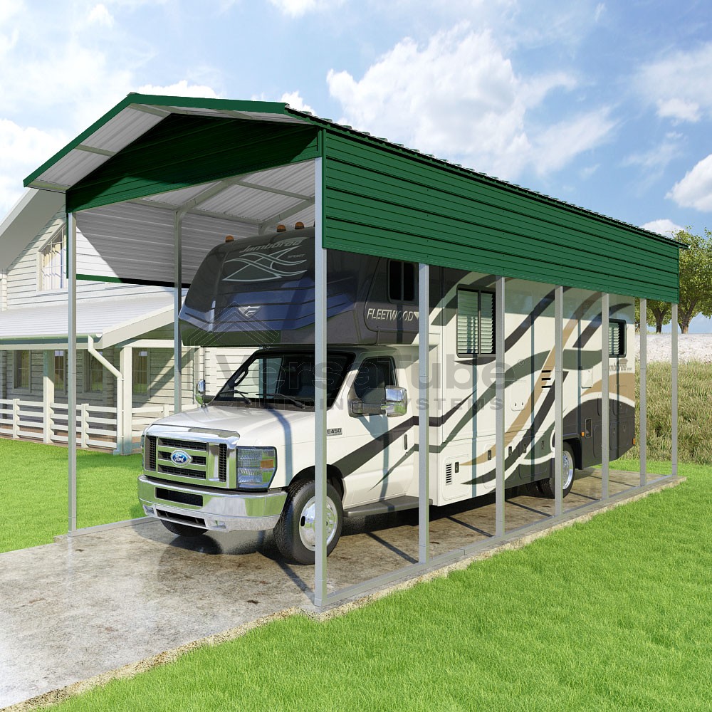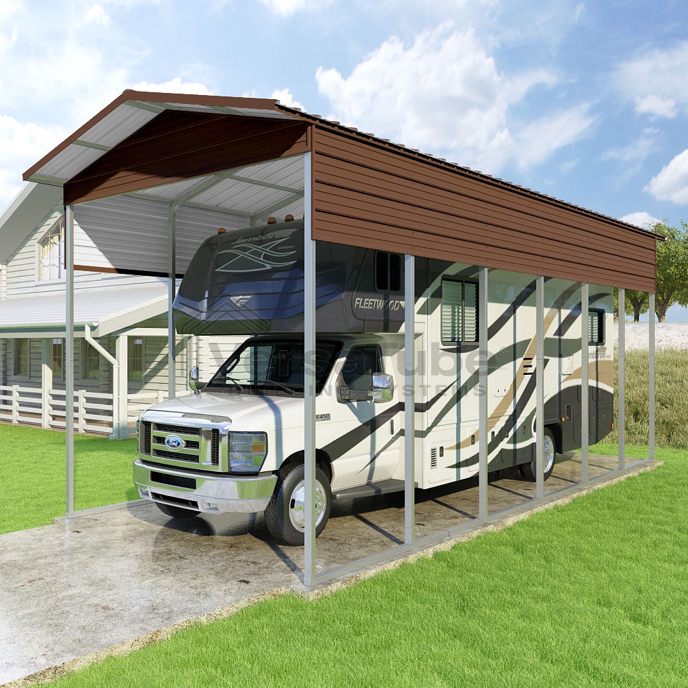 Pinnacle Series DIY carport kit features vertical sheet metal roof panels with ridge cap, gable and eave trim for an A-frame roof style and extended coverage on both ends.