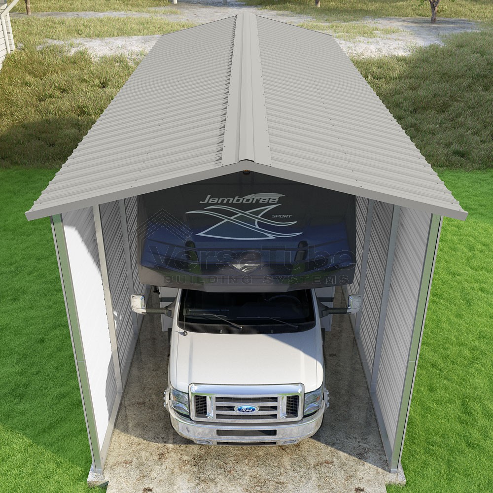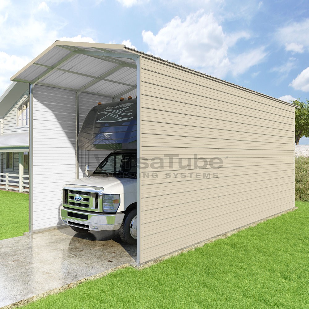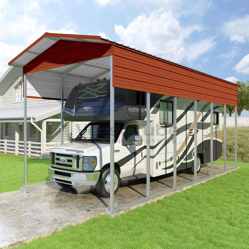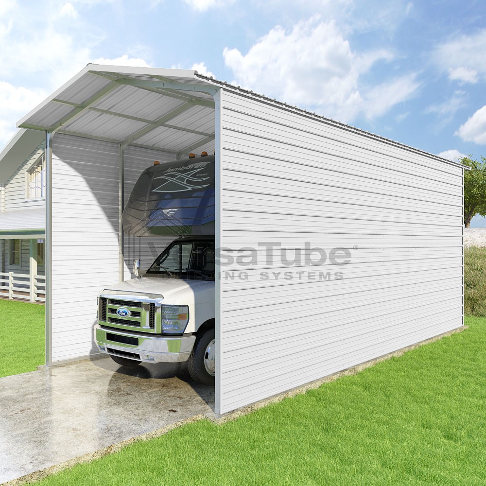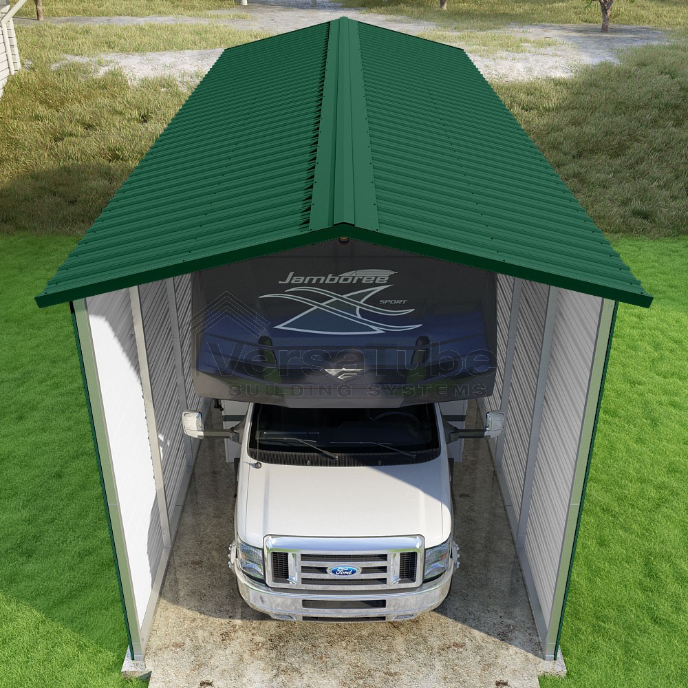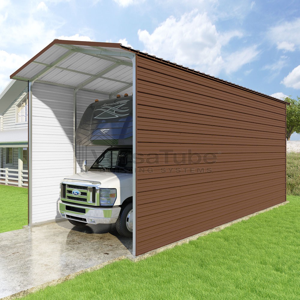 Pinnacle Series DIY carport kit features vertical sheet metal roof panels with ridge cap, gable and eave trim for an A-frame roof style and extended coverage on both ends.