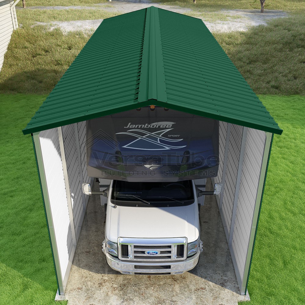 Pinnacle Series DIY carport kit features vertical sheet metal roof panels with ridge cap, gable and eave trim for an A-frame roof style and extended coverage on both ends.