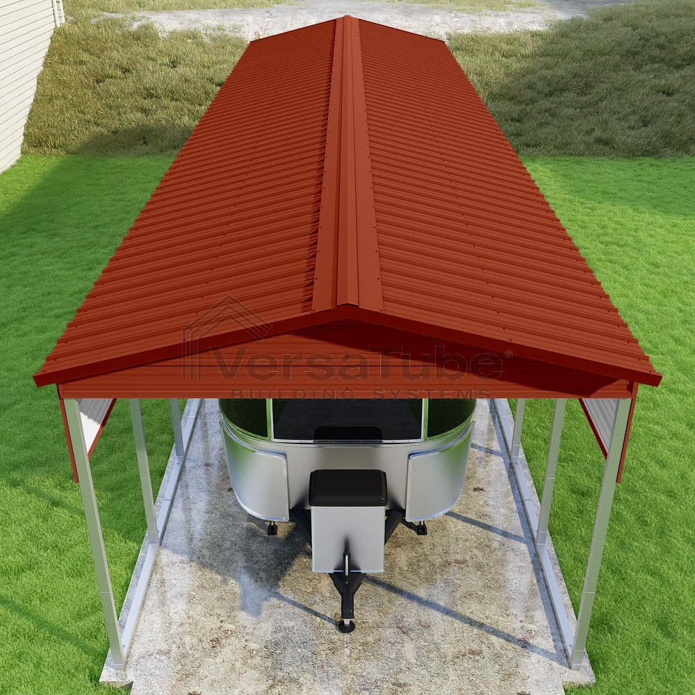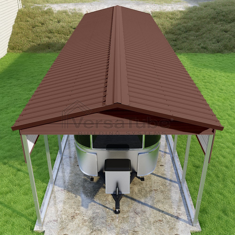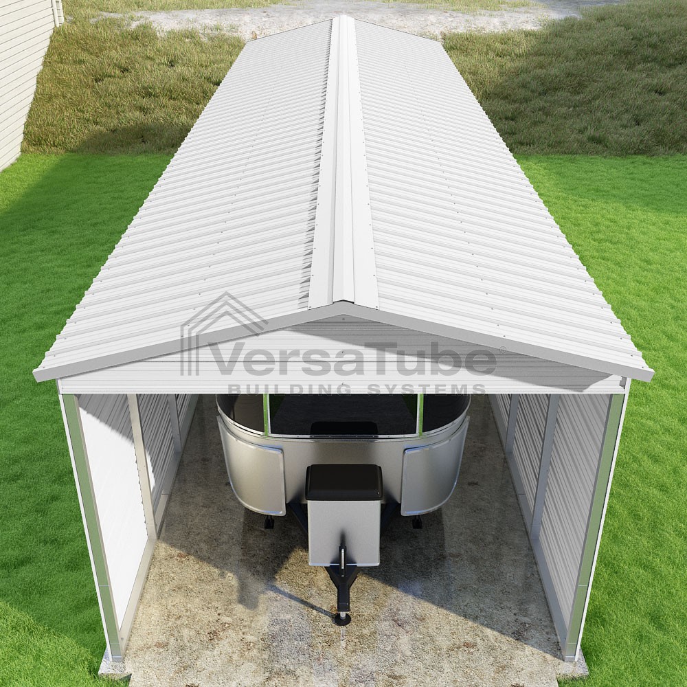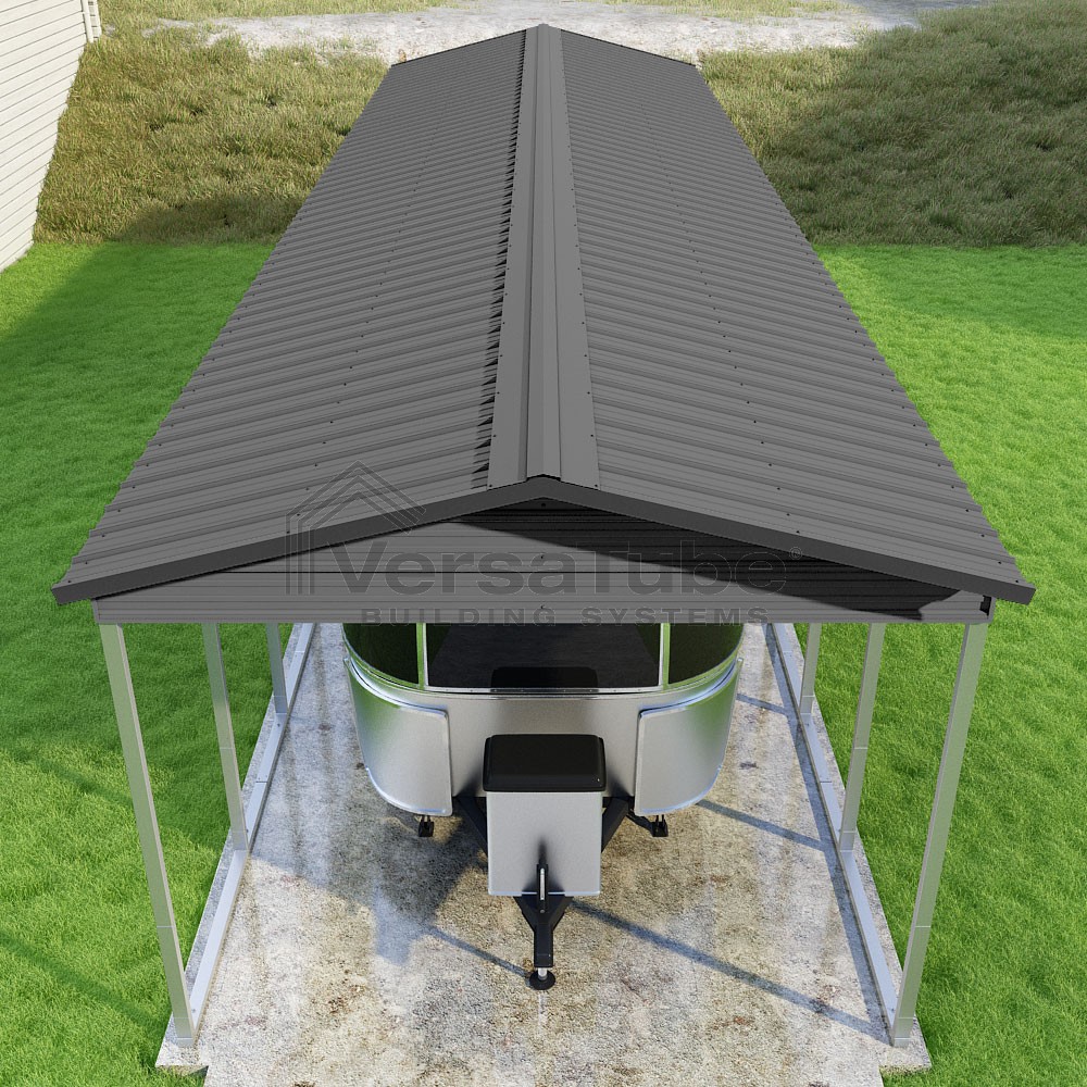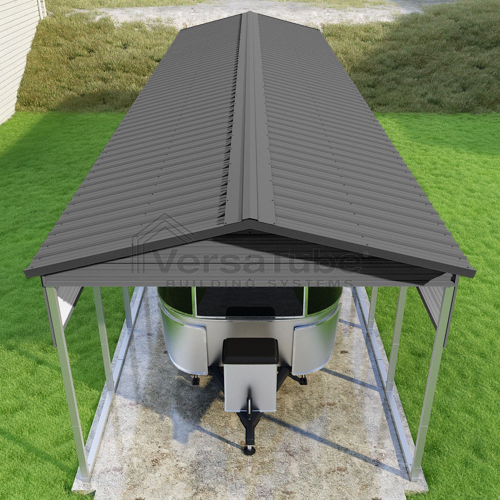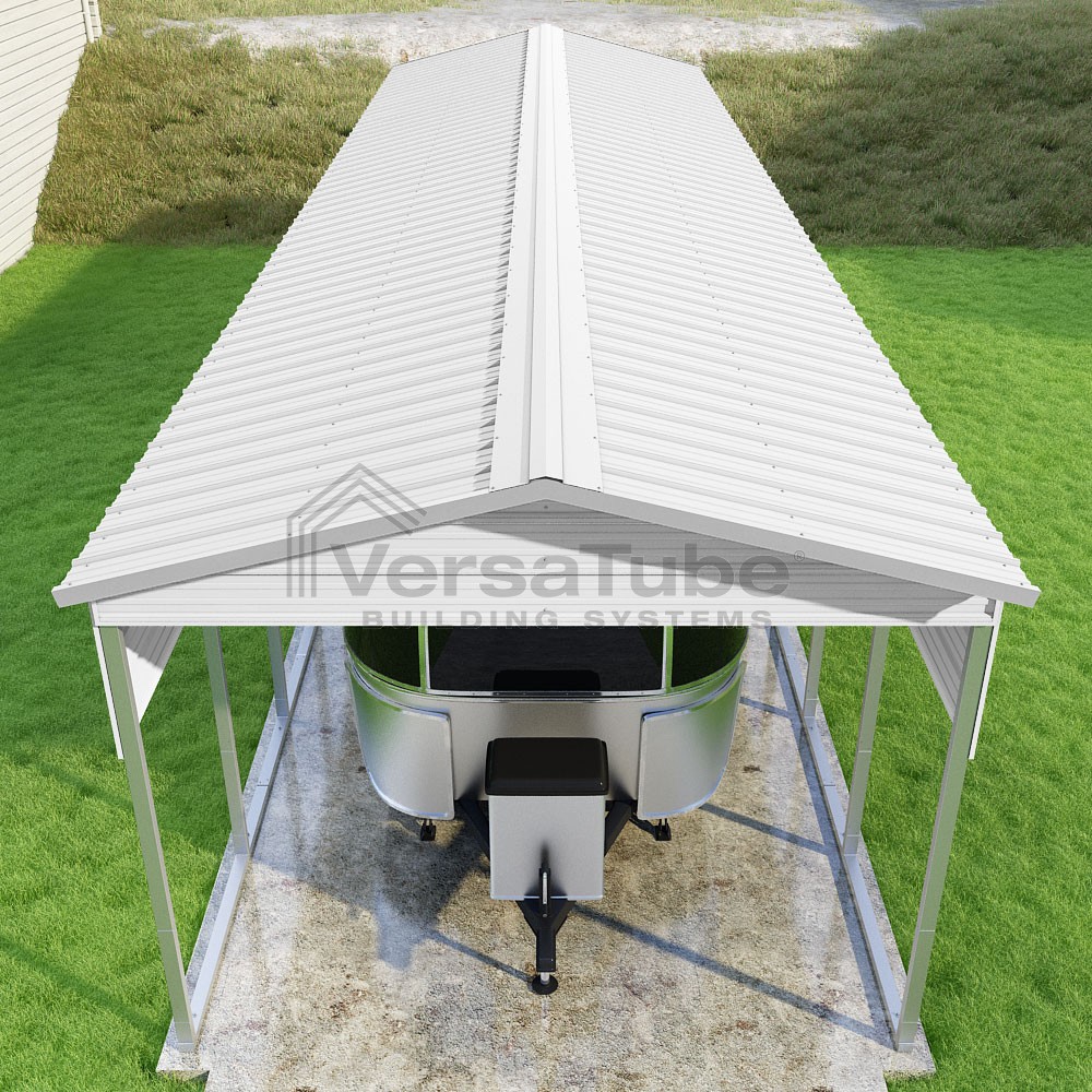 Pinnacle Series DIY carport kit features vertical sheet metal roof panels with ridge cap, gable and eave trim for an A-frame roof style and extended coverage on both ends.