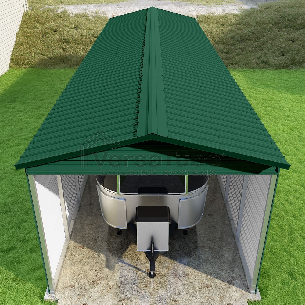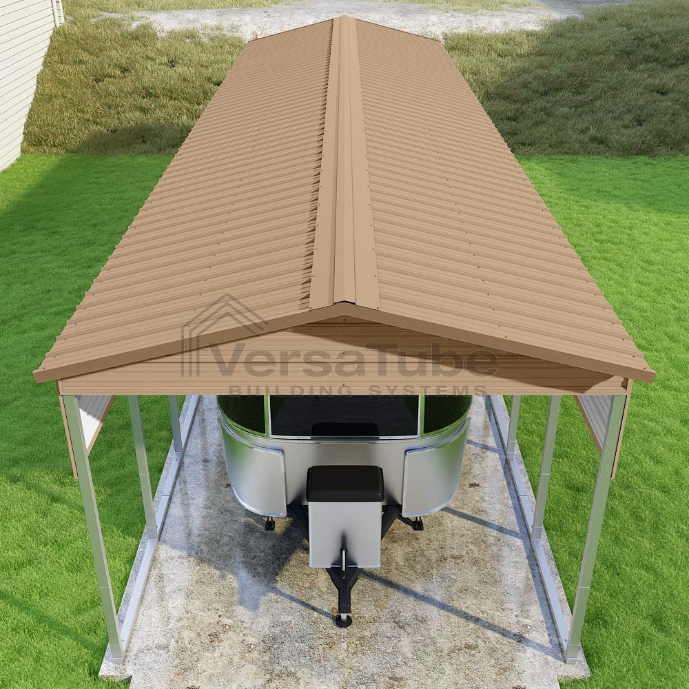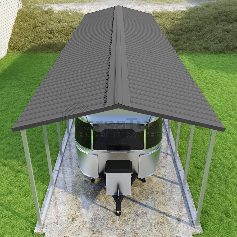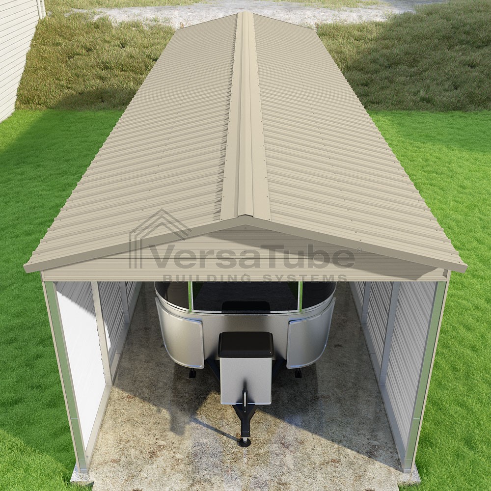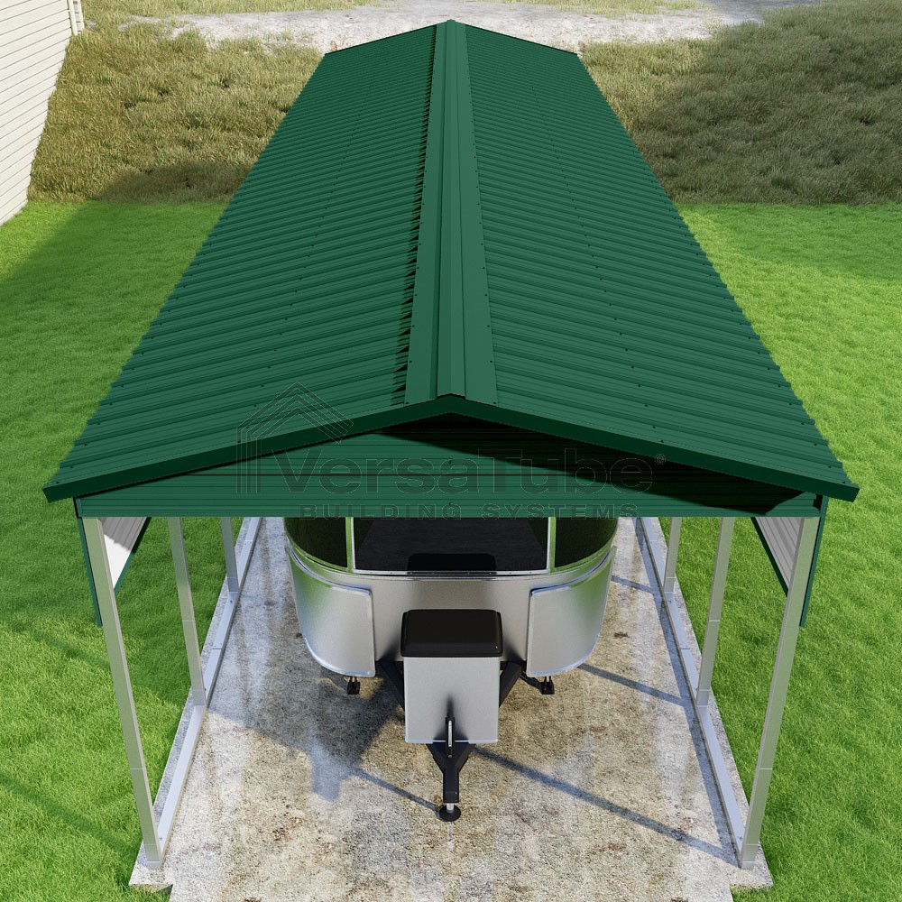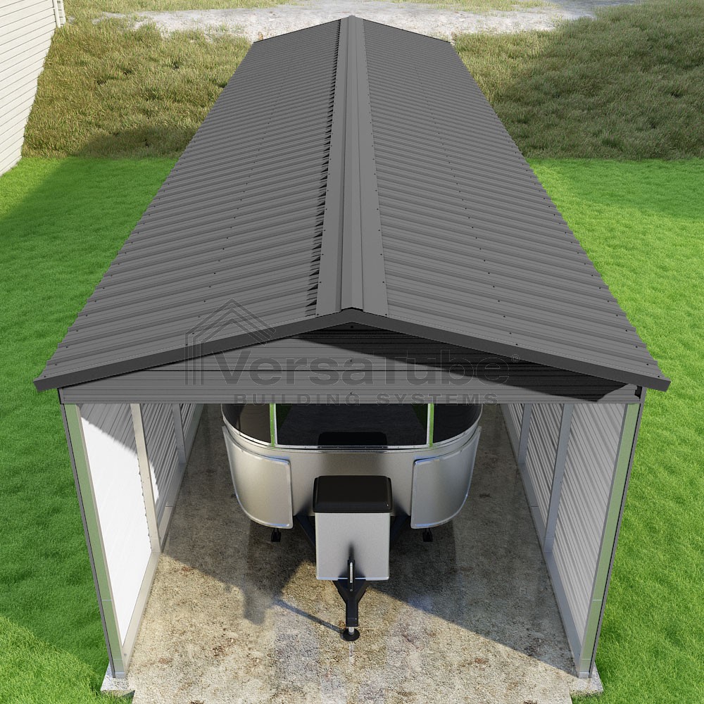 Pinnacle Series DIY carport kit features vertical sheet metal roof panels with ridge cap, gable and eave trim for an A-frame roof style and extended coverage on both ends.