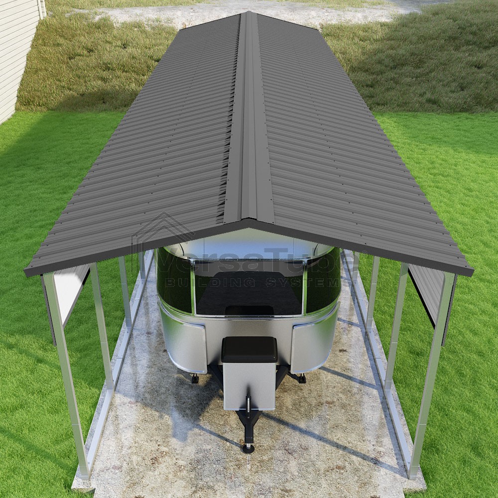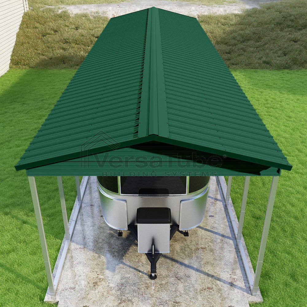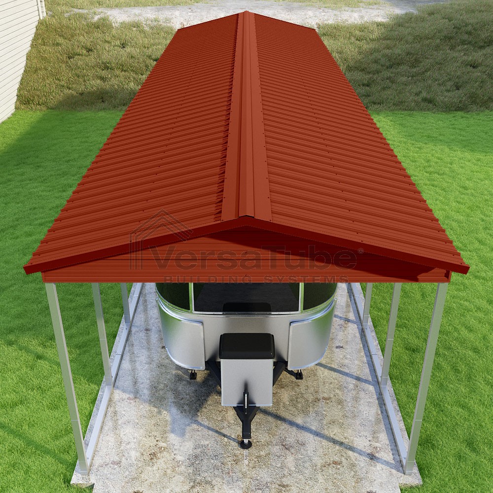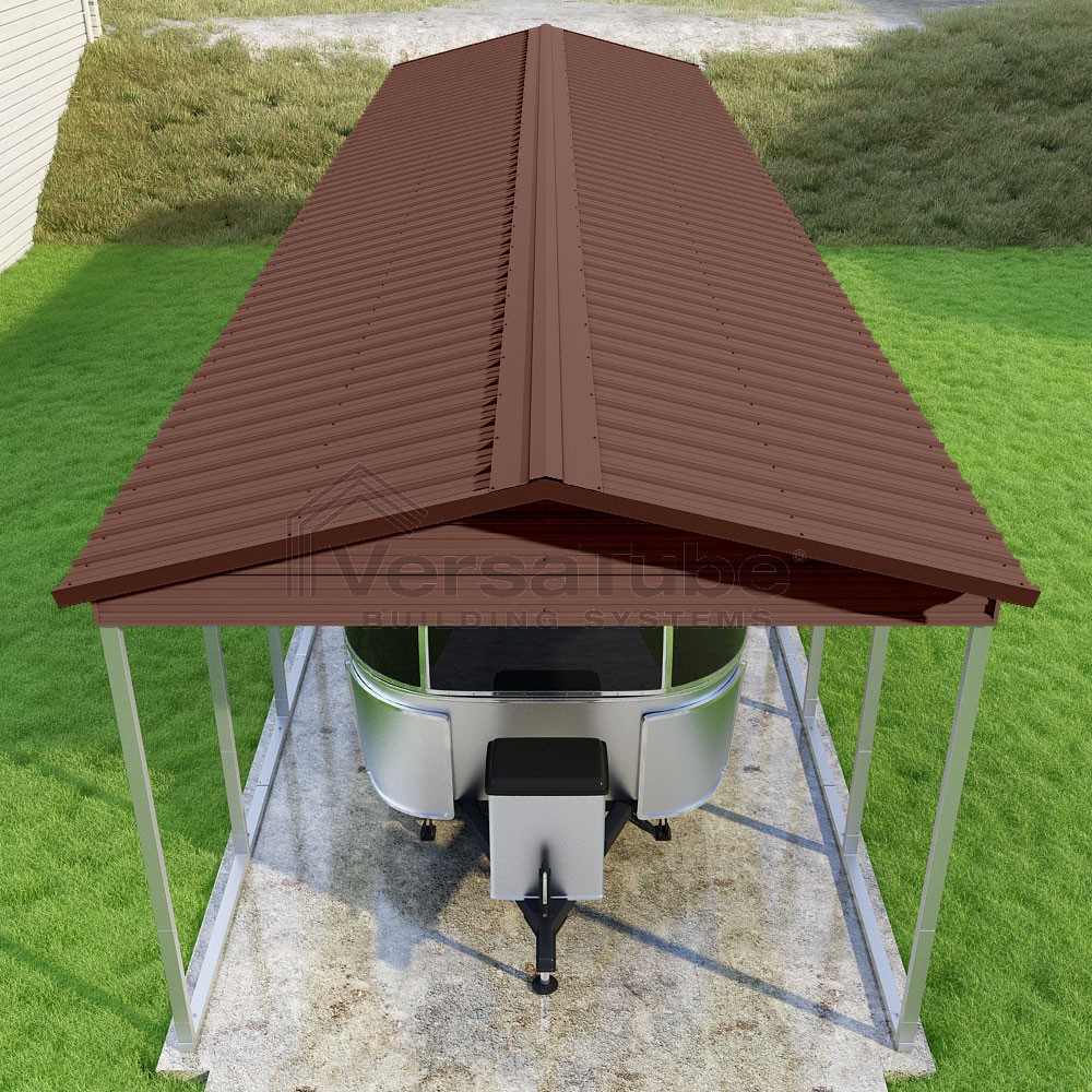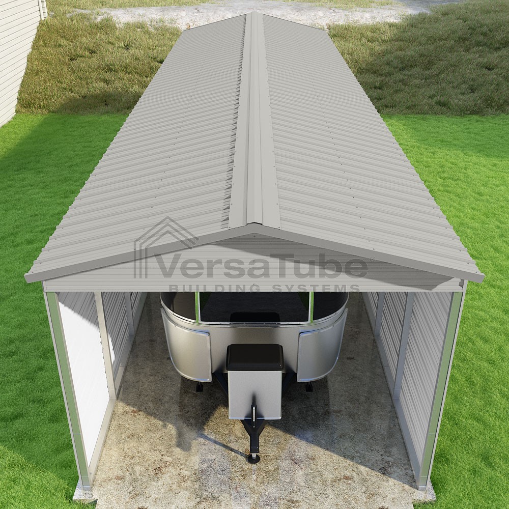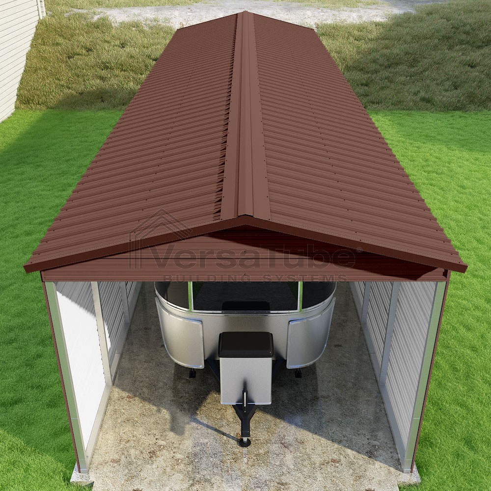Pinnacle Series DIY carport kit features vertical sheet metal roof panels with ridge cap, gable and eave trim for an A-frame roof style and extended coverage on both ends.