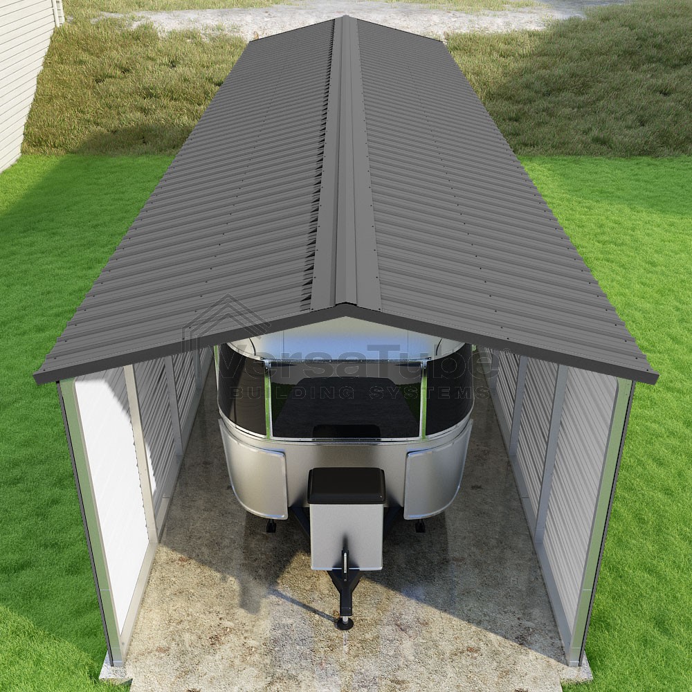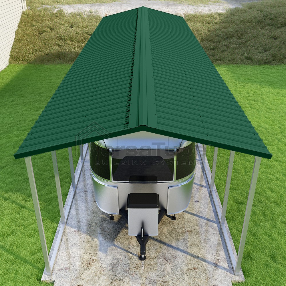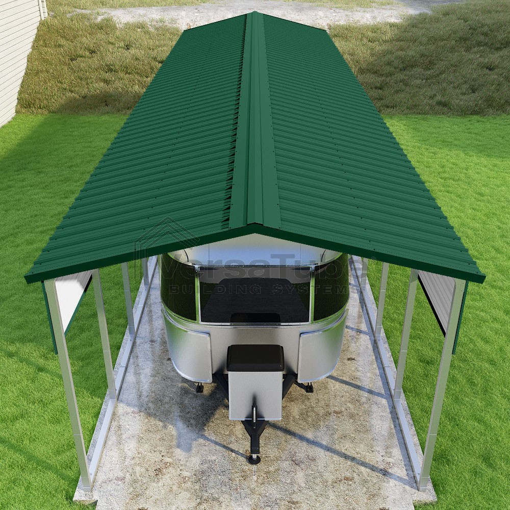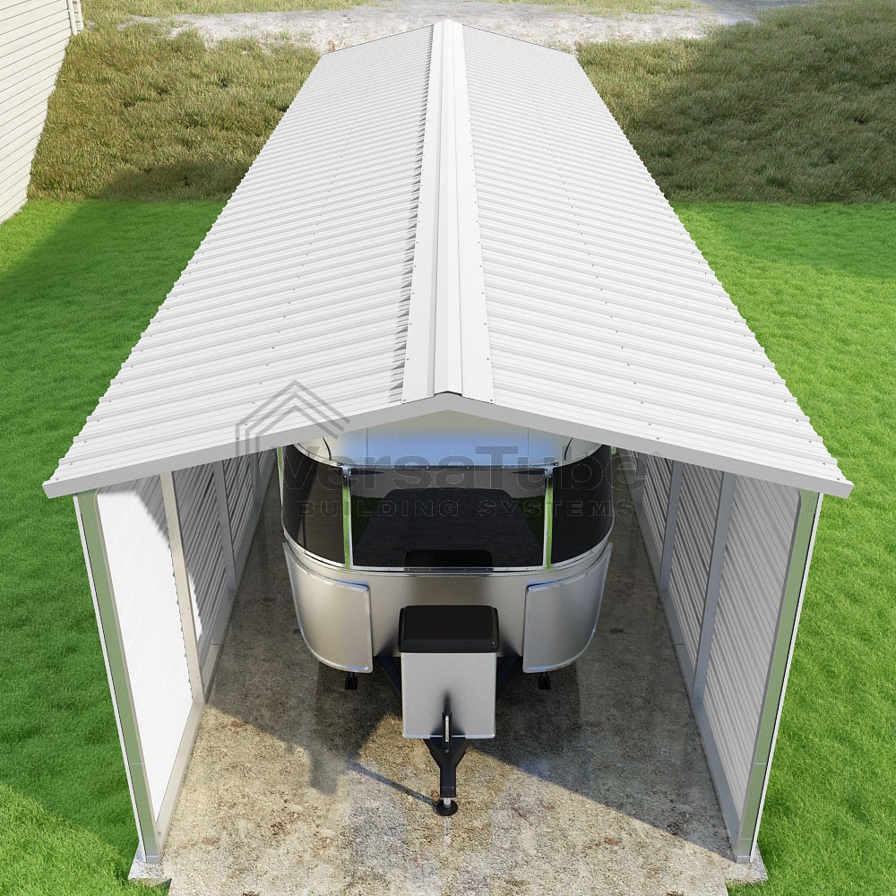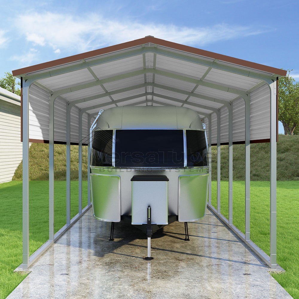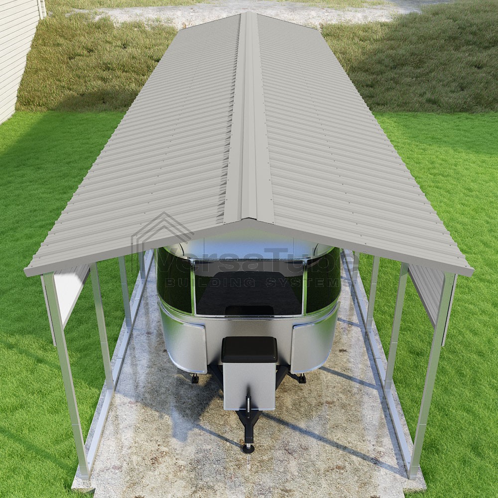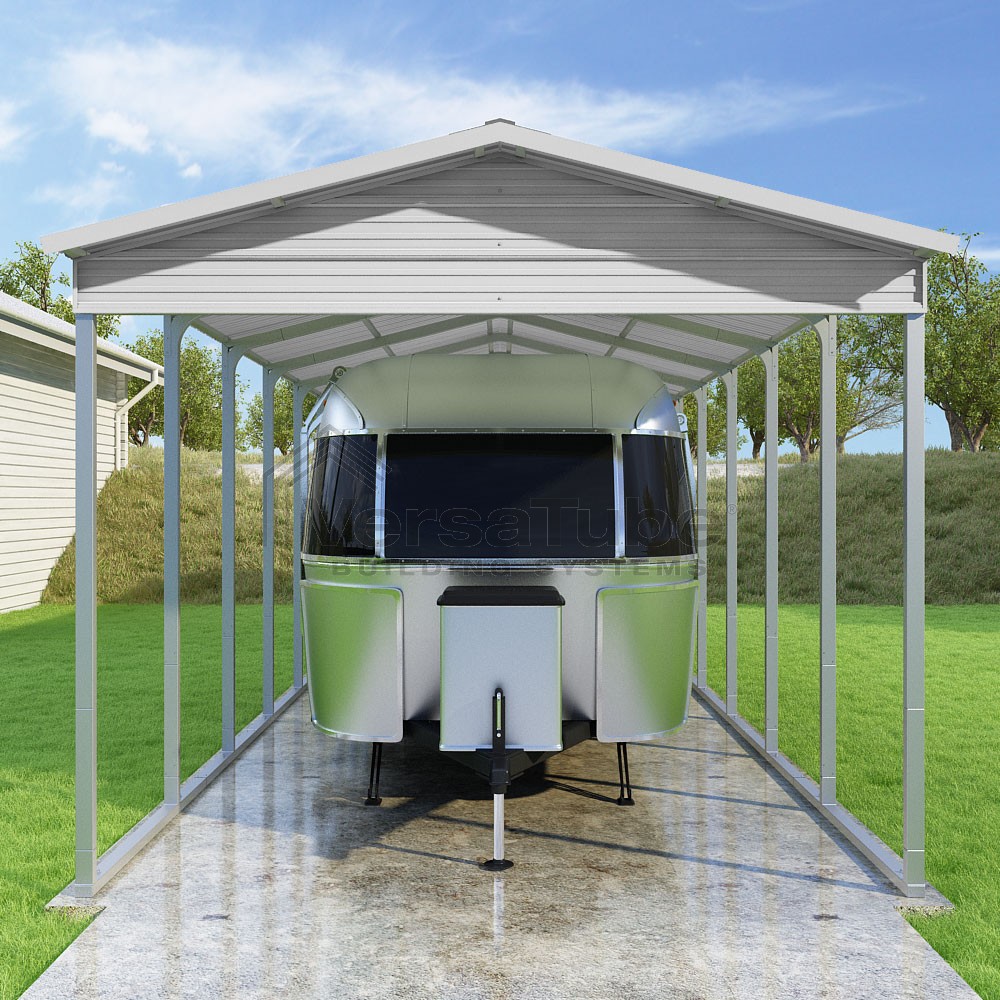 Pinnacle Series DIY carport kit features vertical sheet metal roof panels with ridge cap, gable and eave trim for an A-frame roof style and extended coverage on both ends.