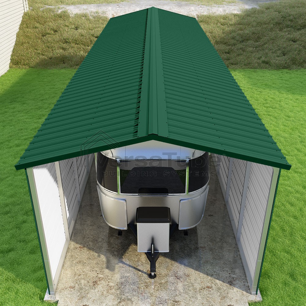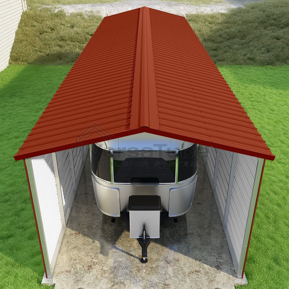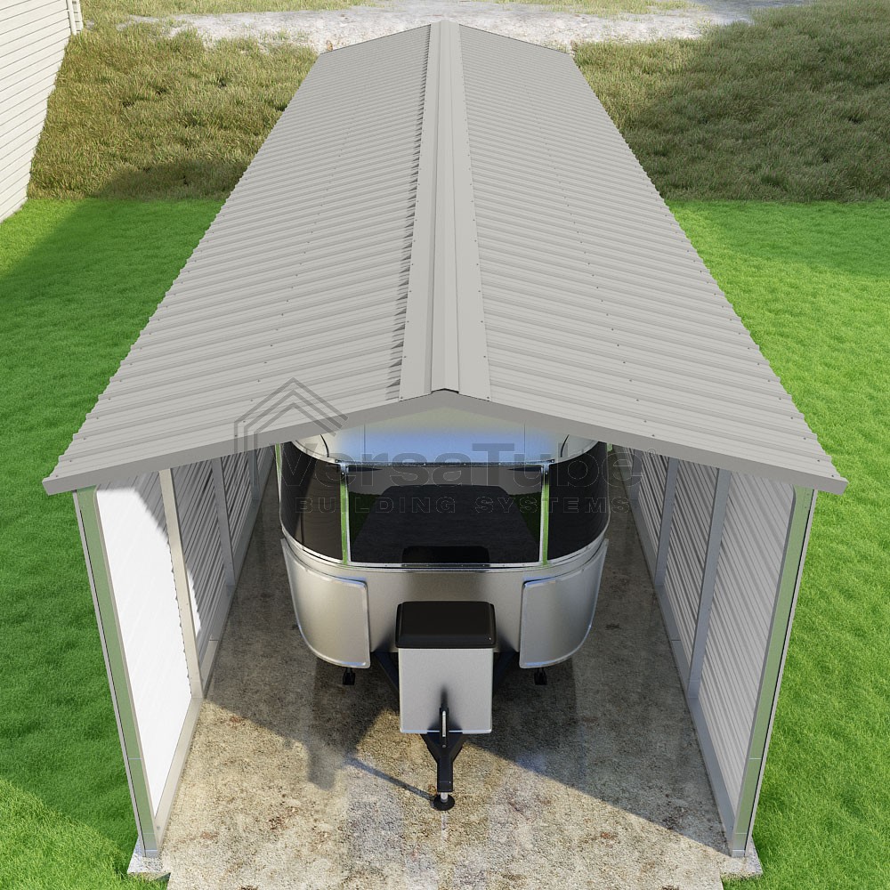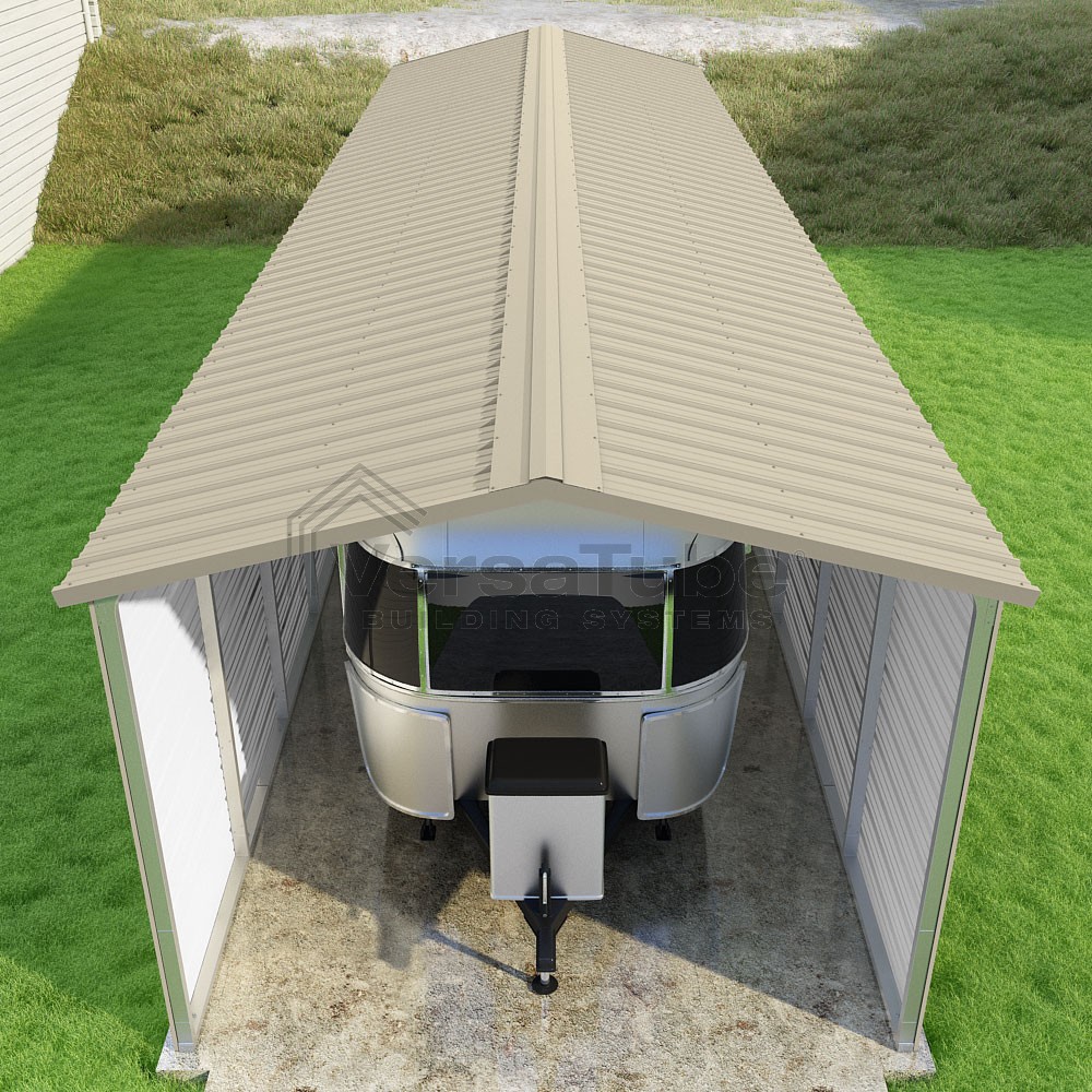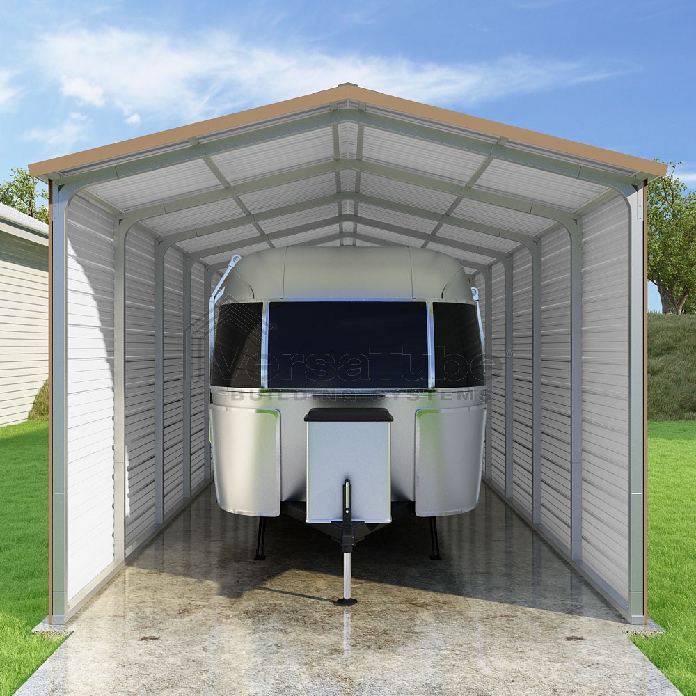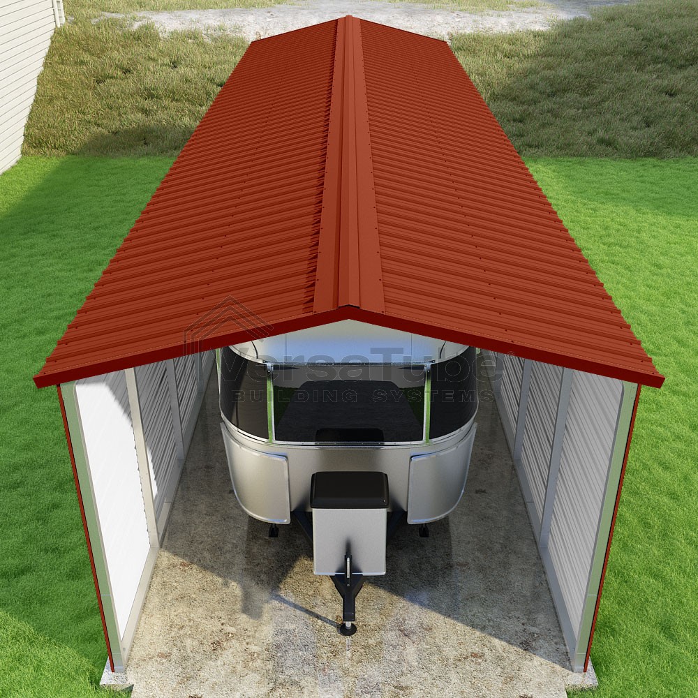 Pinnacle Series DIY carport kit features vertical sheet metal roof panels with ridge cap, gable and eave trim for an A-frame roof style and extended coverage on both ends.