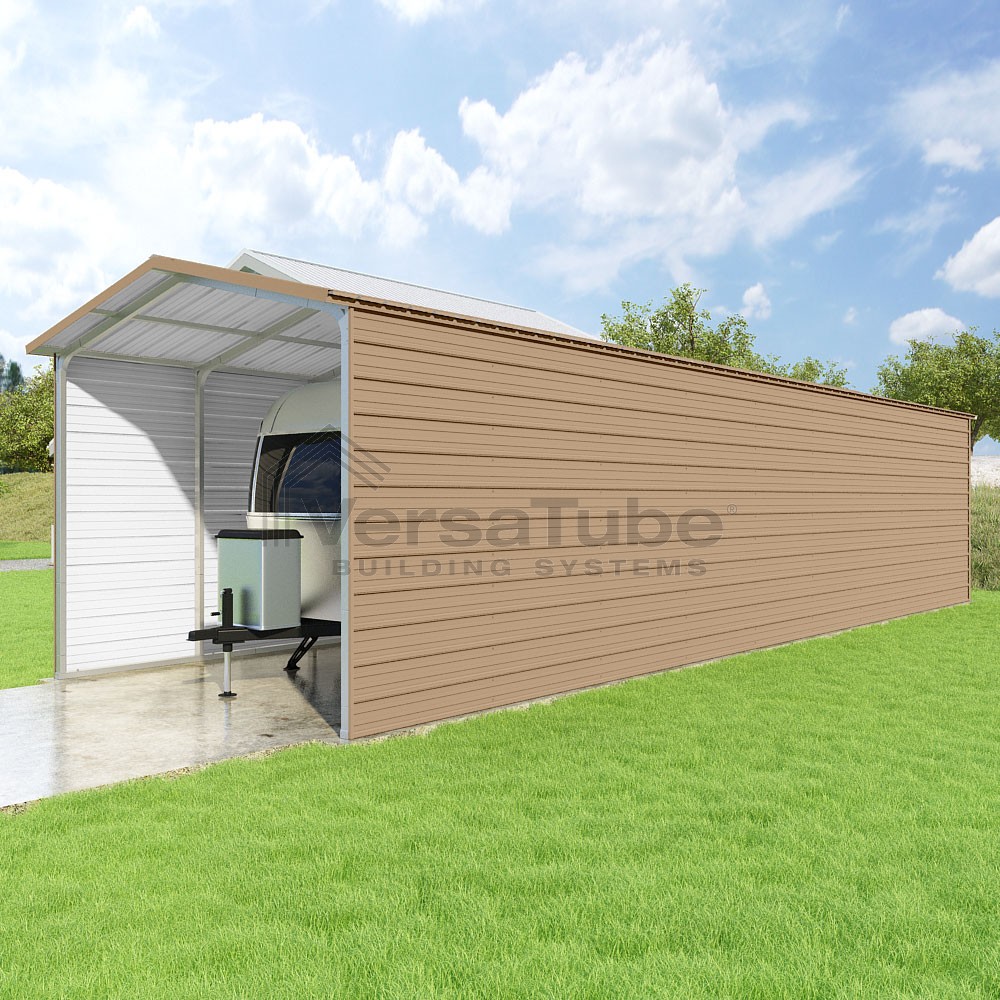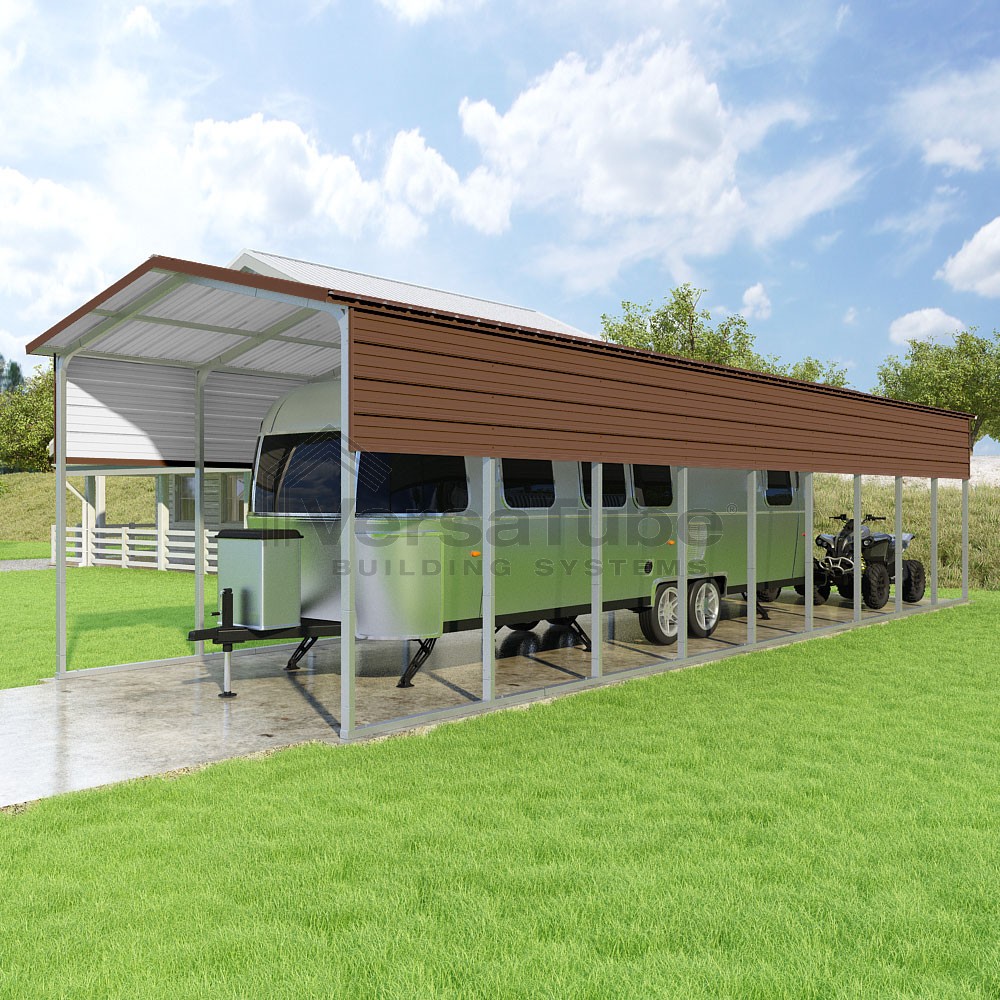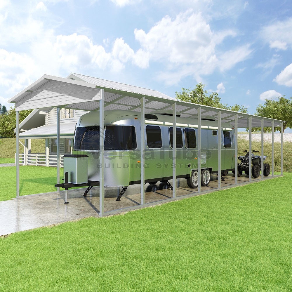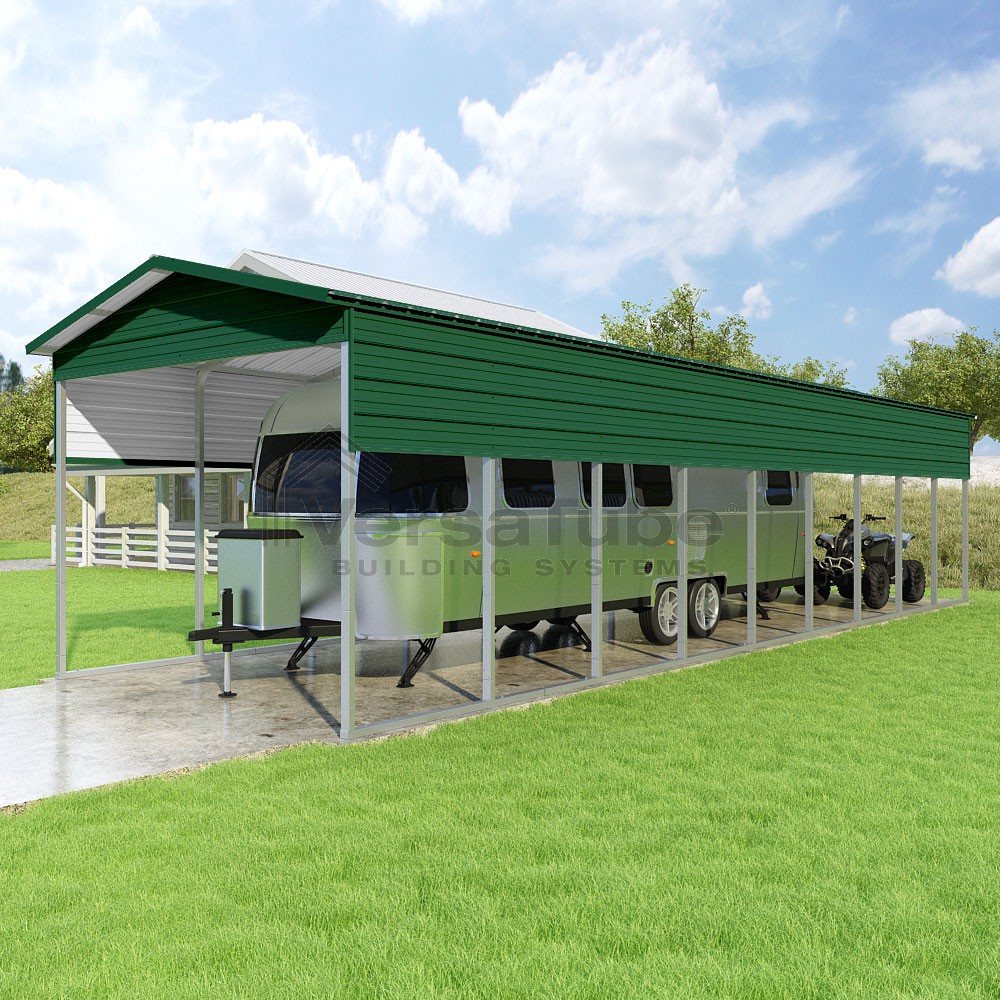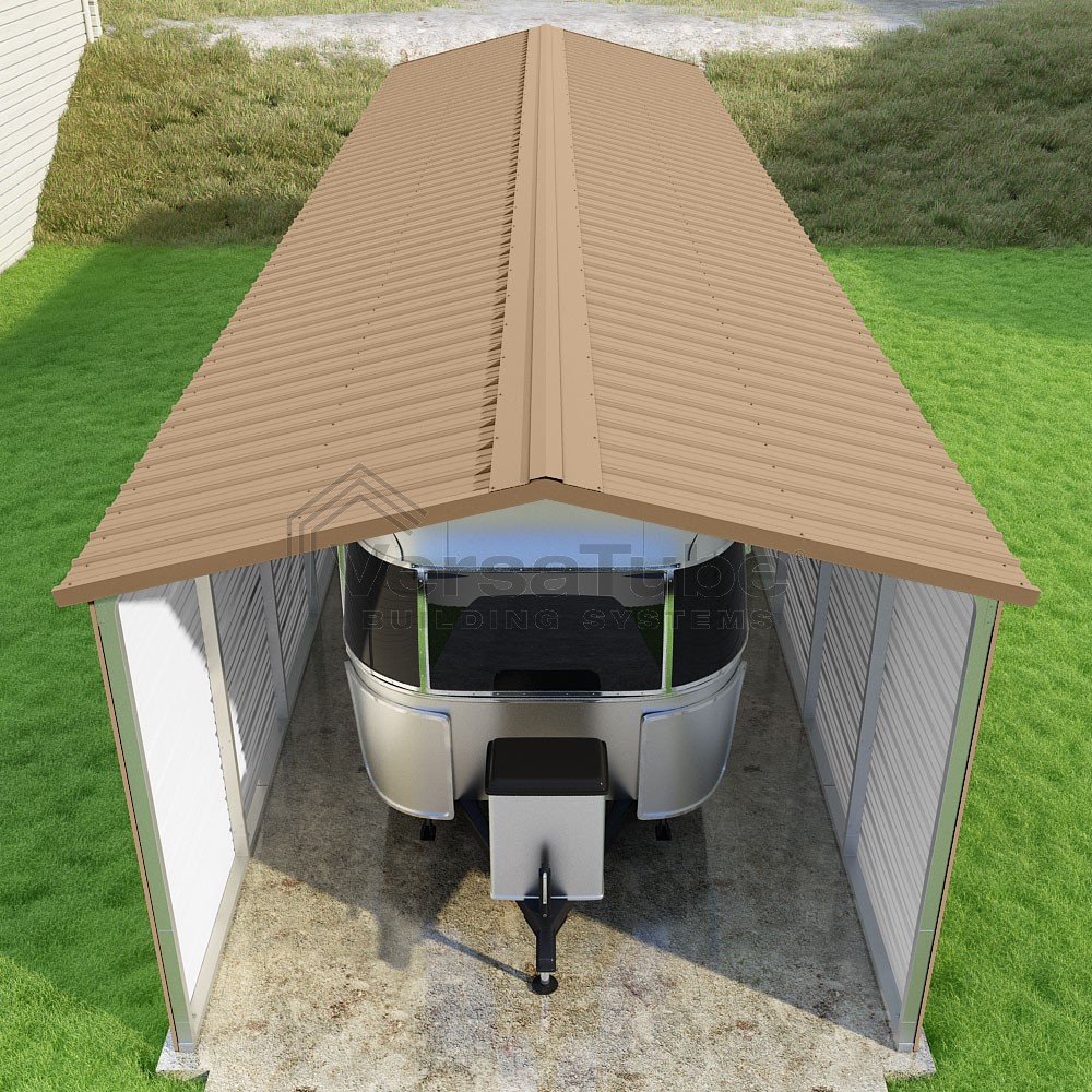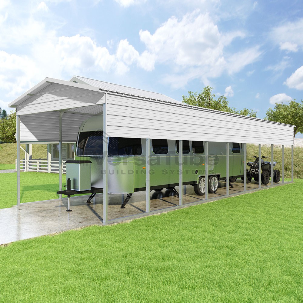 Pinnacle Series DIY carport kit features vertical sheet metal roof panels with ridge cap, gable and eave trim for an A-frame roof style and extended coverage on both ends.