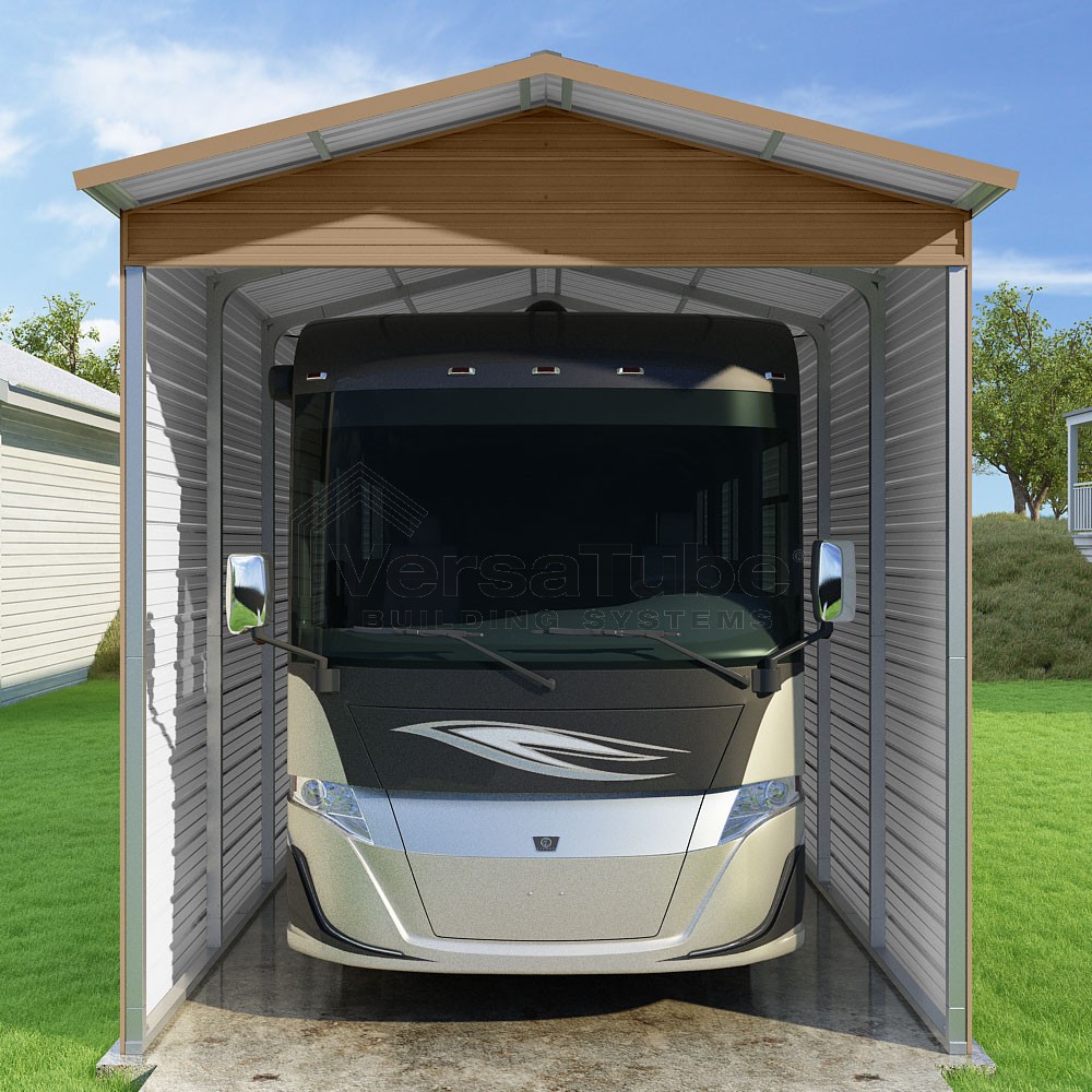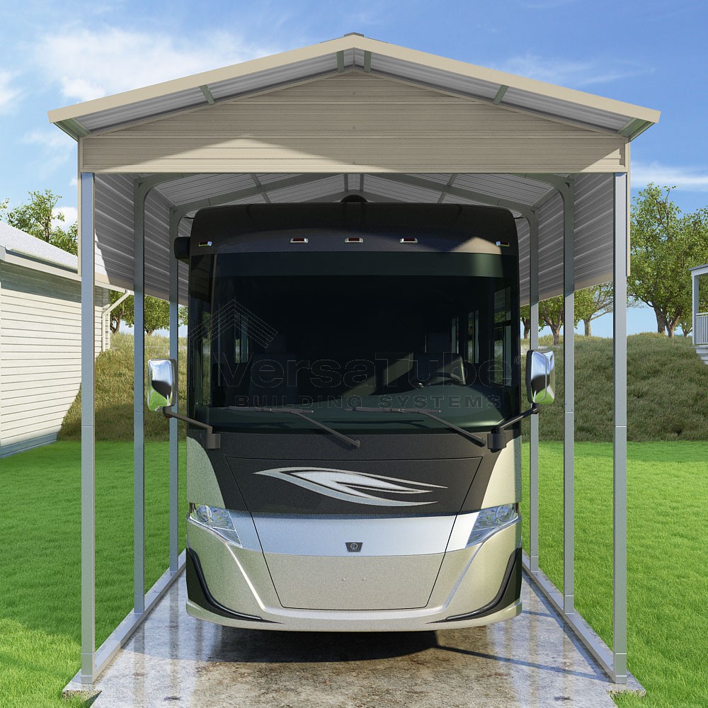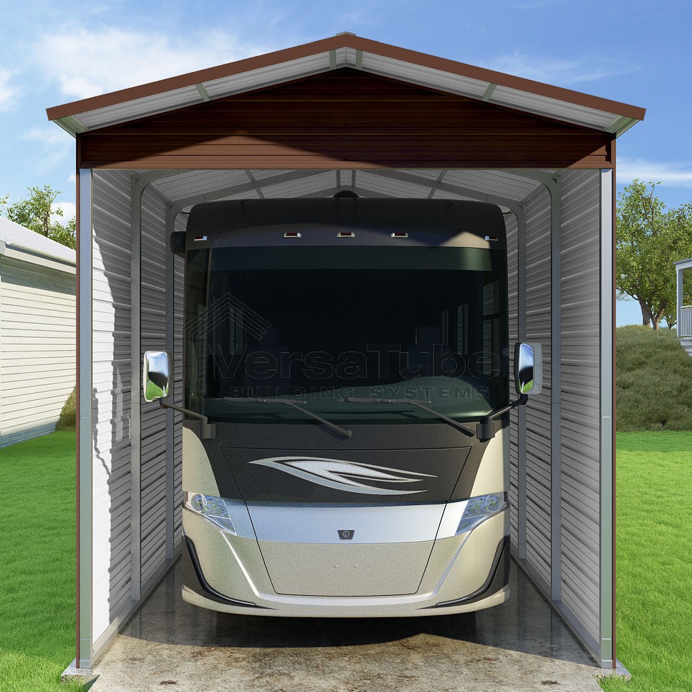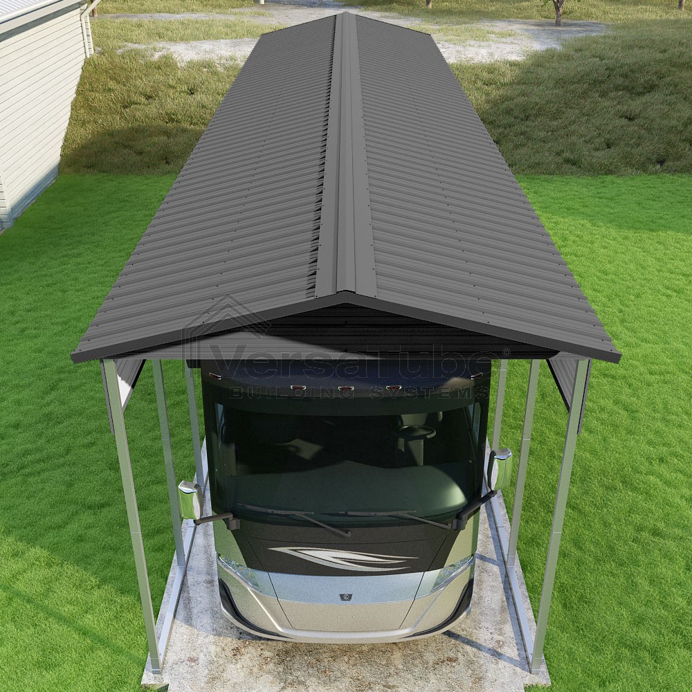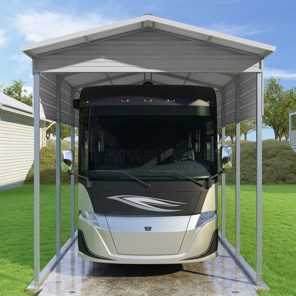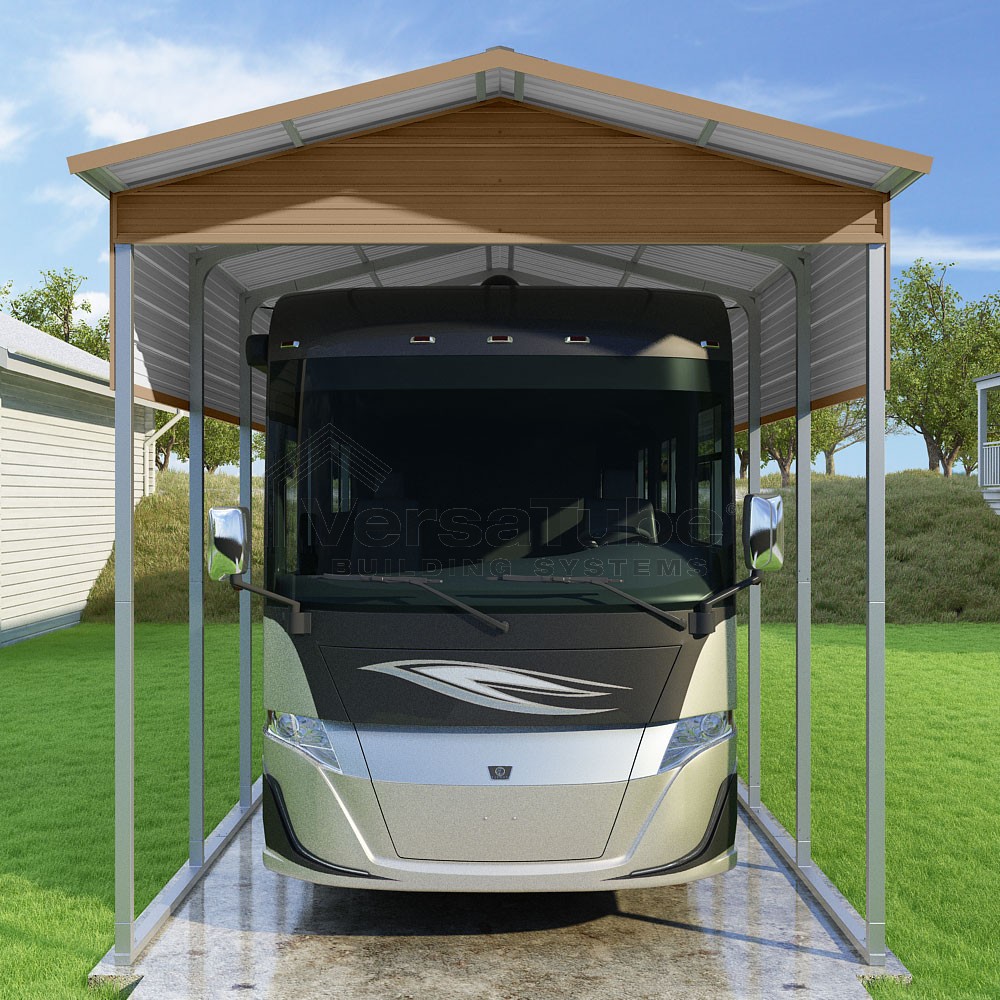 Pinnacle Series DIY carport kit features vertical sheet metal roof panels with ridge cap, gable and eave trim for an A-frame roof style and extended coverage on both ends.