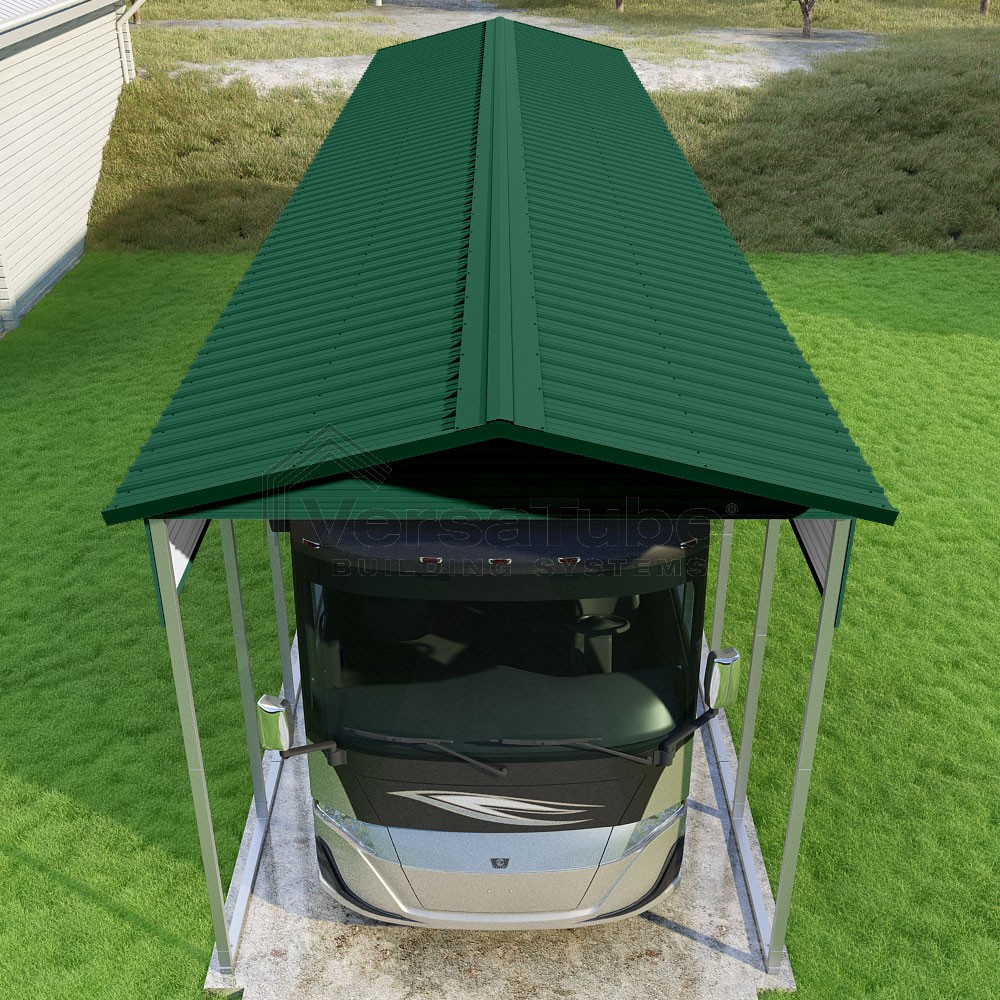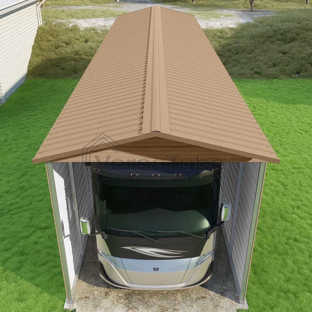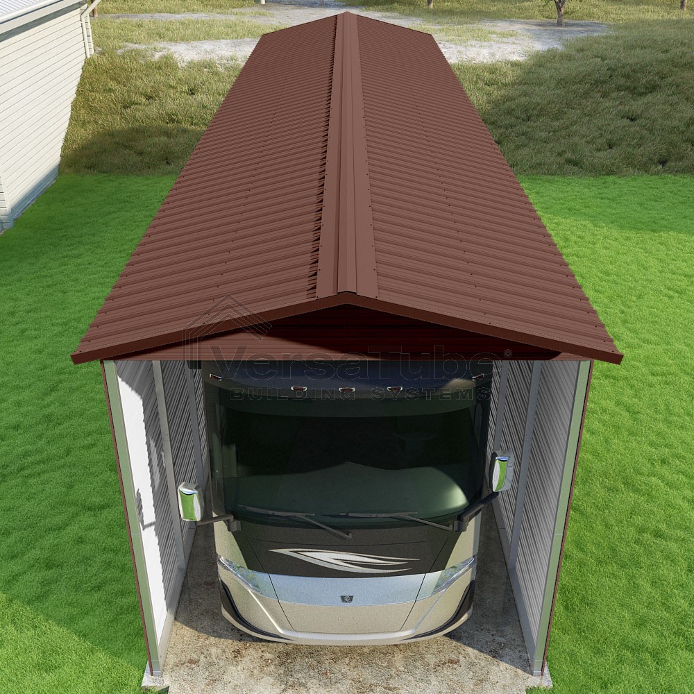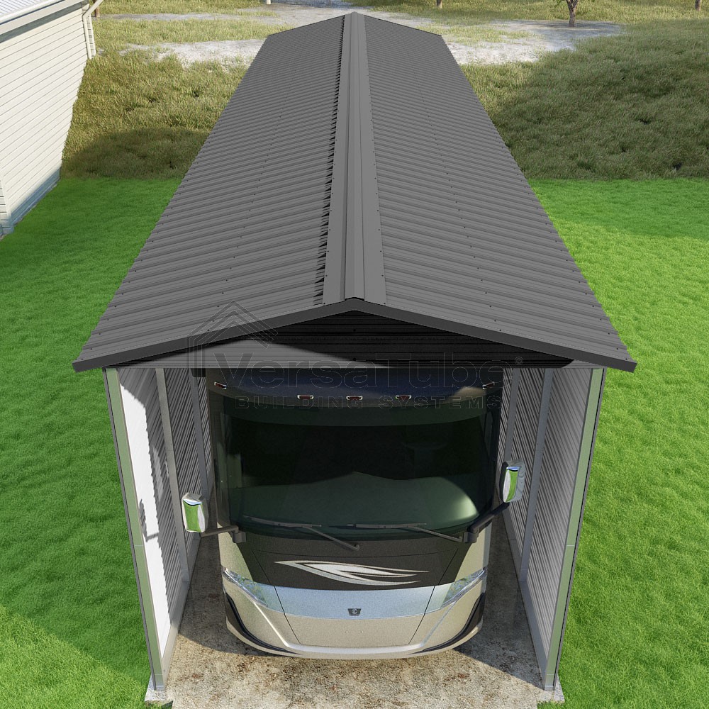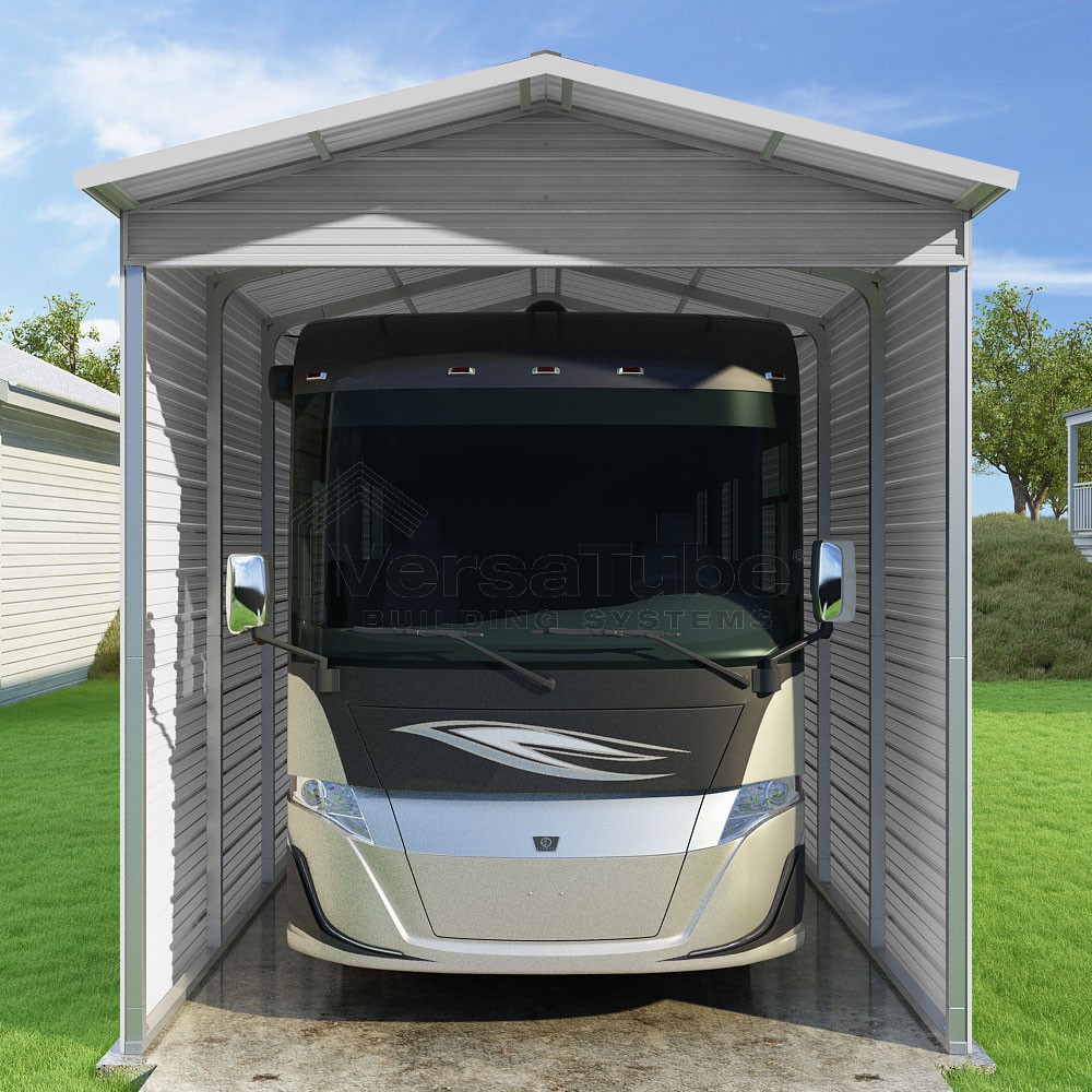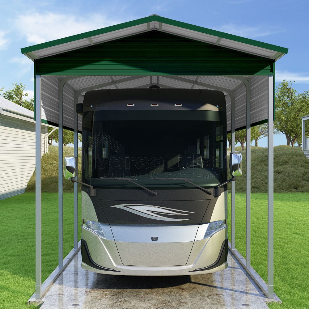 Pinnacle Series DIY carport kit features vertical sheet metal roof panels with ridge cap, gable and eave trim for an A-frame roof style and extended coverage on both ends.