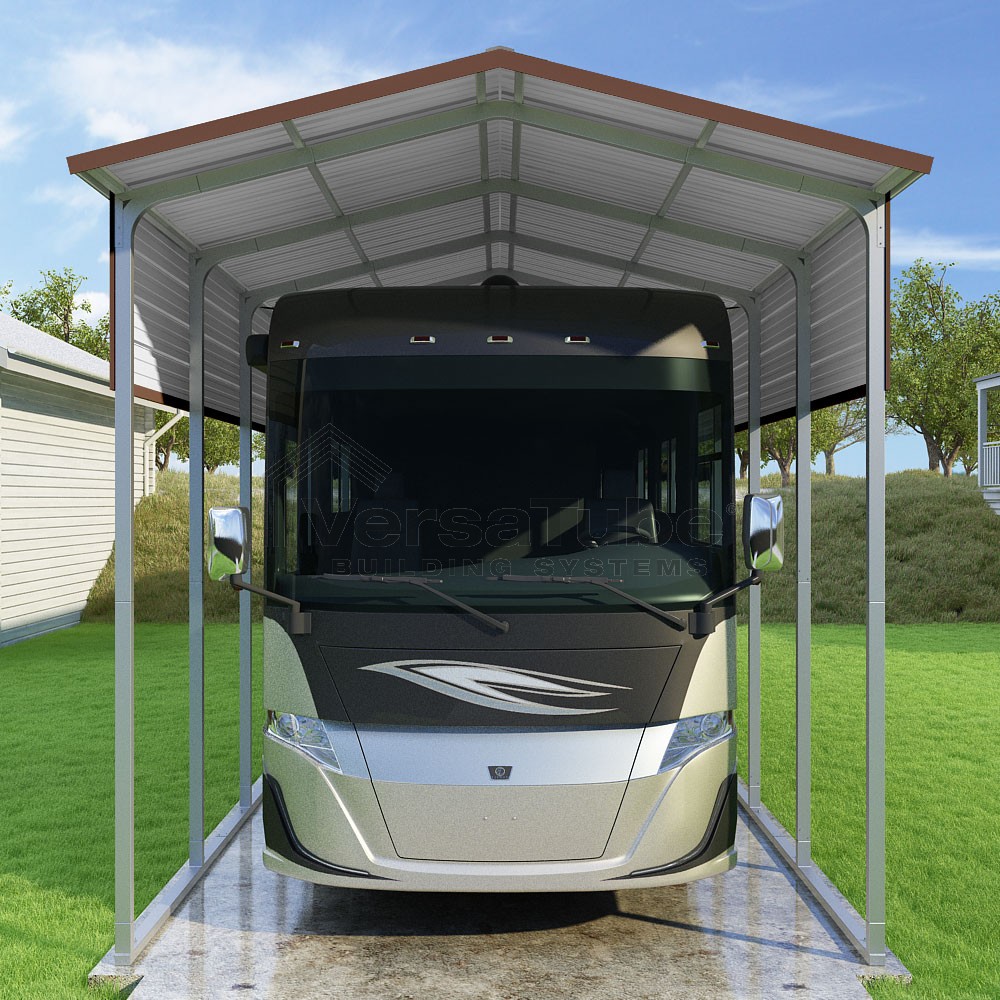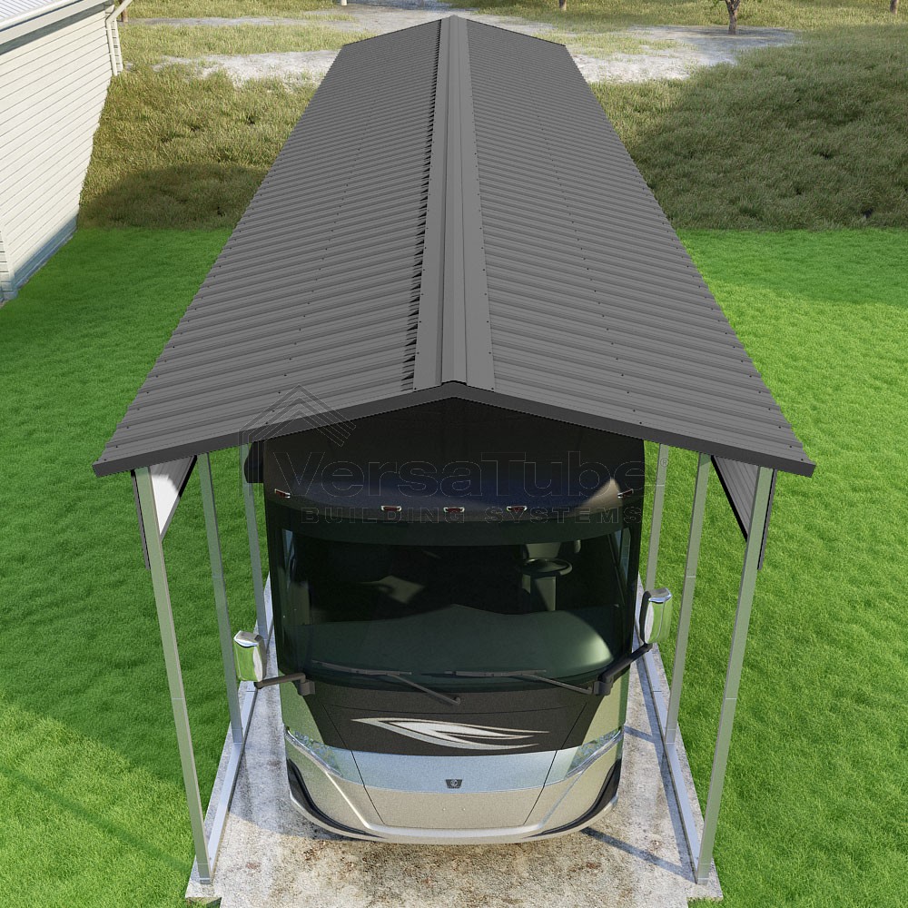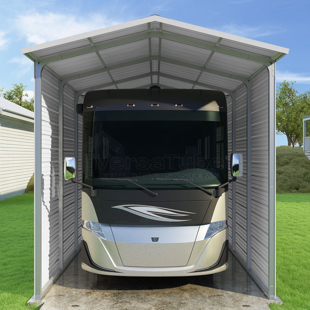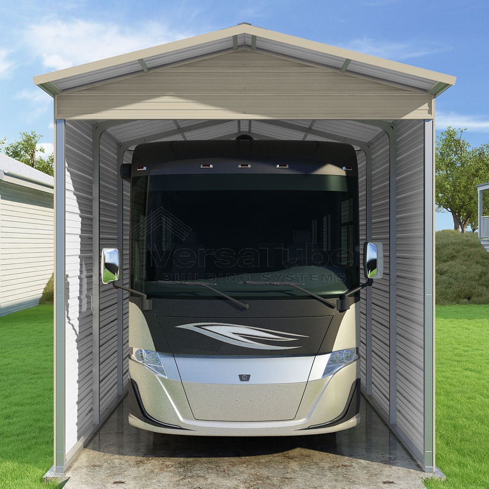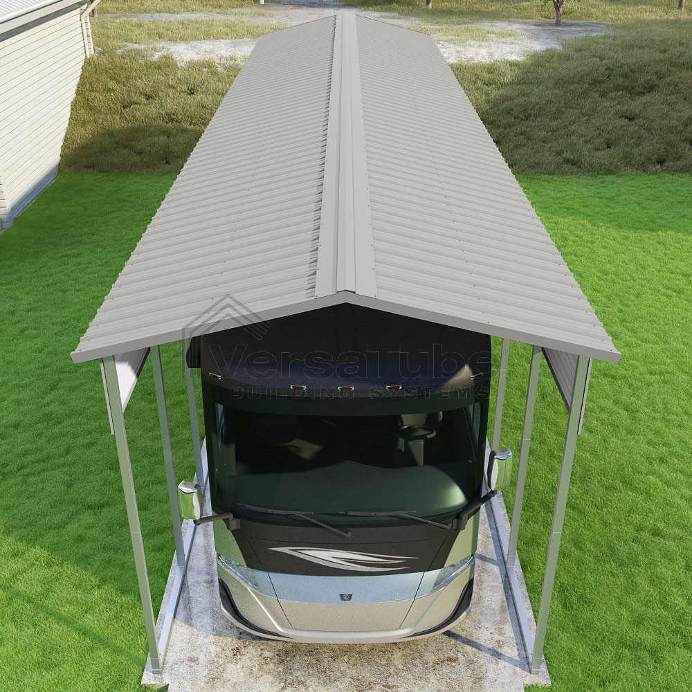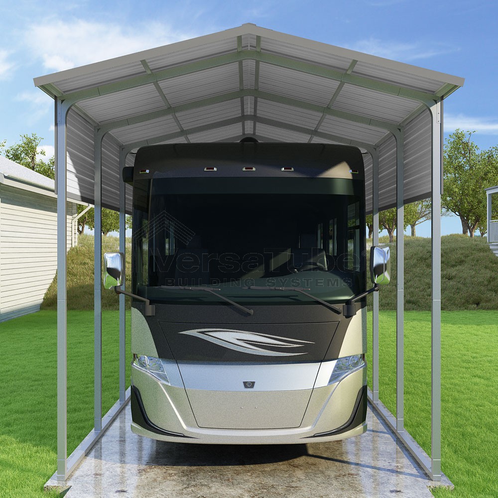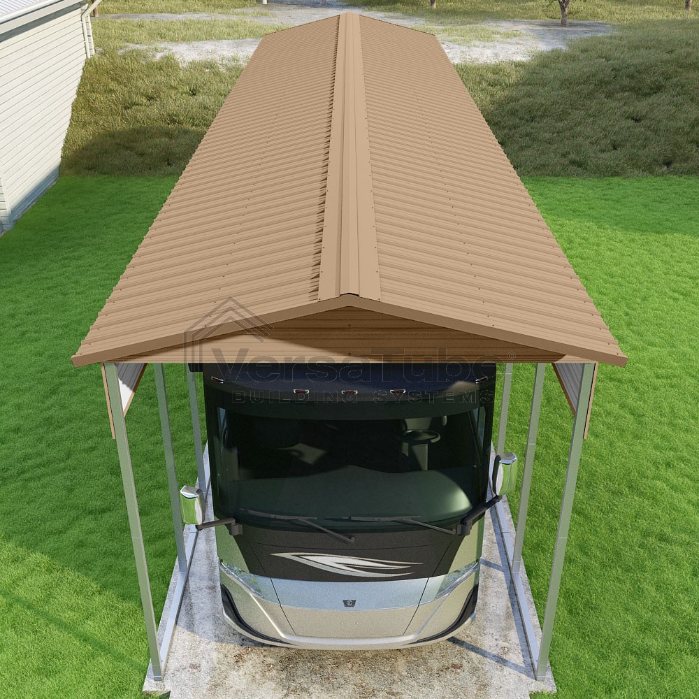 Pinnacle Series DIY carport kit features vertical sheet metal roof panels with ridge cap, gable and eave trim for an A-frame roof style and extended coverage on both ends.