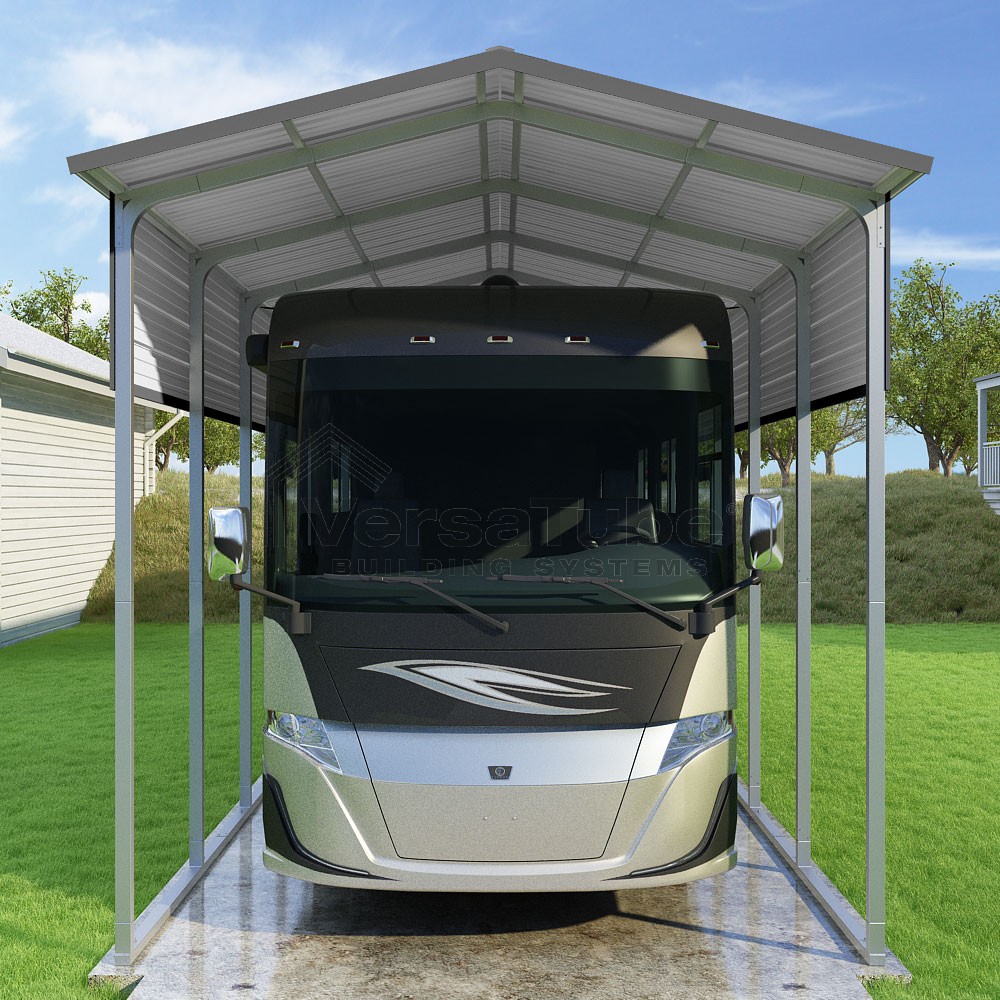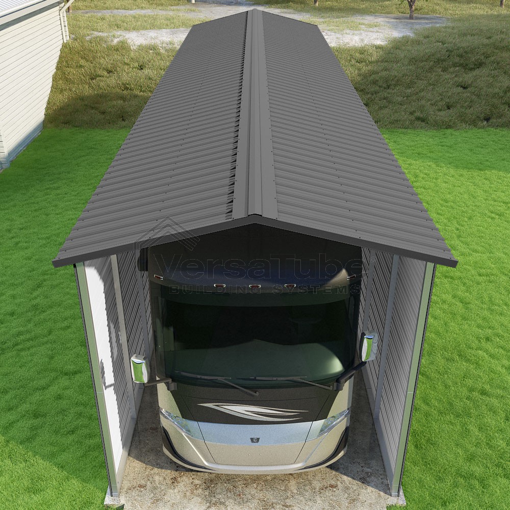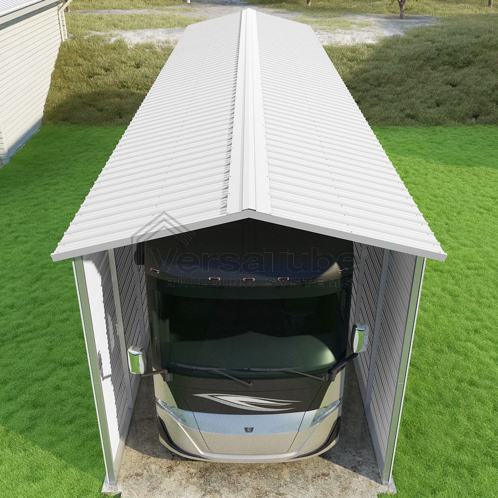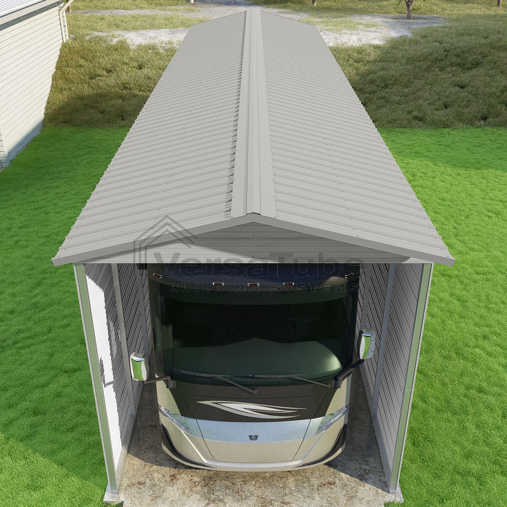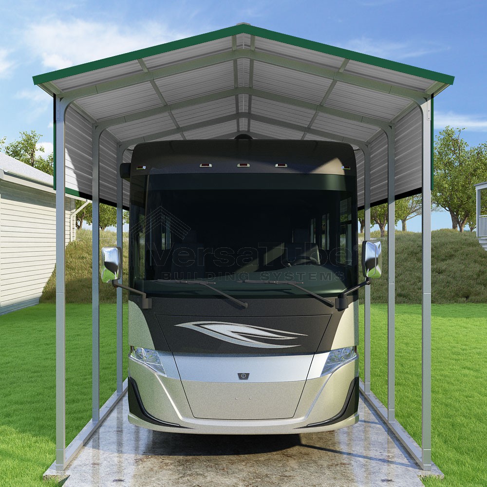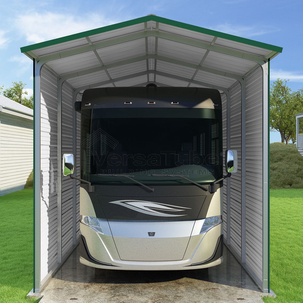 Pinnacle Series DIY carport kit features vertical sheet metal roof panels with ridge cap, gable and eave trim for an A-frame roof style and extended coverage on both ends.