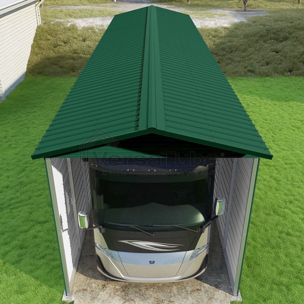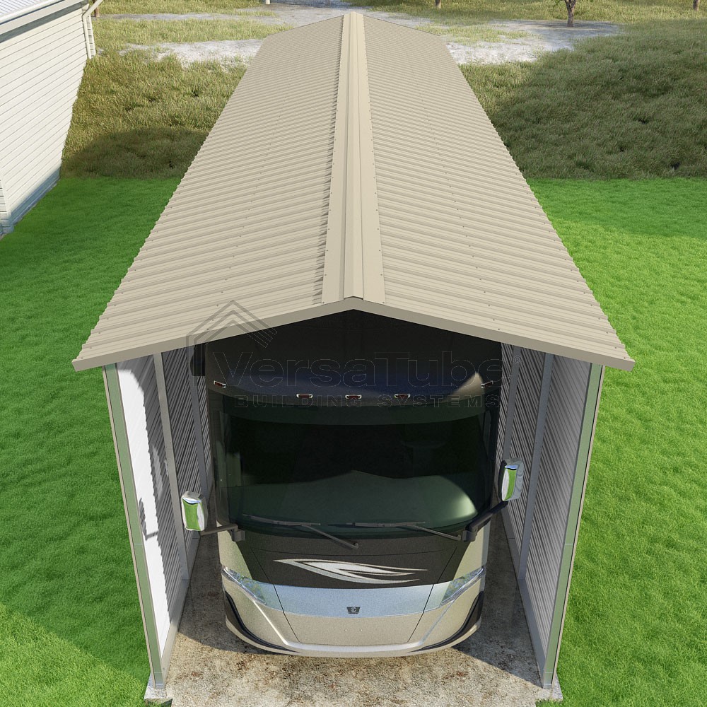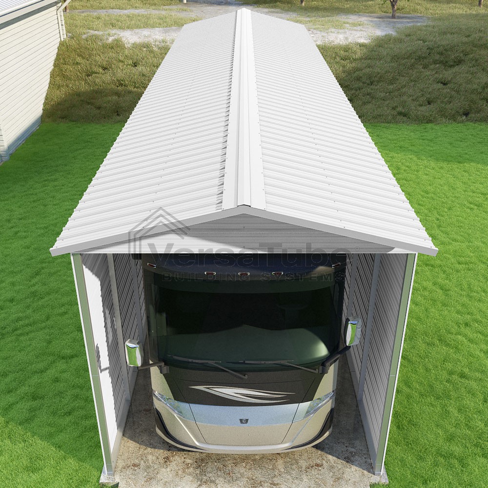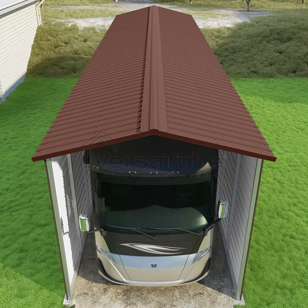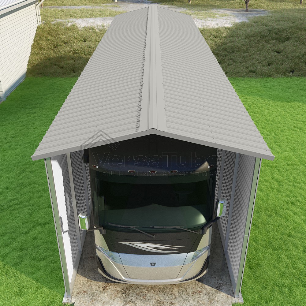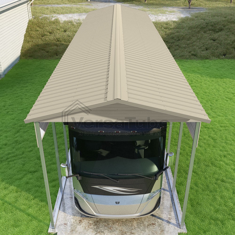 Pinnacle Series DIY carport kit features vertical sheet metal roof panels with ridge cap, gable and eave trim for an A-frame roof style and extended coverage on both ends.