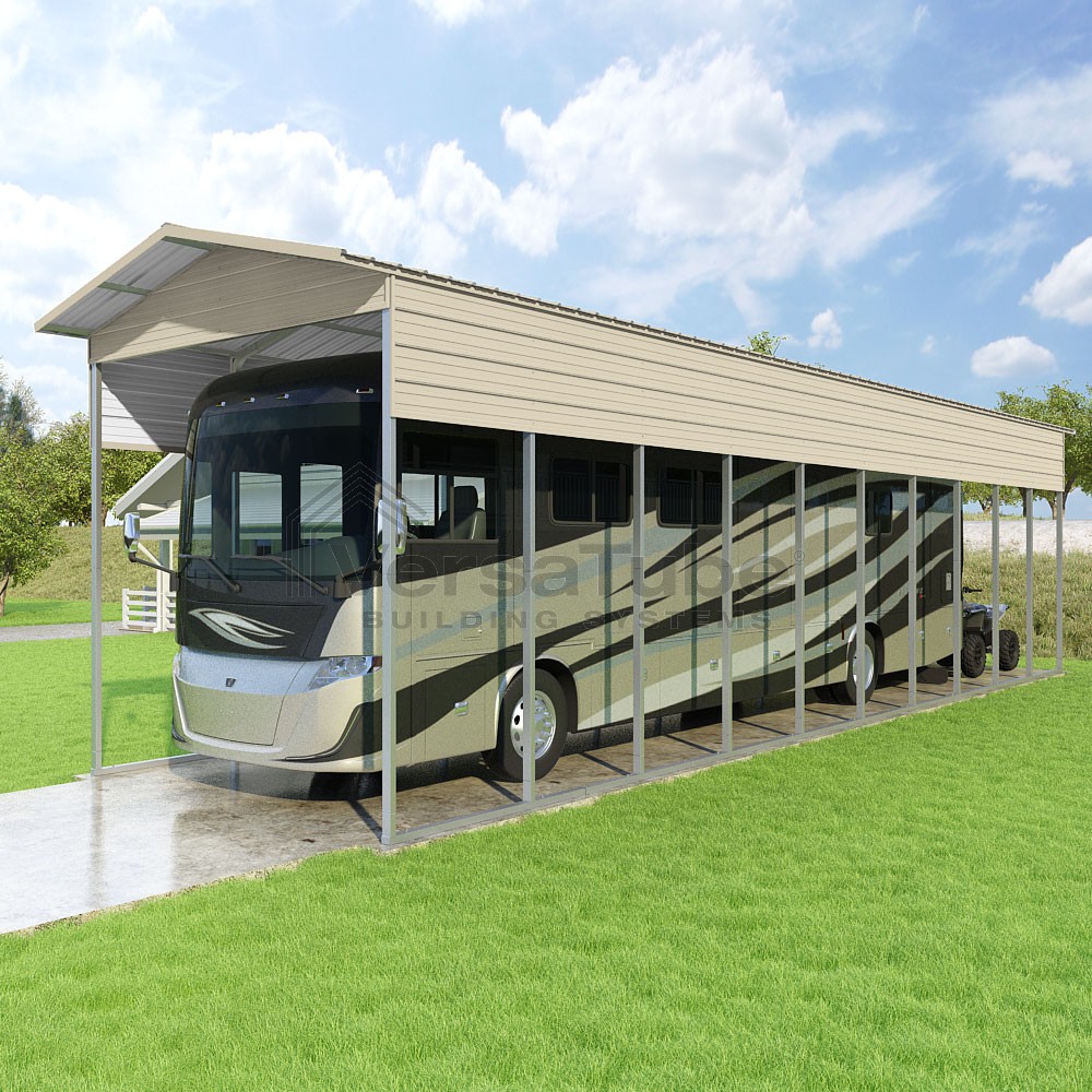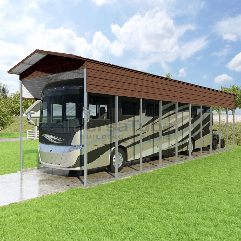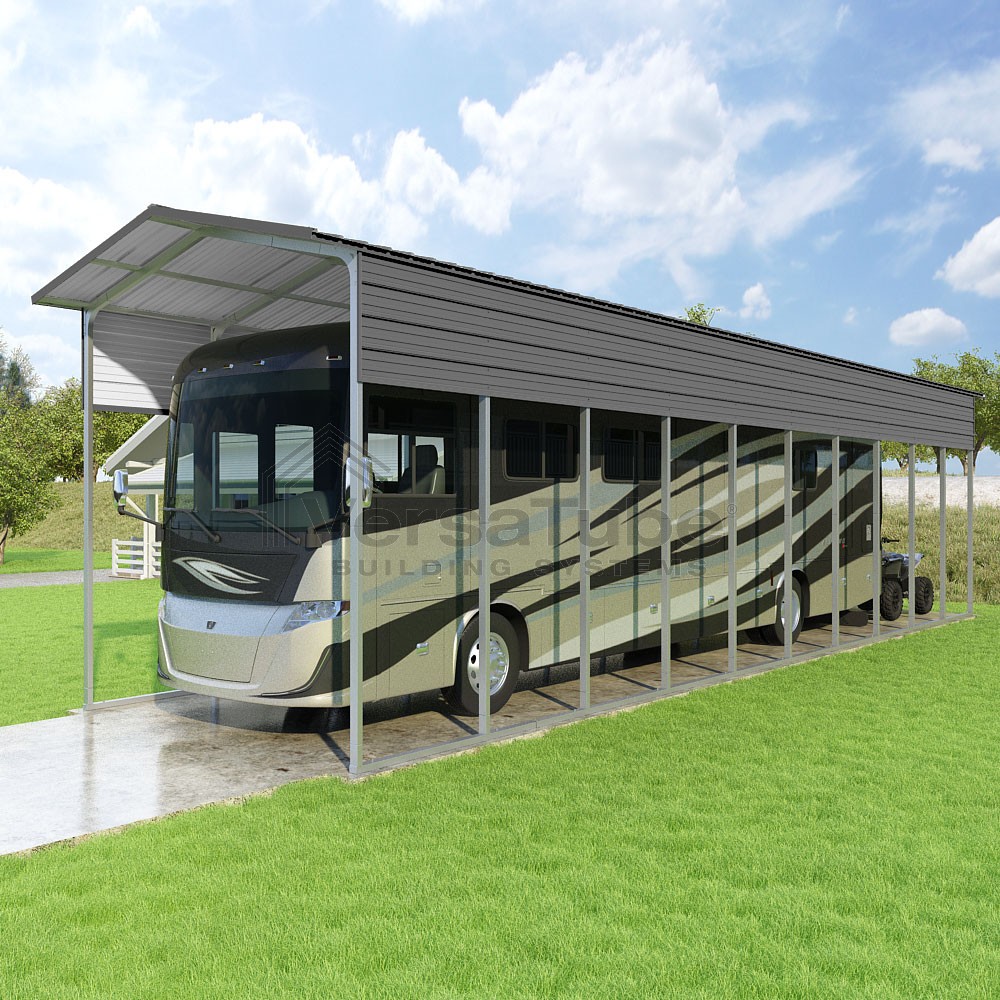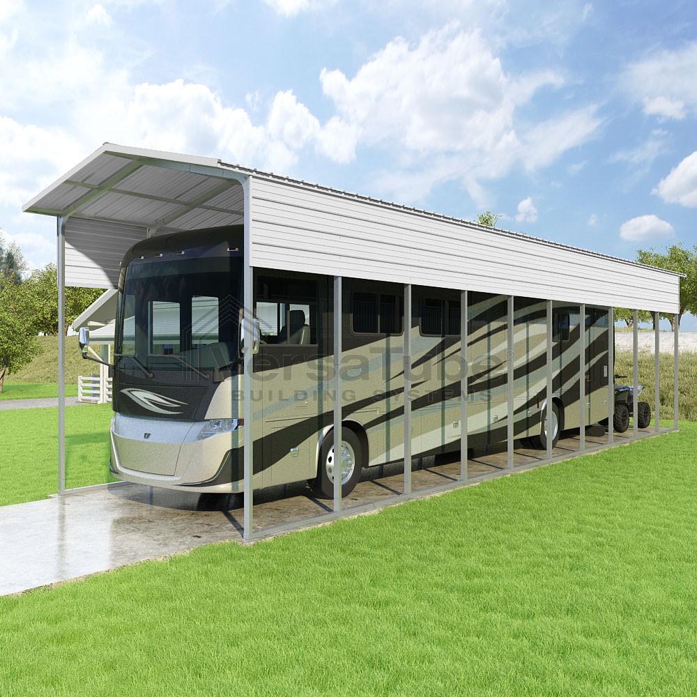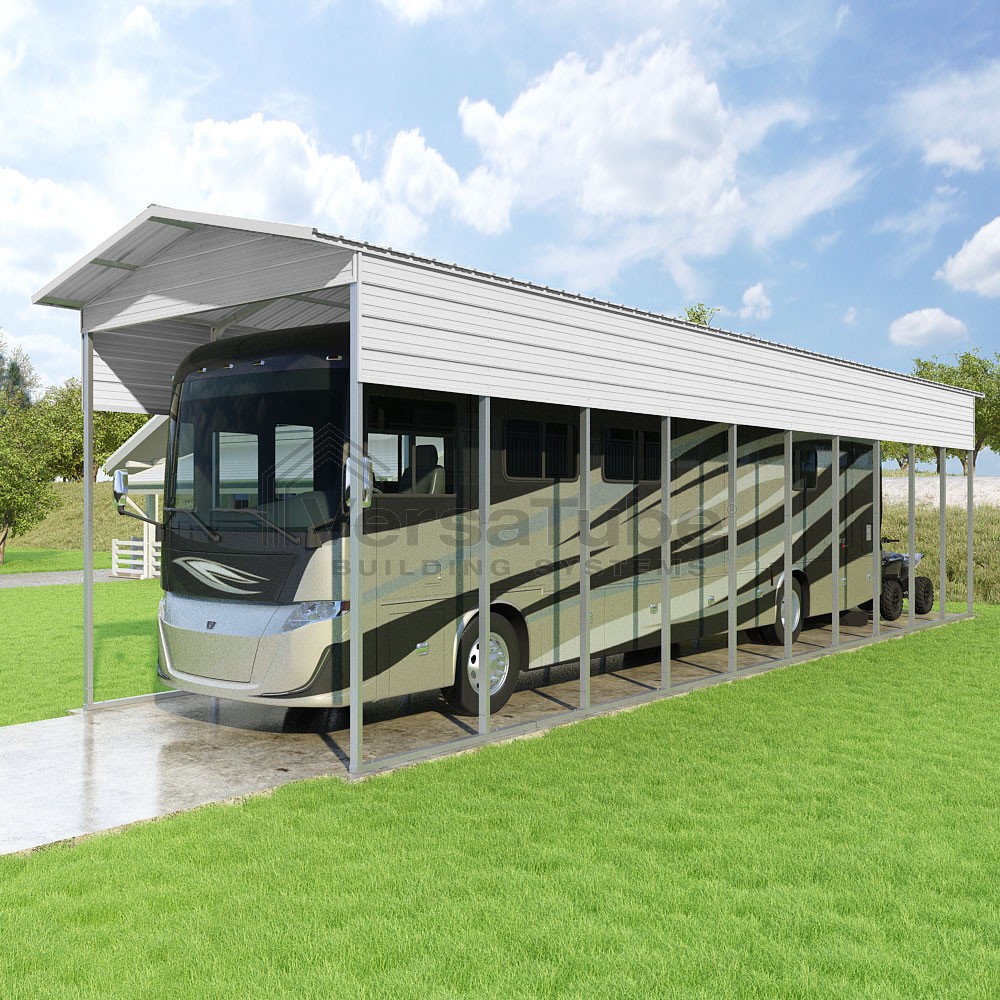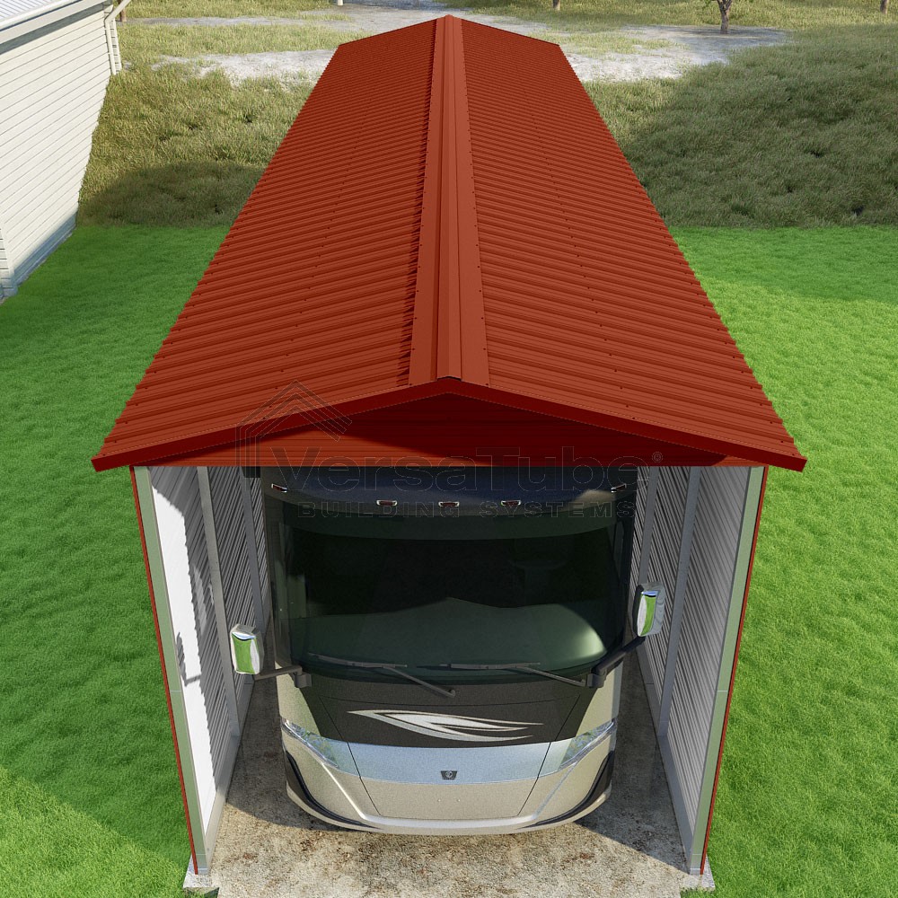 Pinnacle Series DIY carport kit features vertical sheet metal roof panels with ridge cap, gable and eave trim for an A-frame roof style and extended coverage on both ends.