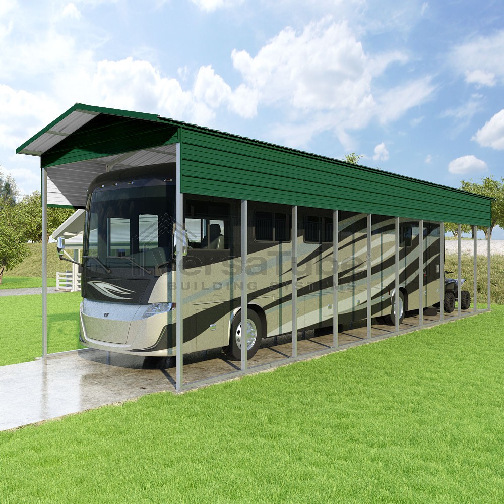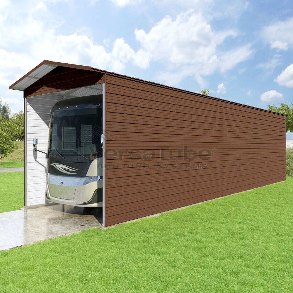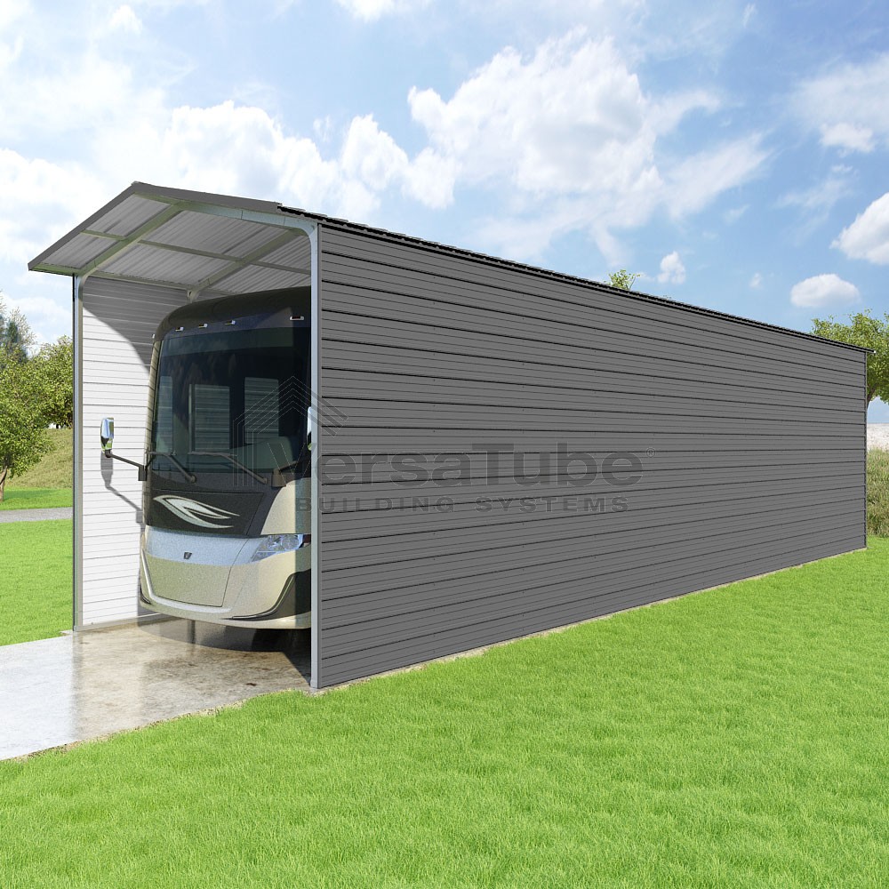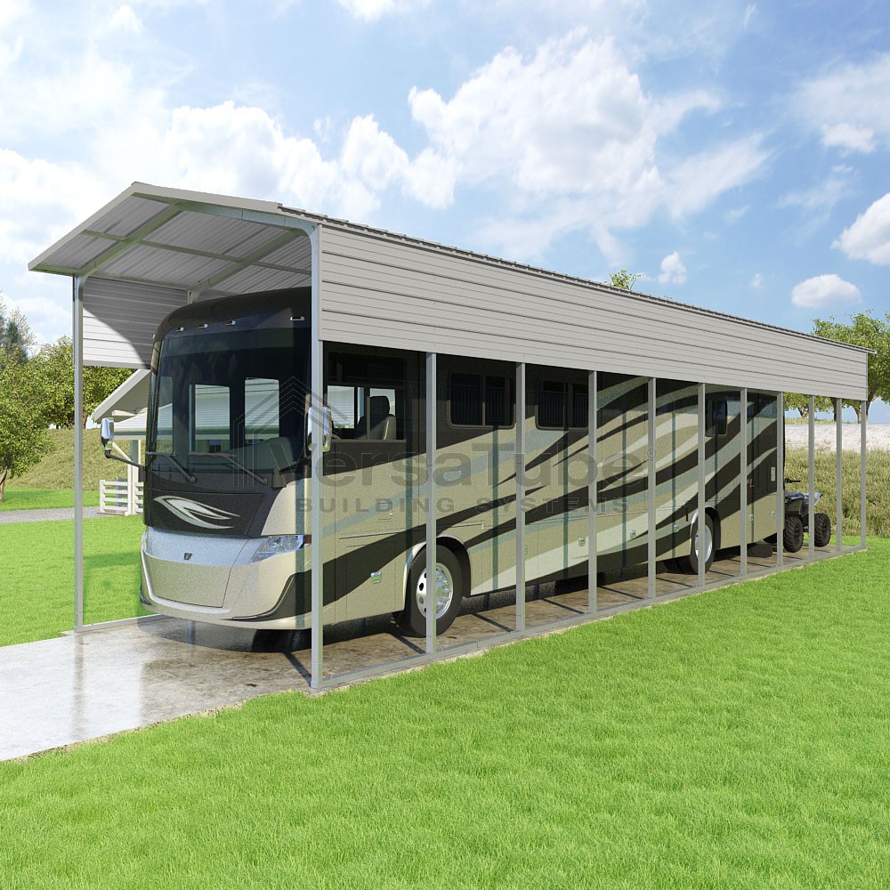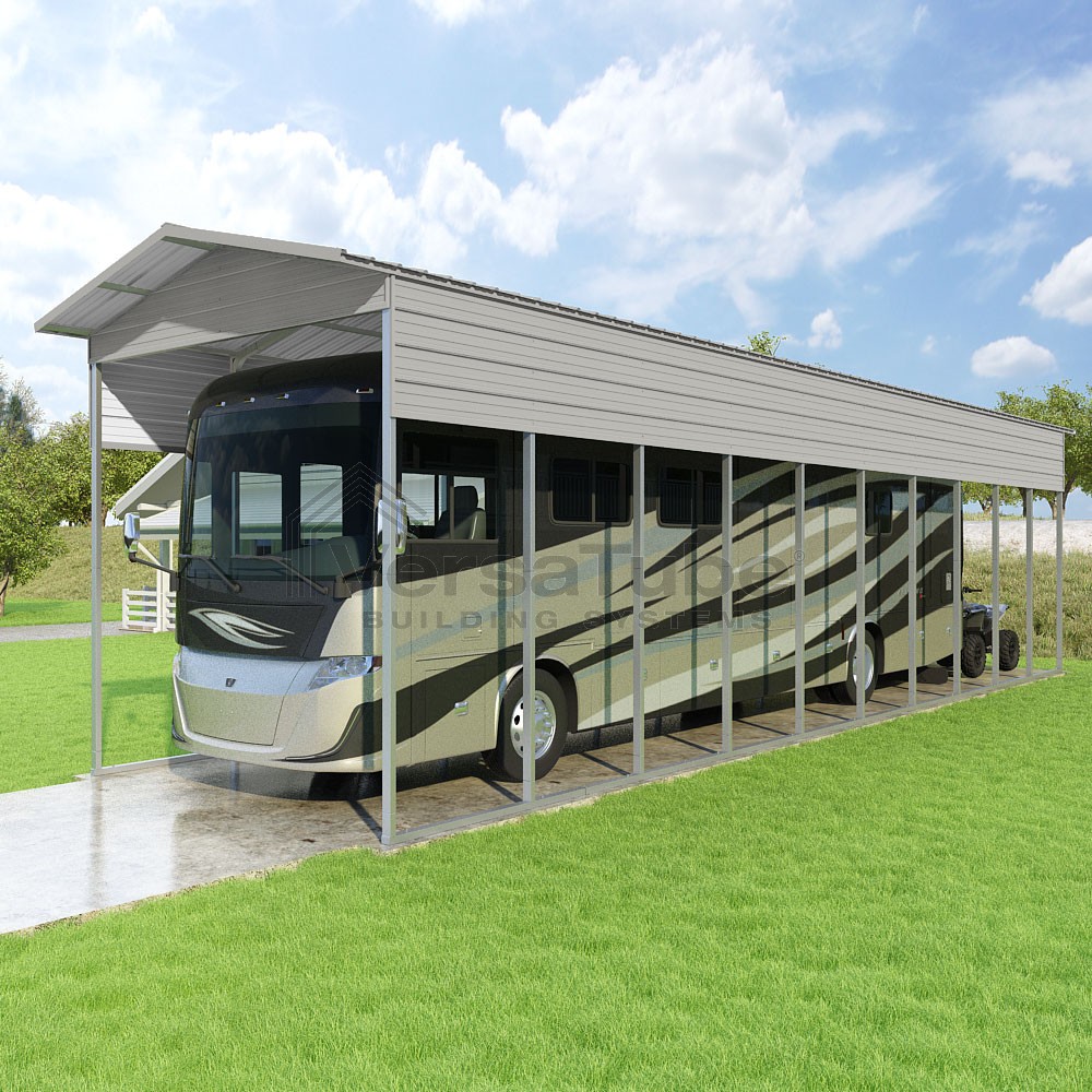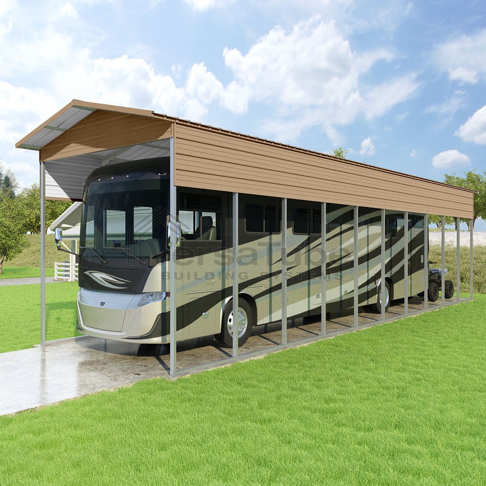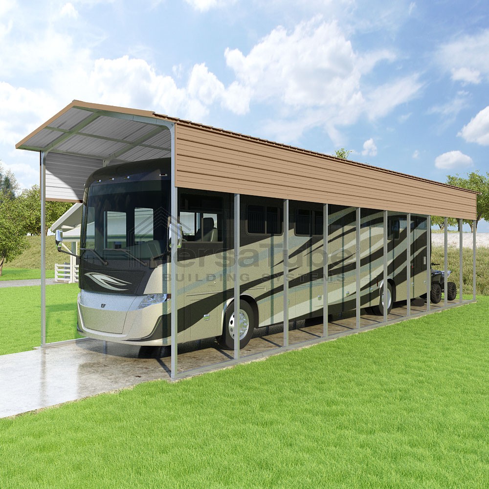 Pinnacle Series DIY carport kit features vertical sheet metal roof panels with ridge cap, gable and eave trim for an A-frame roof style and extended coverage on both ends.