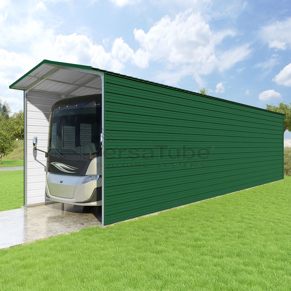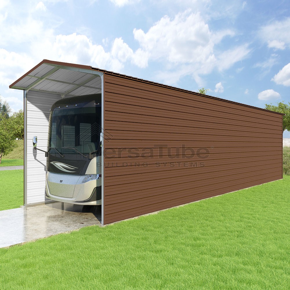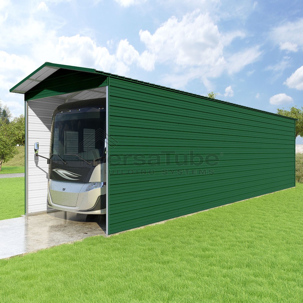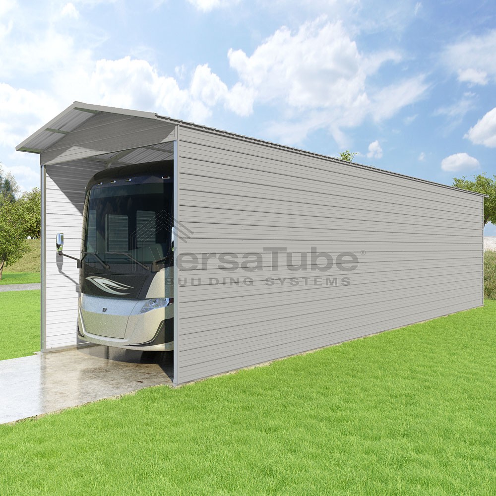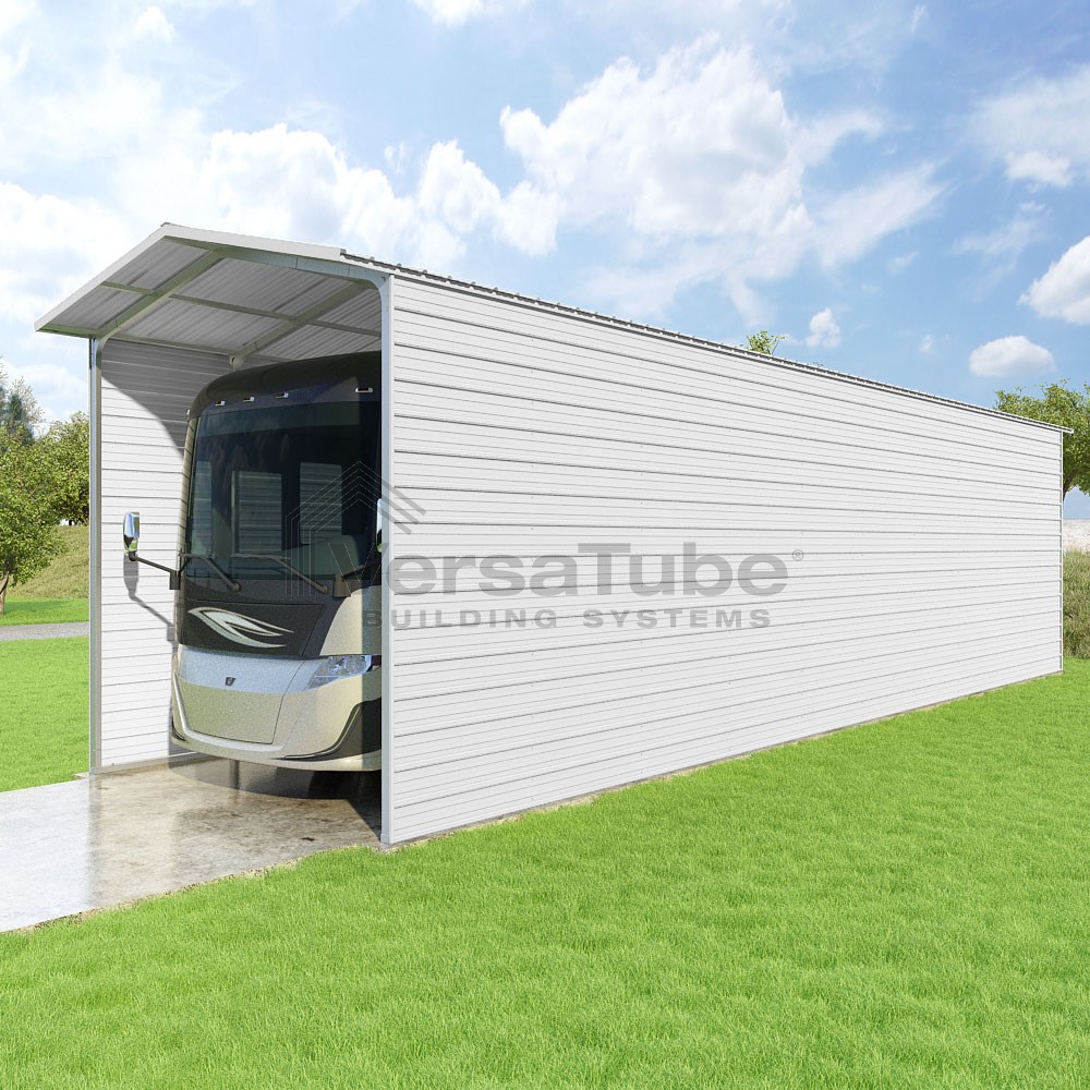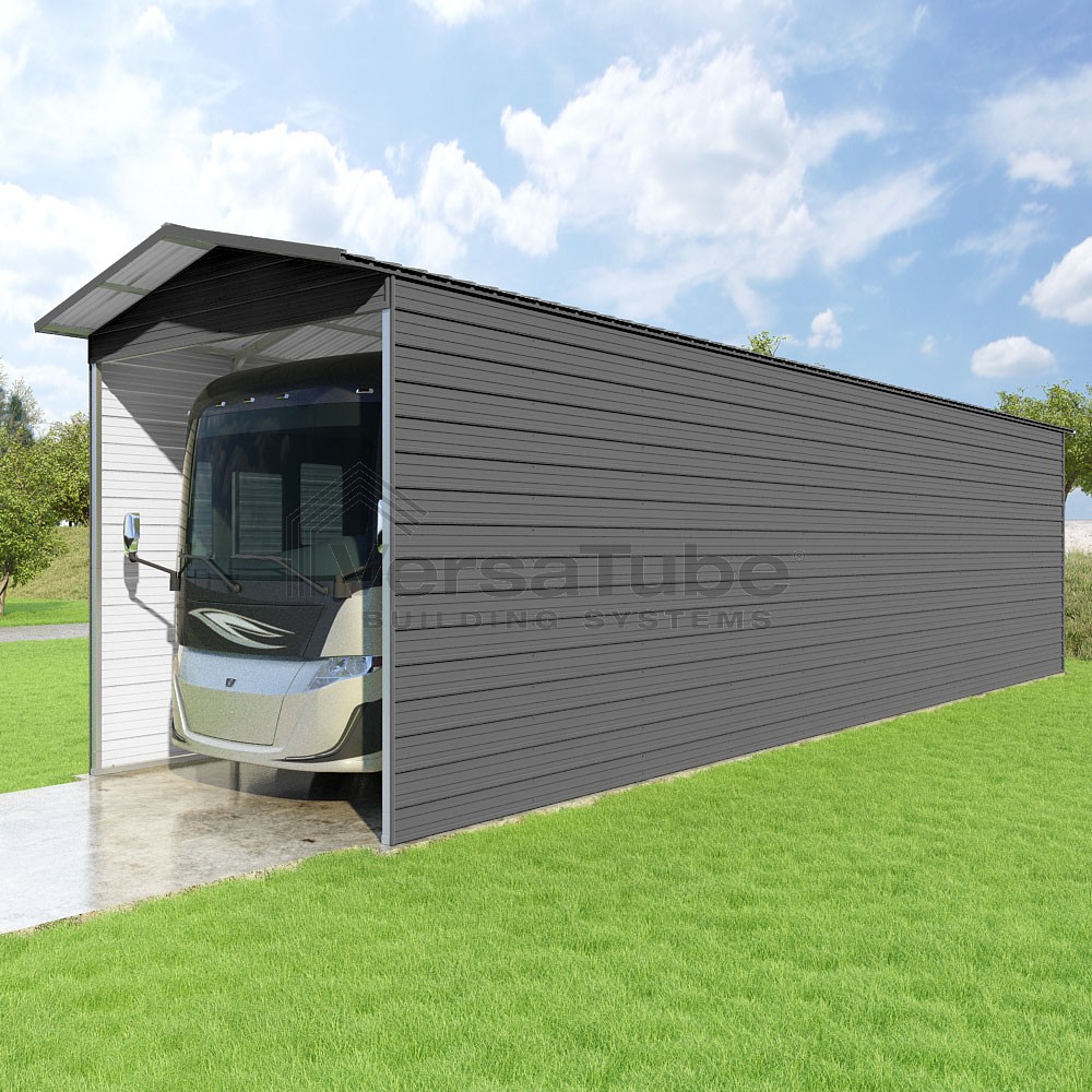 Pinnacle Series DIY carport kit features vertical sheet metal roof panels with ridge cap, gable and eave trim for an A-frame roof style and extended coverage on both ends.