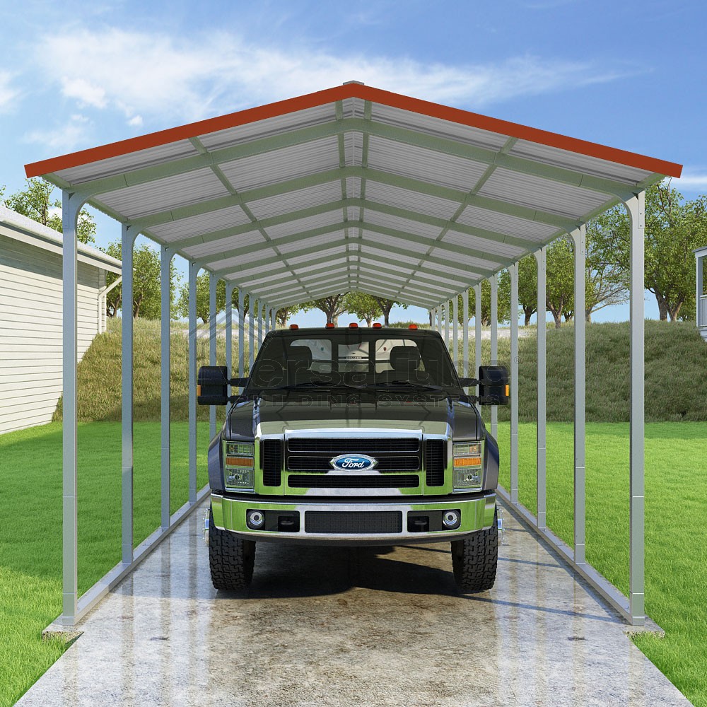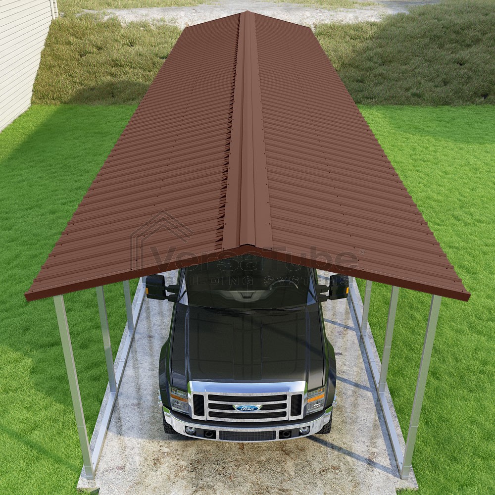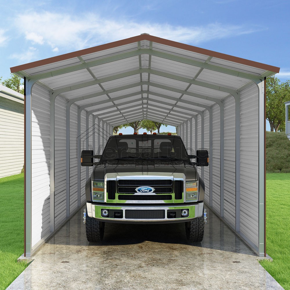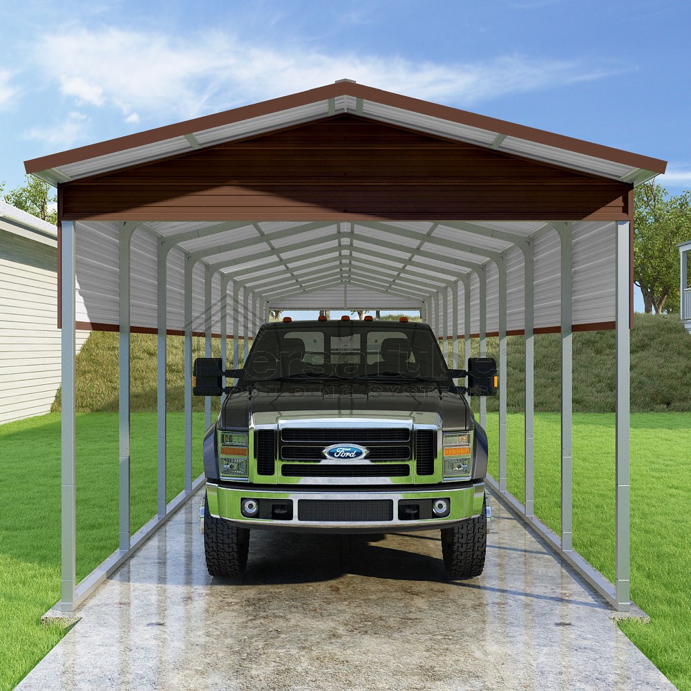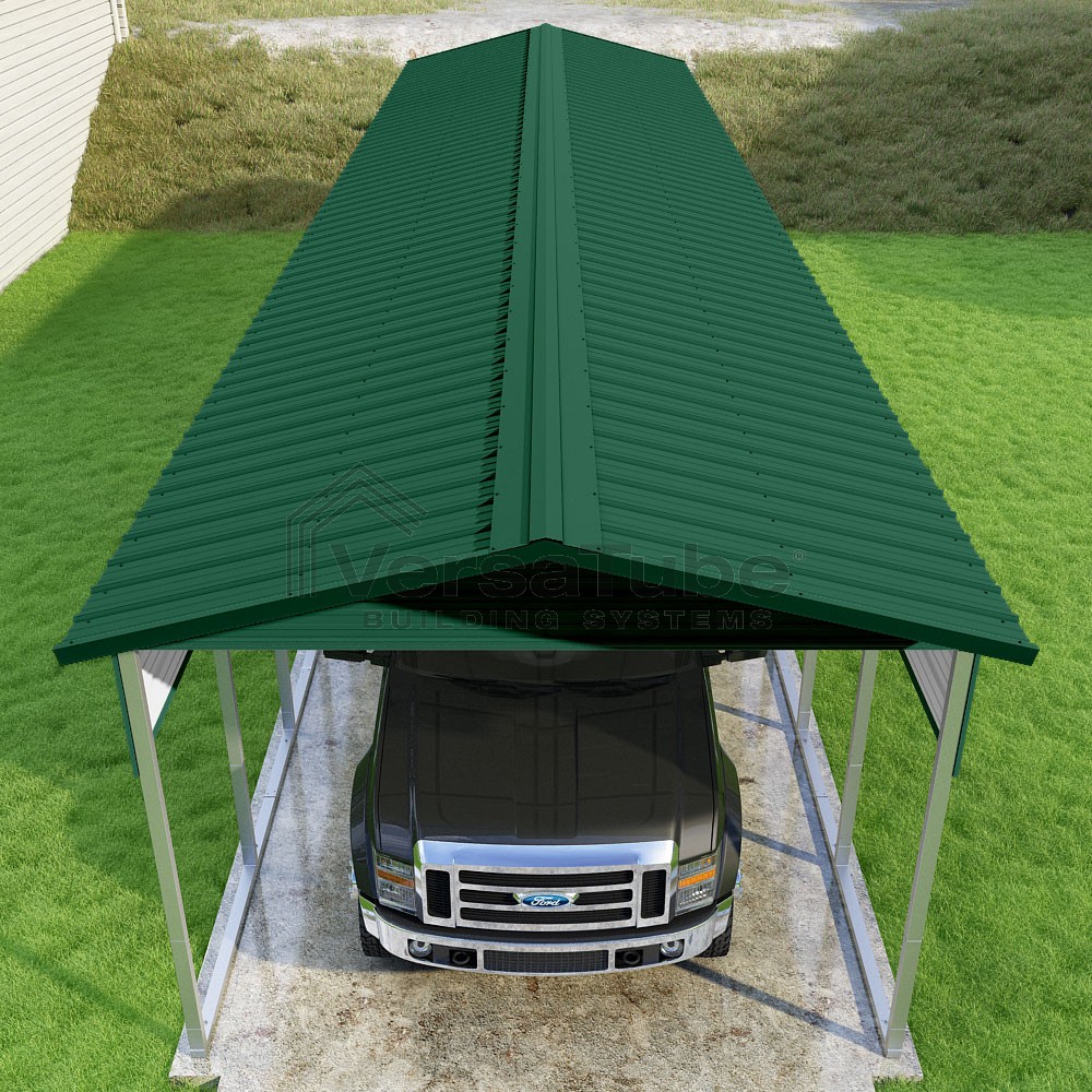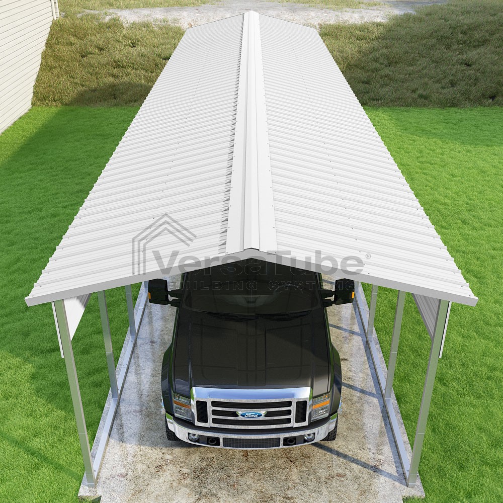 Pinnacle Series DIY carport kit features vertical sheet metal roof panels with ridge cap, gable and eave trim for an A-frame roof style and extended coverage on both ends.