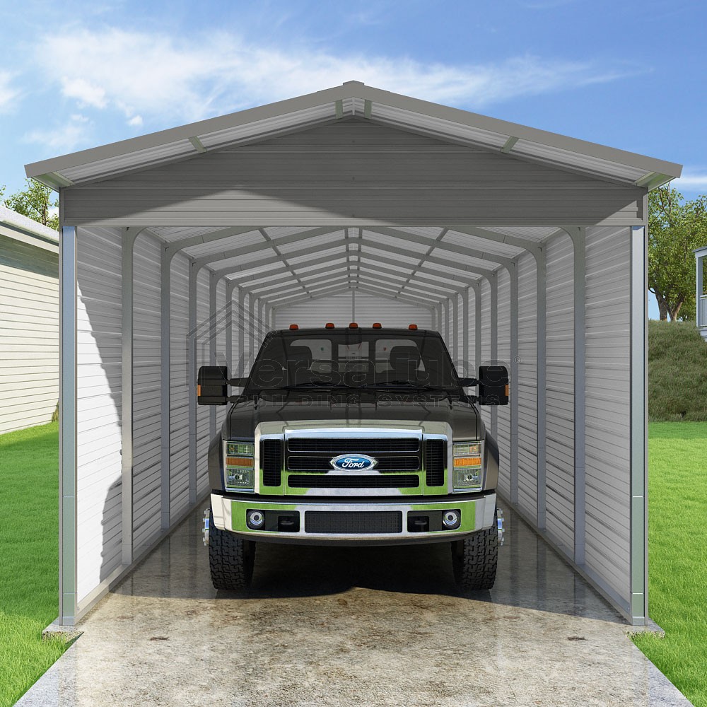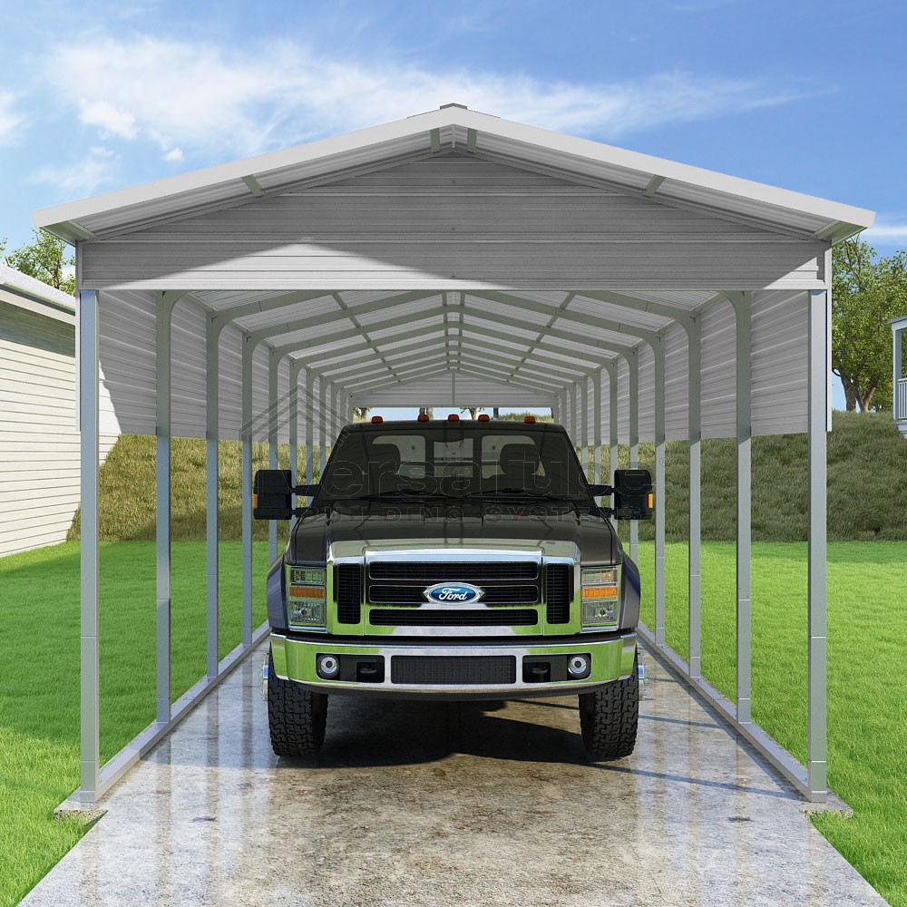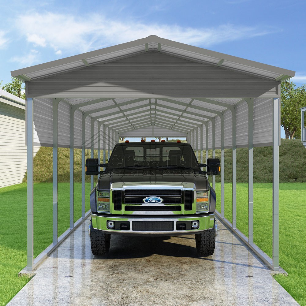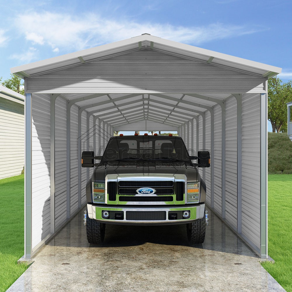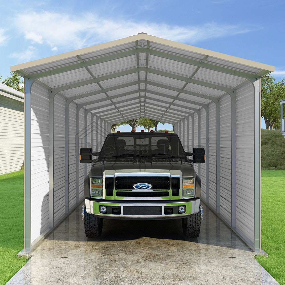 Pinnacle Series DIY carport kit features vertical sheet metal roof panels with ridge cap, gable and eave trim for an A-frame roof style and extended coverage on both ends.