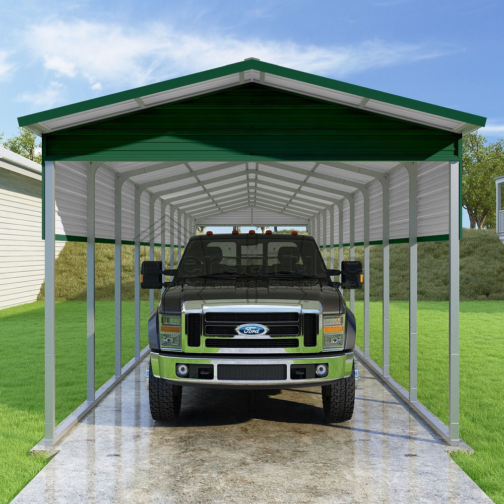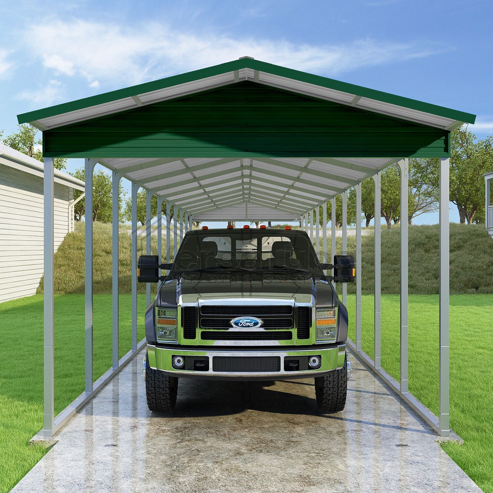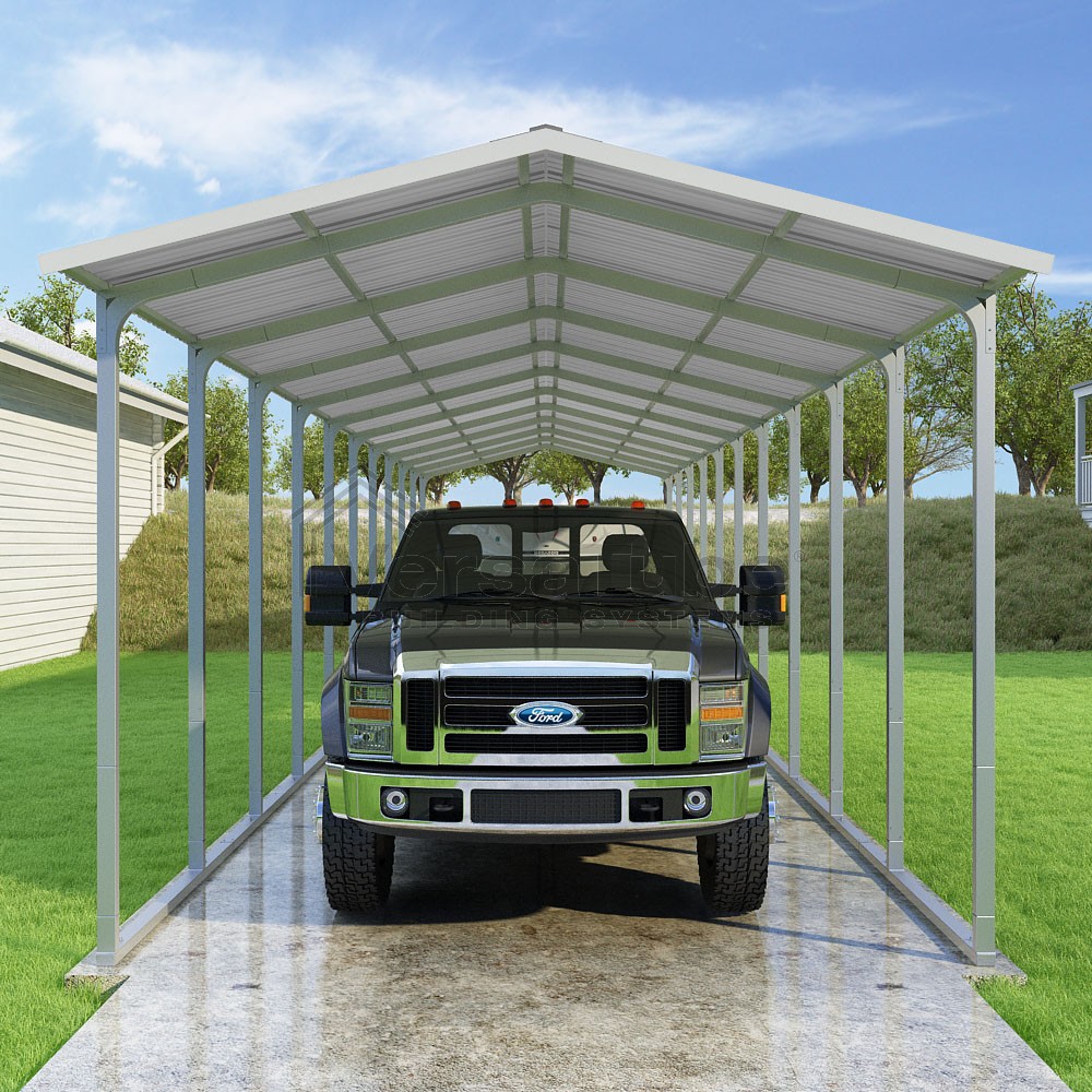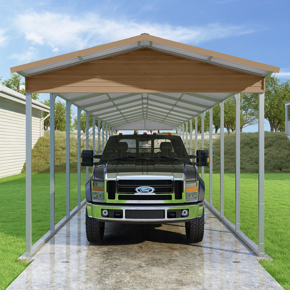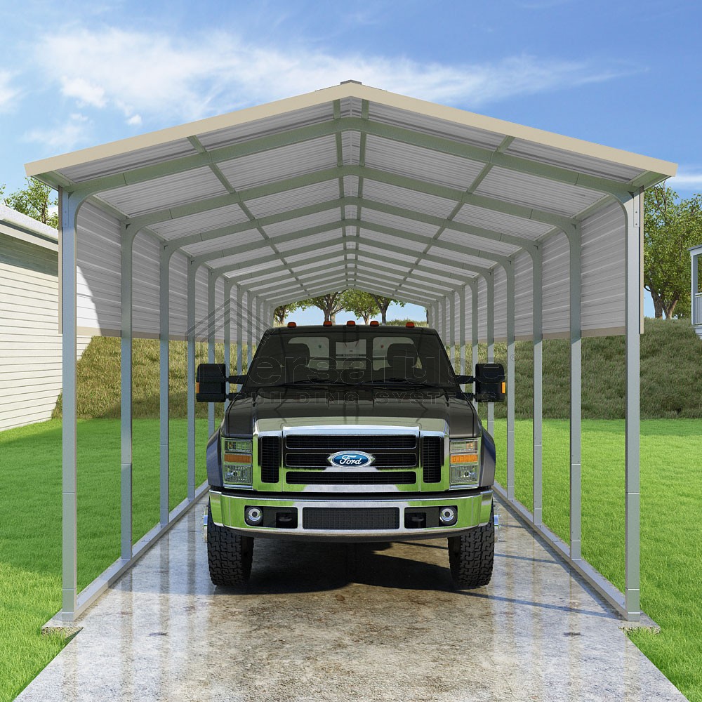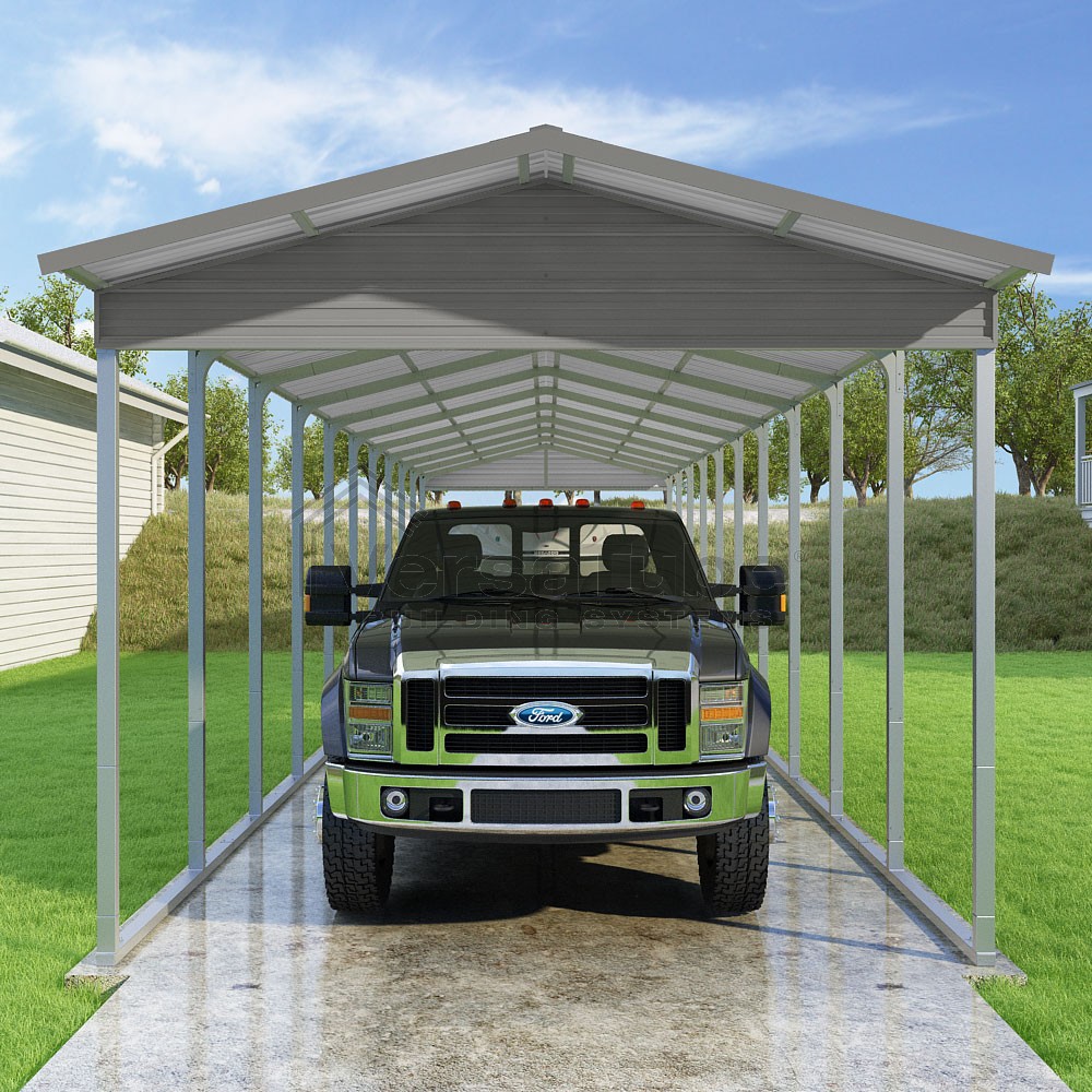Pinnacle Series DIY carport kit features vertical sheet metal roof panels with ridge cap, gable and eave trim for an A-frame roof style and extended coverage on both ends.