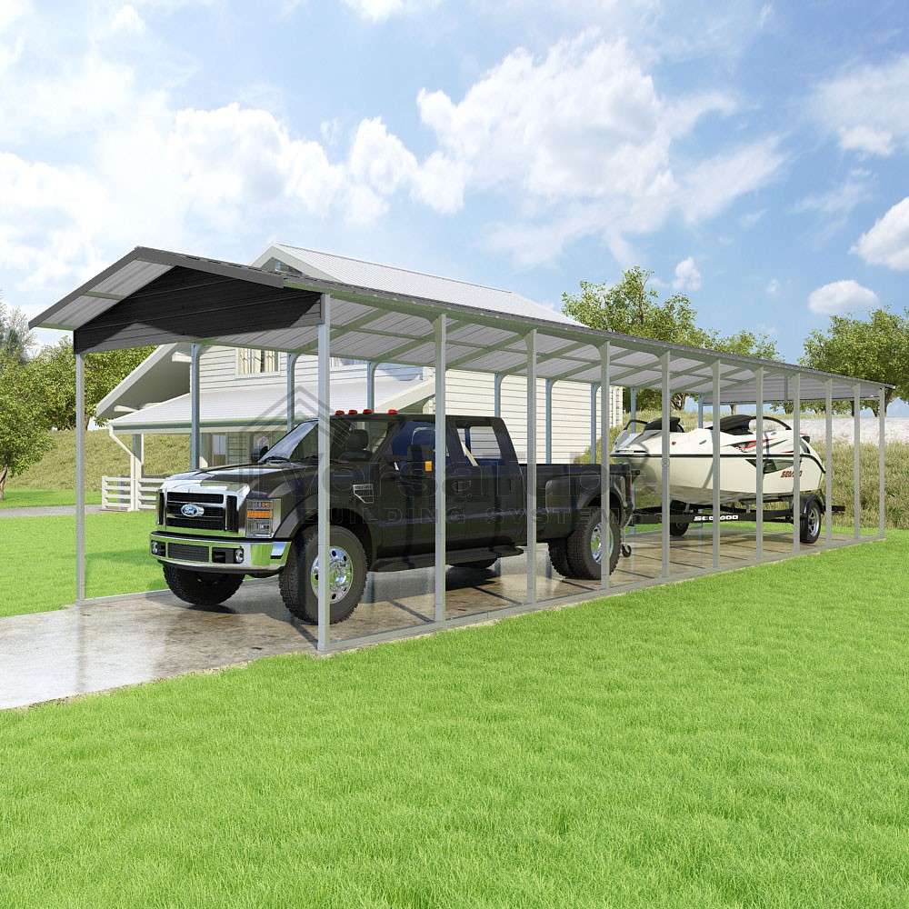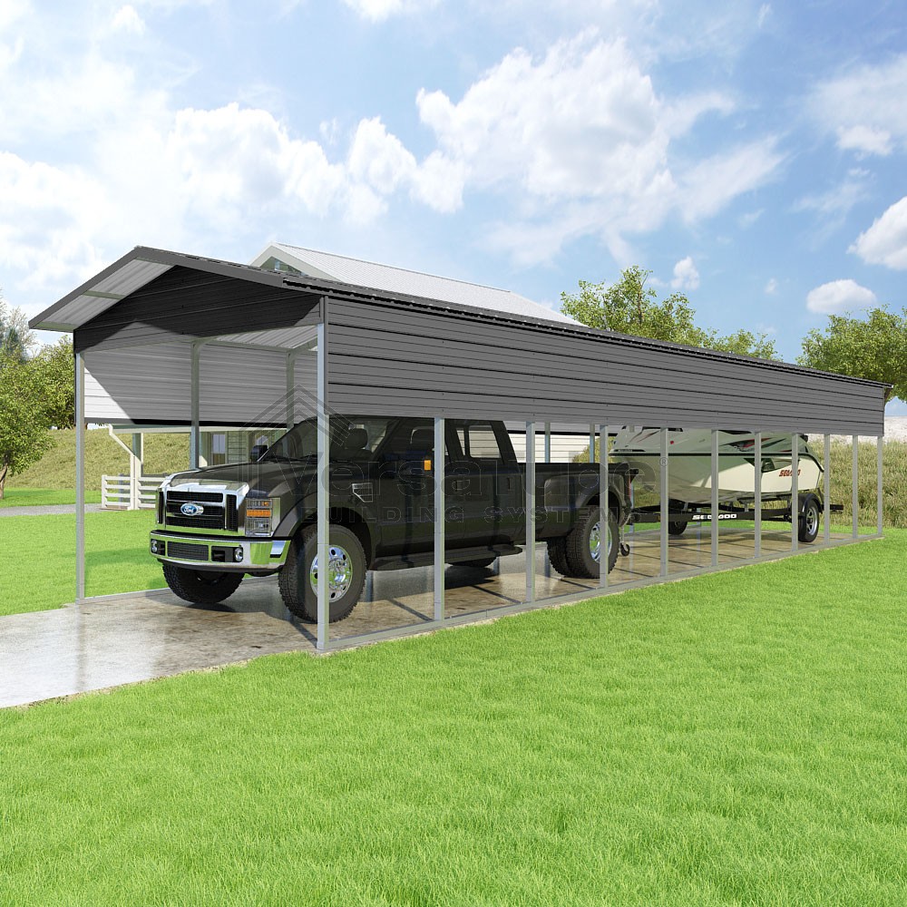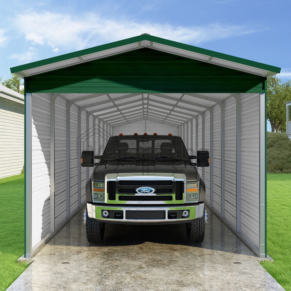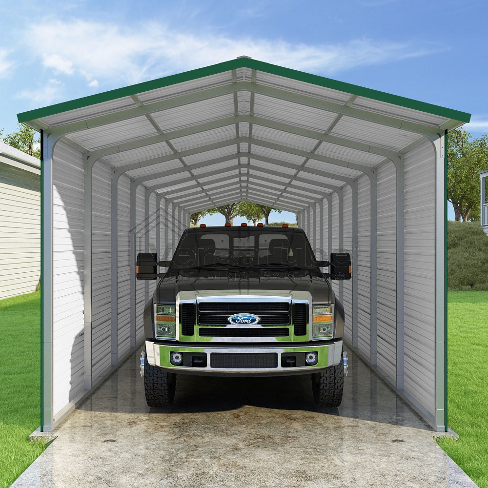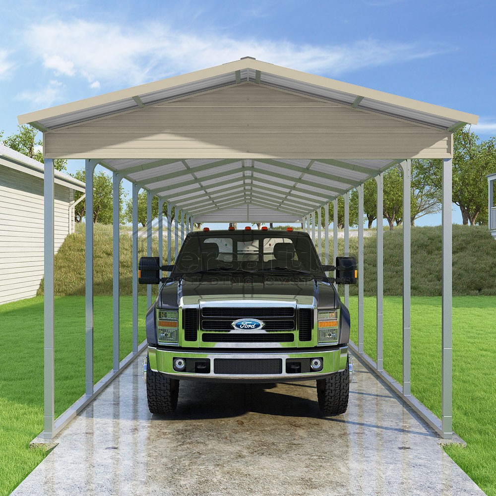 Pinnacle Series DIY carport kit features vertical sheet metal roof panels with ridge cap, gable and eave trim for an A-frame roof style and extended coverage on both ends.