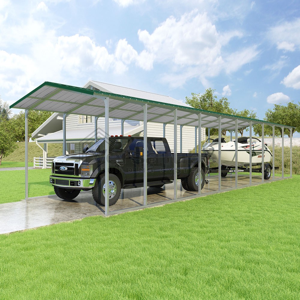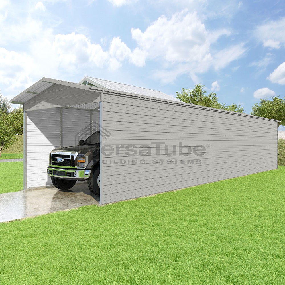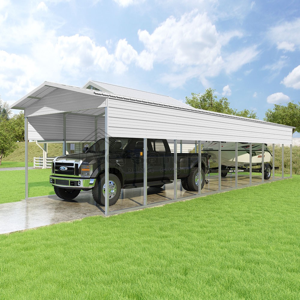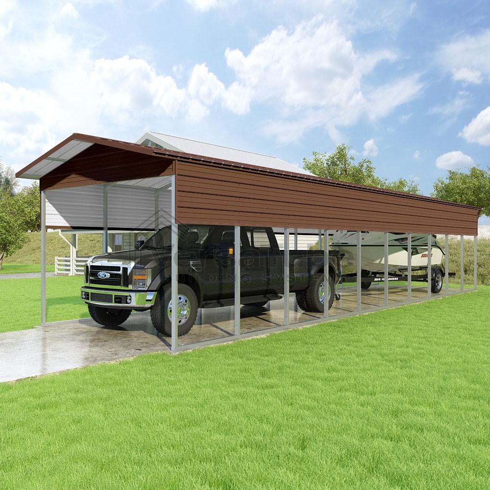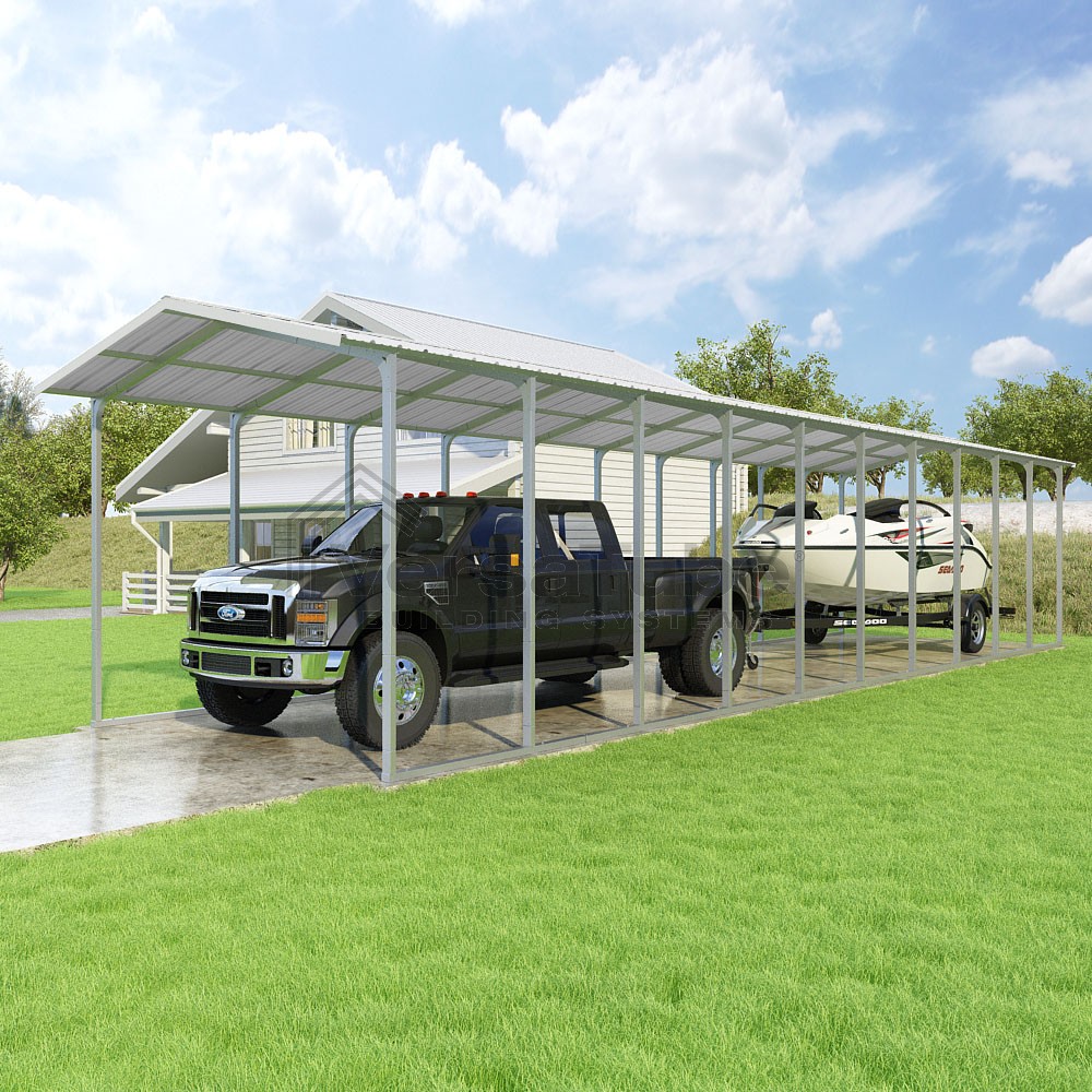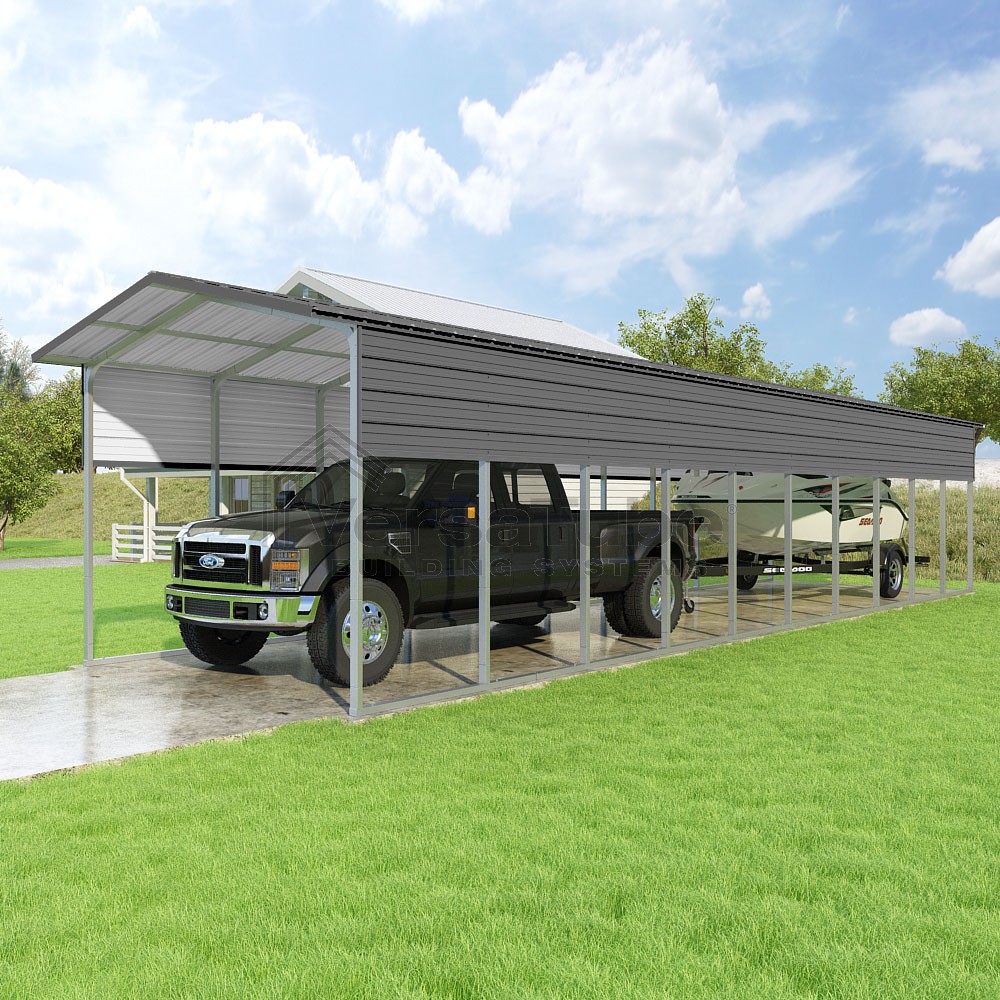 Pinnacle Series DIY carport kit features vertical sheet metal roof panels with ridge cap, gable and eave trim for an A-frame roof style and extended coverage on both ends.