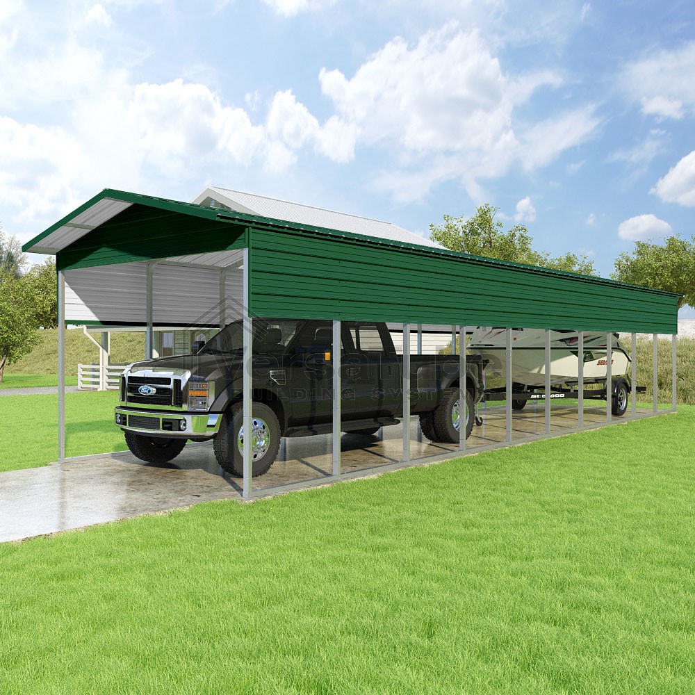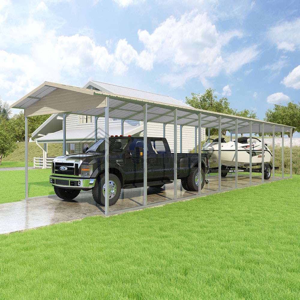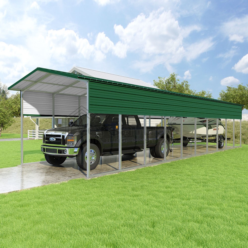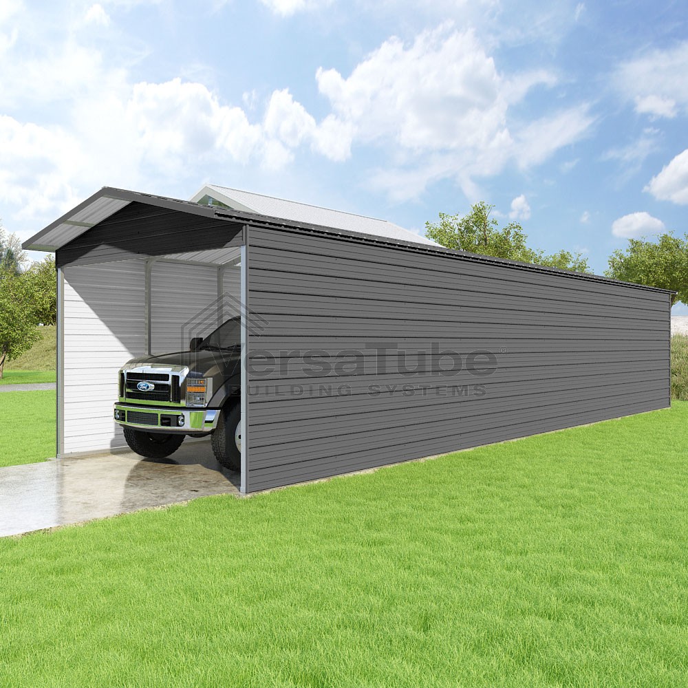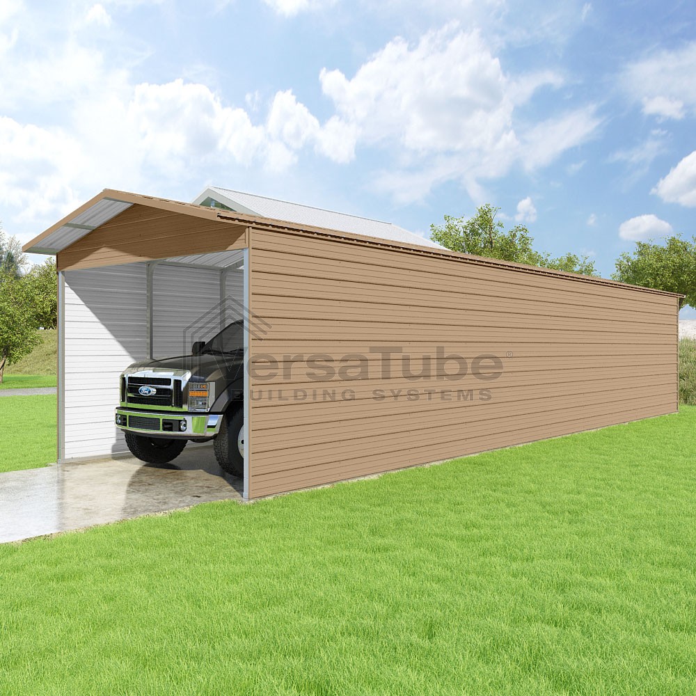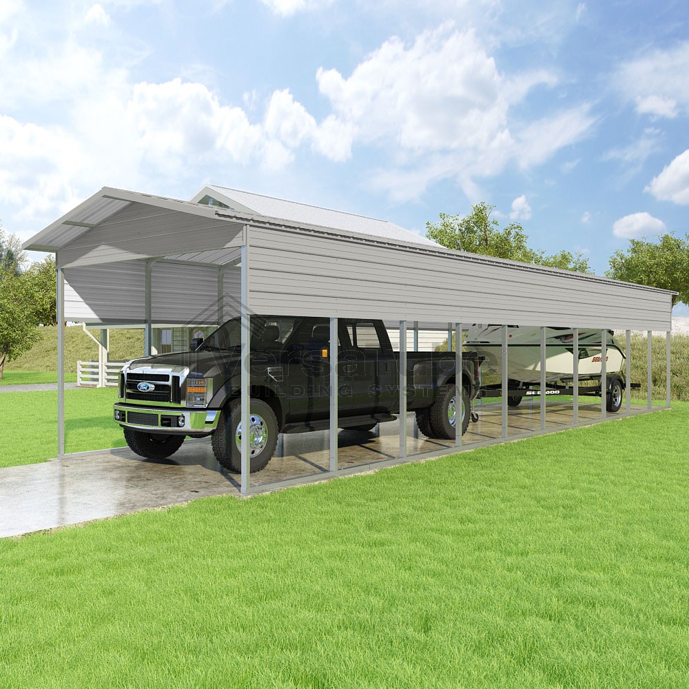 Pinnacle Series DIY carport kit features vertical sheet metal roof panels with ridge cap, gable and eave trim for an A-frame roof style and extended coverage on both ends.