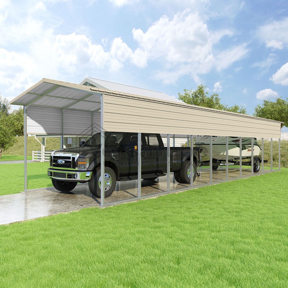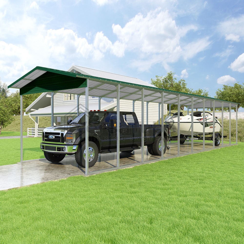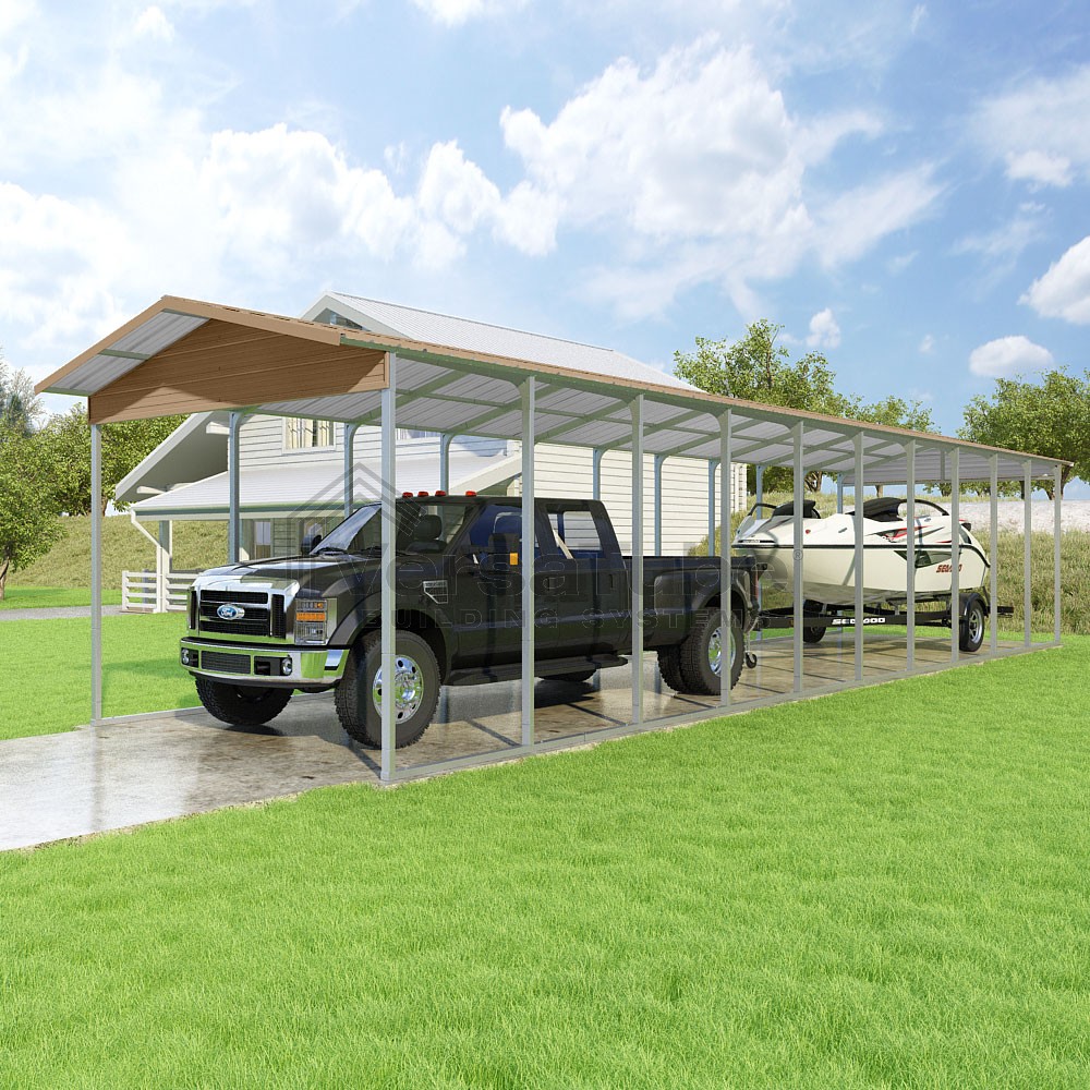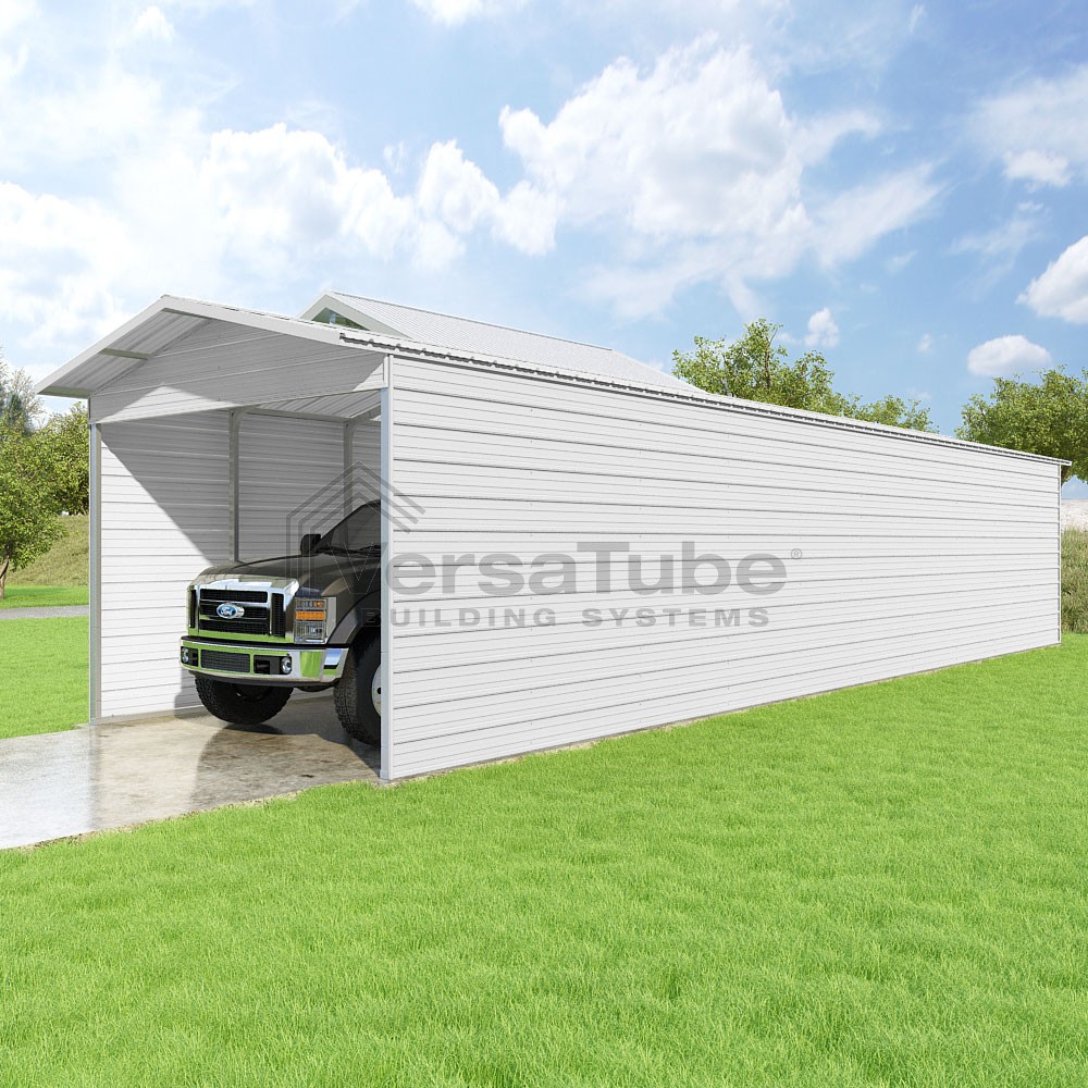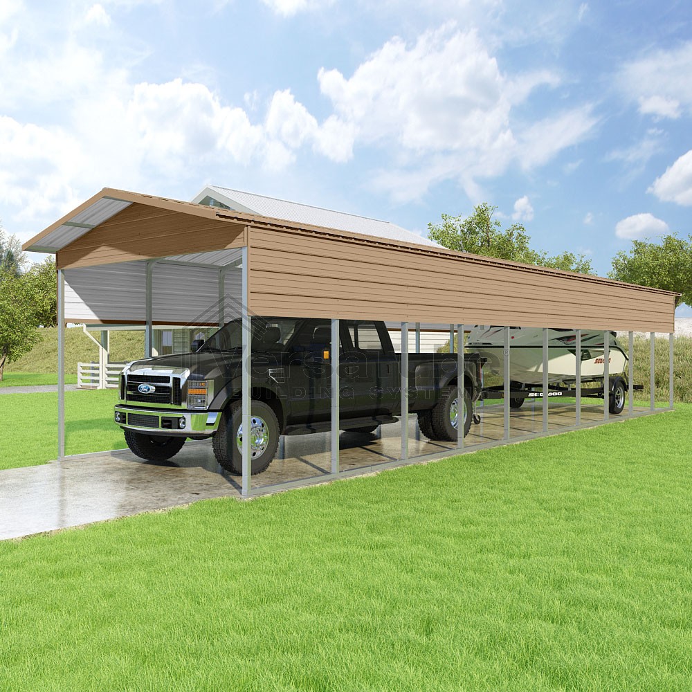 Pinnacle Series DIY carport kit features vertical sheet metal roof panels with ridge cap, gable and eave trim for an A-frame roof style and extended coverage on both ends.