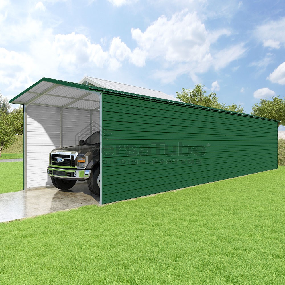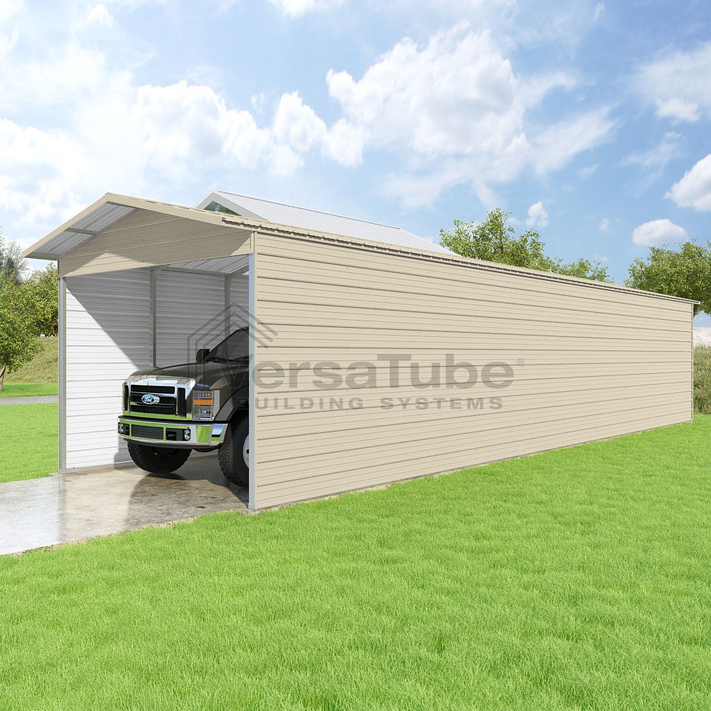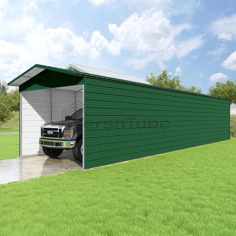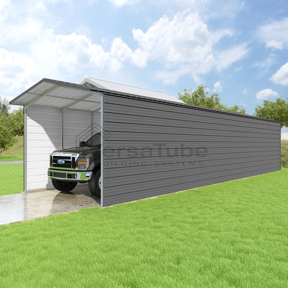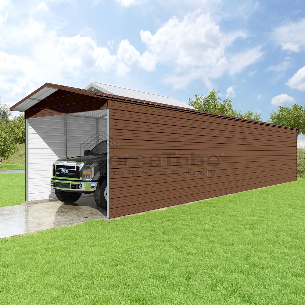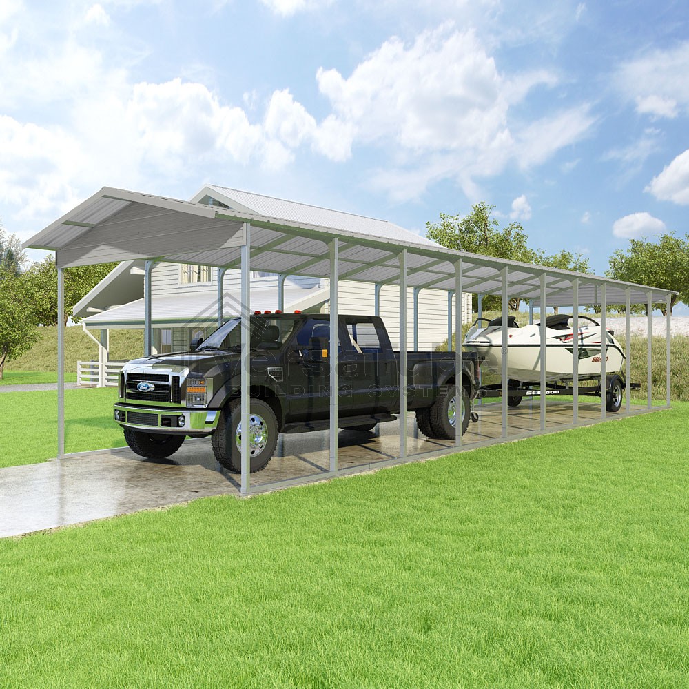 Pinnacle Series DIY carport kit features vertical sheet metal roof panels with ridge cap, gable and eave trim for an A-frame roof style and extended coverage on both ends.