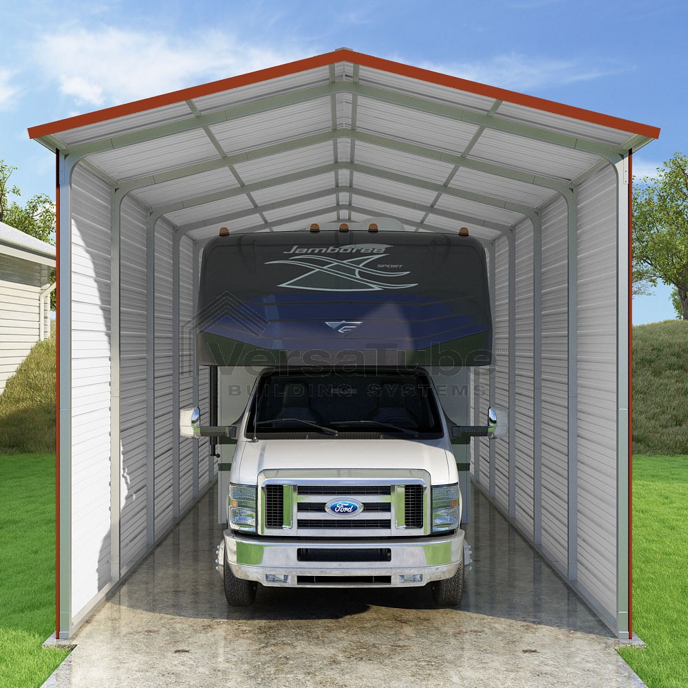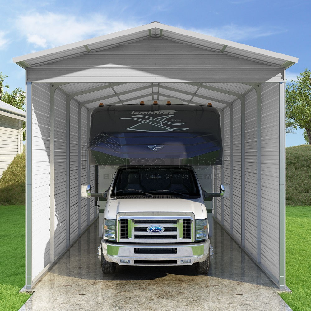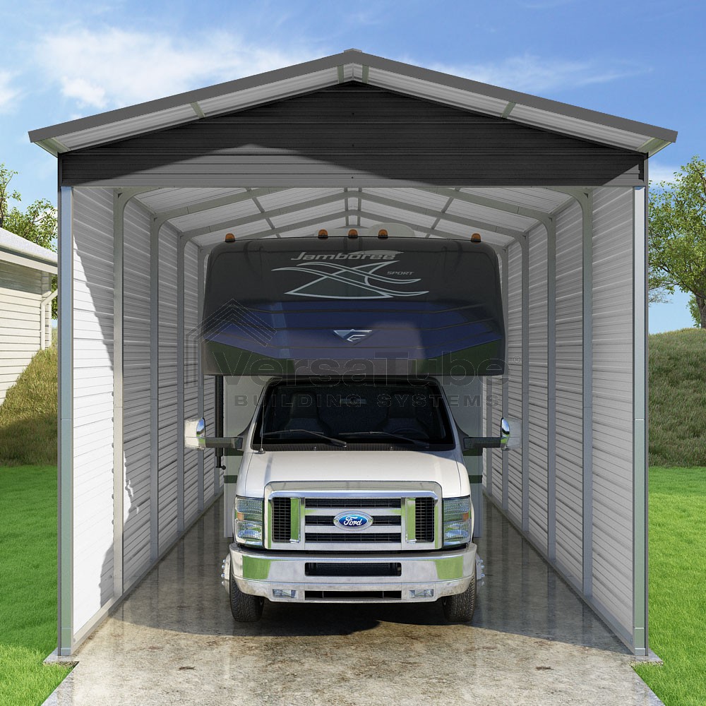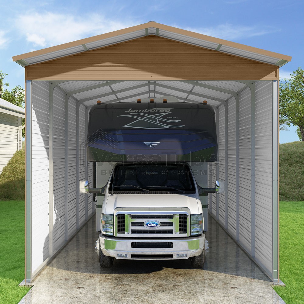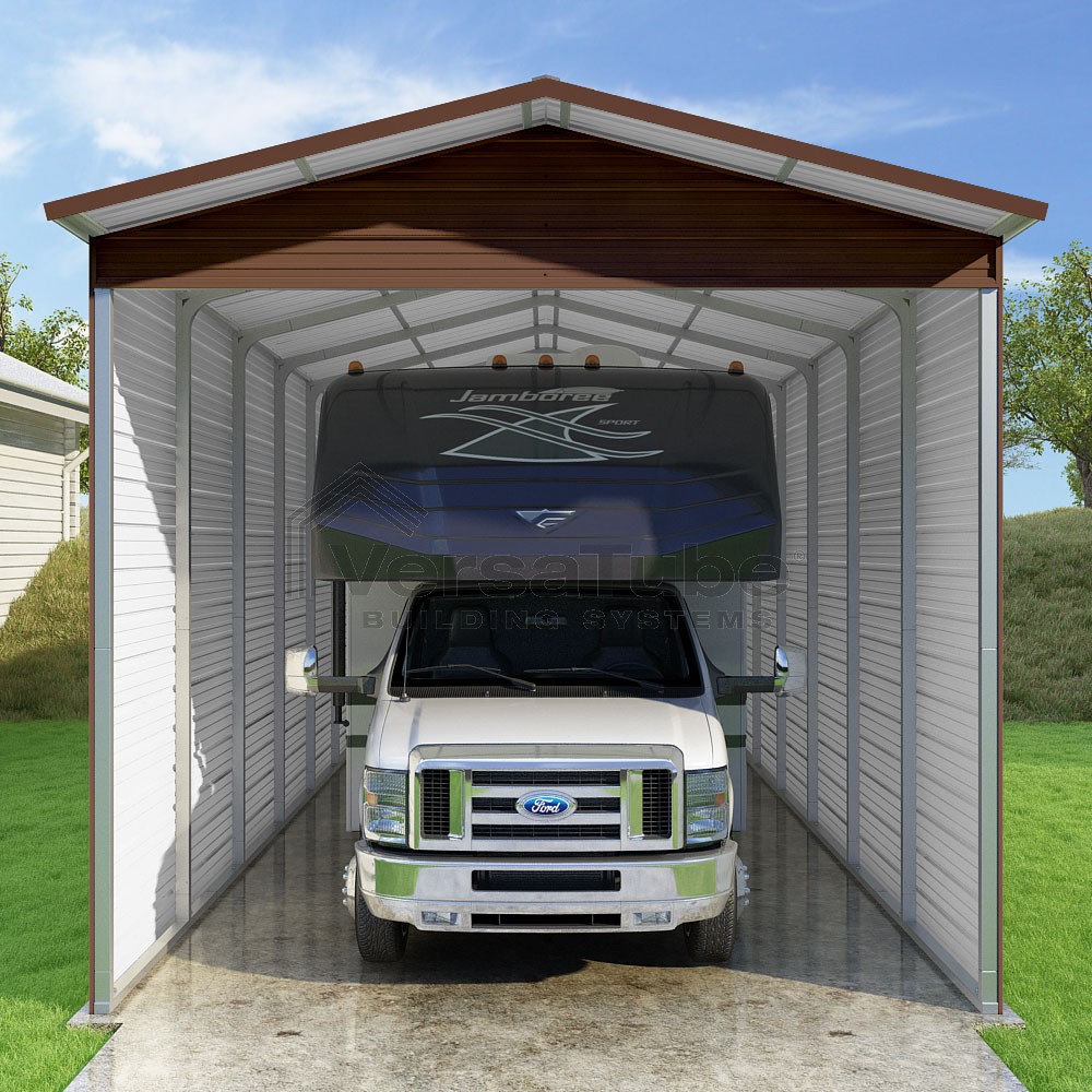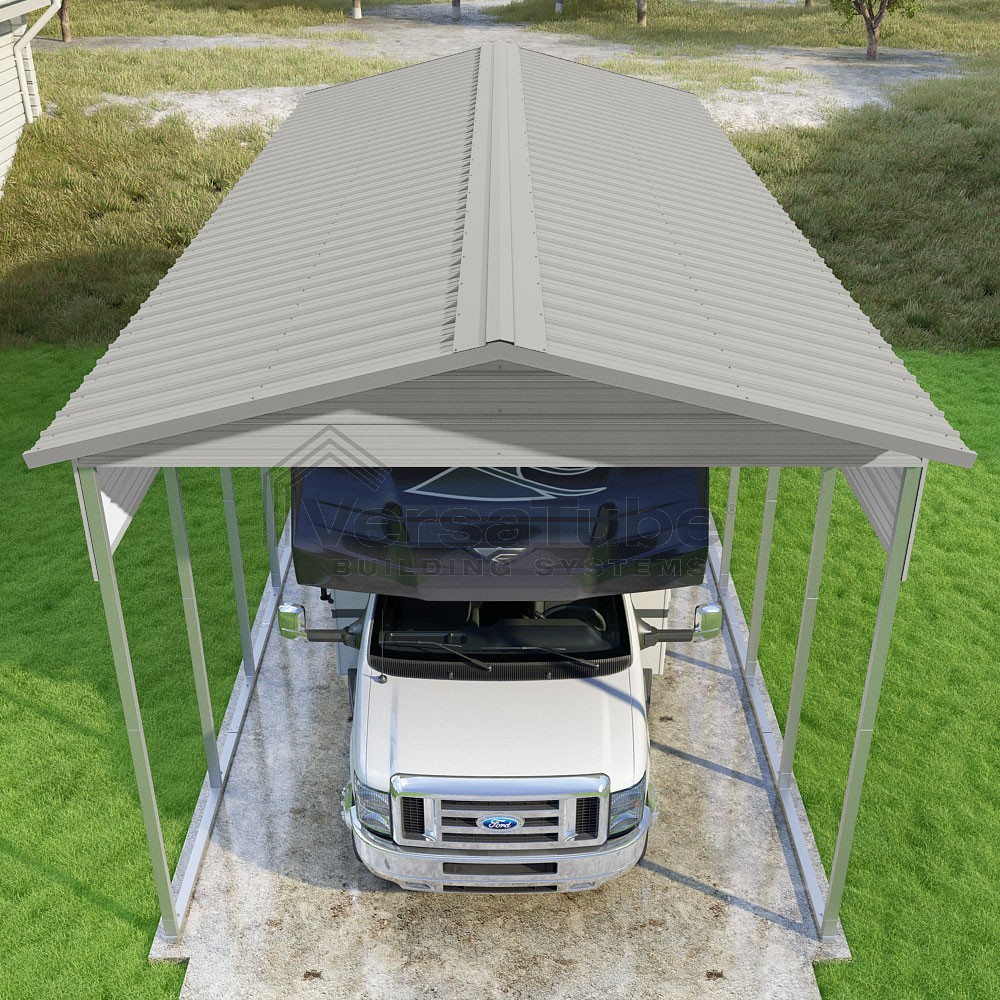 Pinnacle Series DIY carport kit features vertical sheet metal roof panels with ridge cap, gable and eave trim for an A-frame roof style and extended coverage on both ends.