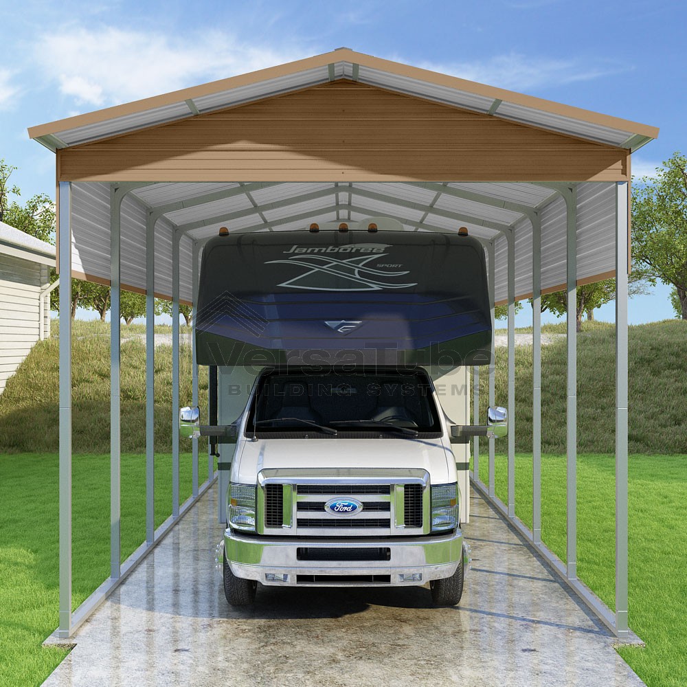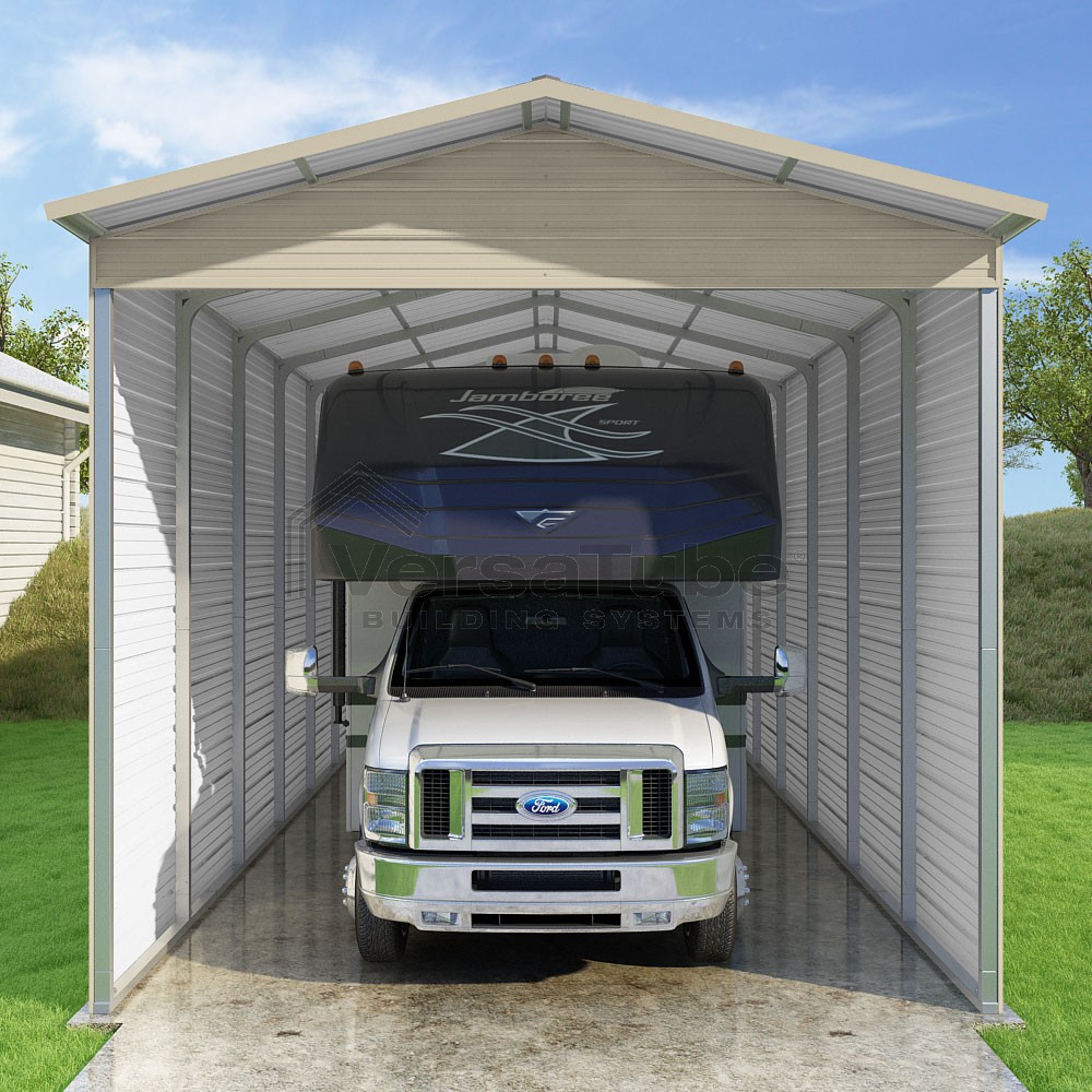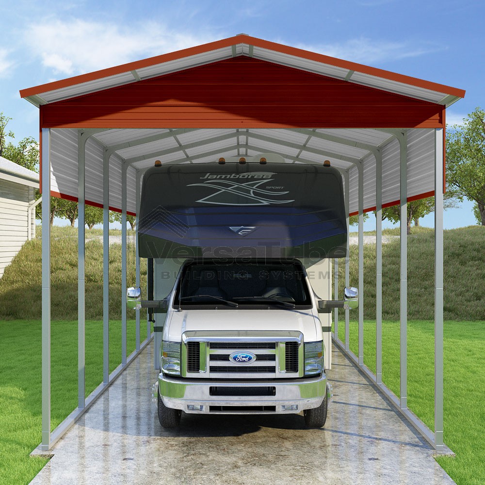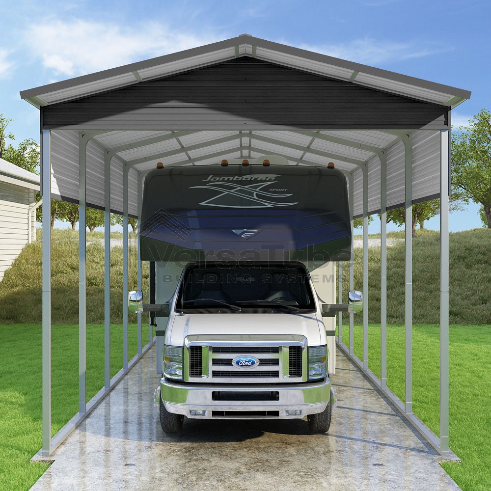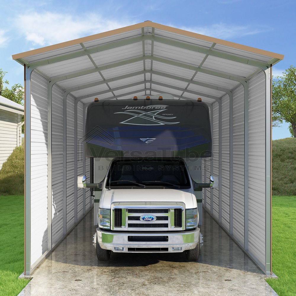Pinnacle Series DIY carport kit features vertical sheet metal roof panels with ridge cap, gable and eave trim for an A-frame roof style and extended coverage on both ends.