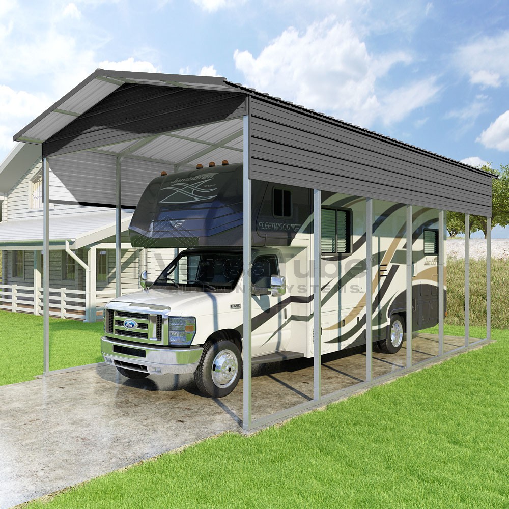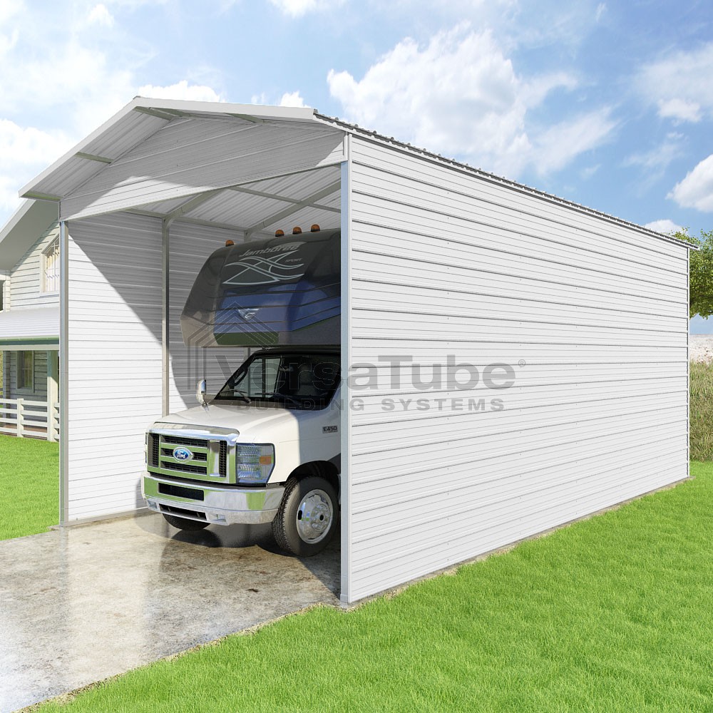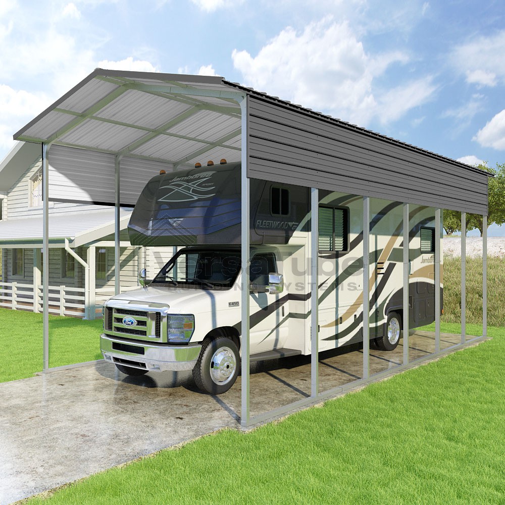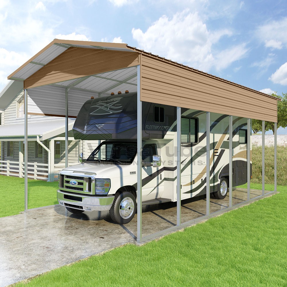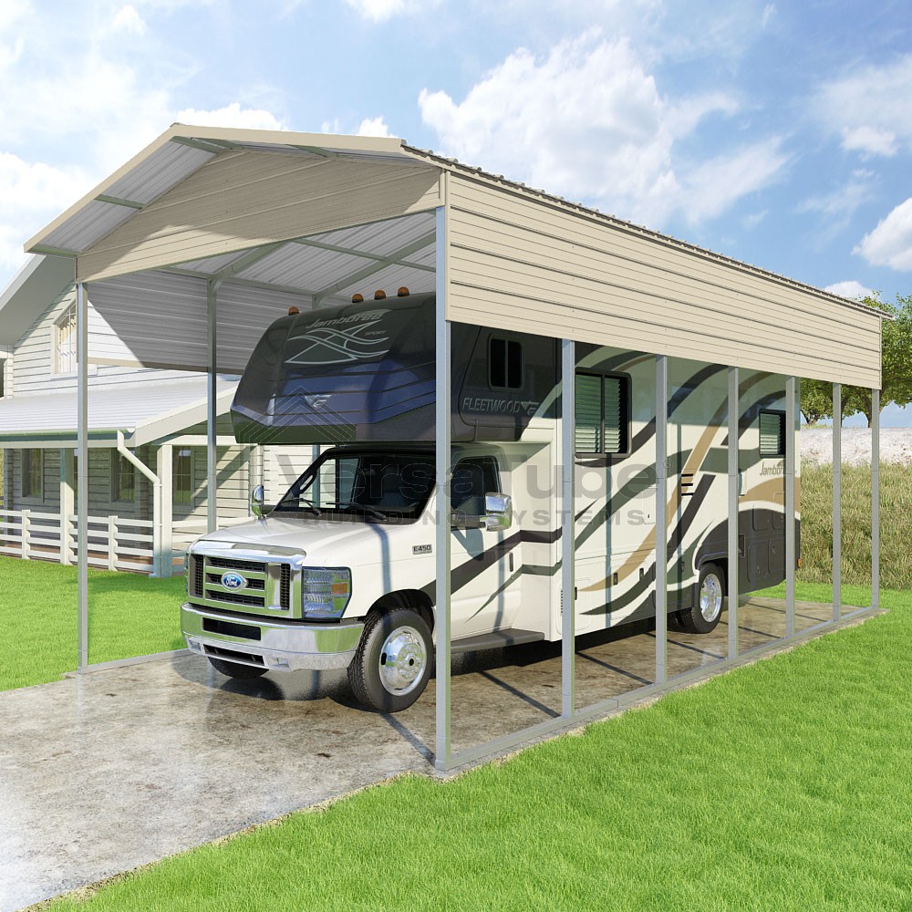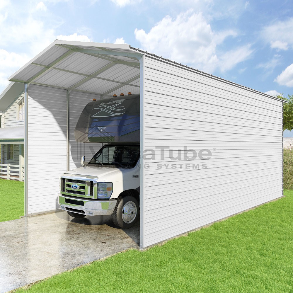 Pinnacle Series DIY carport kit features vertical sheet metal roof panels with ridge cap, gable and eave trim for an A-frame roof style and extended coverage on both ends.