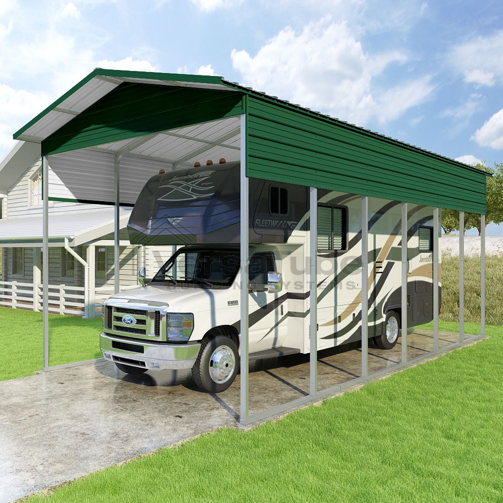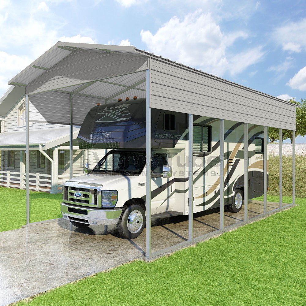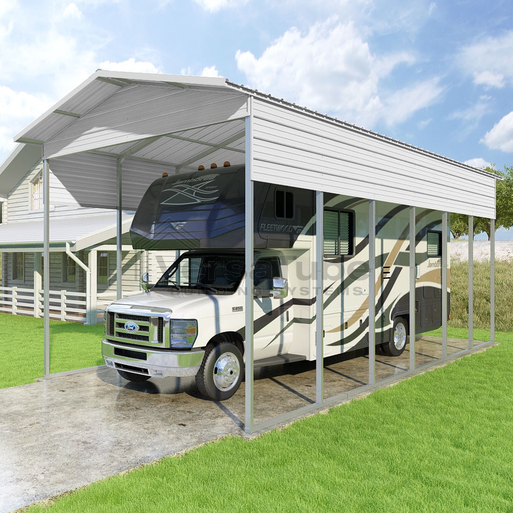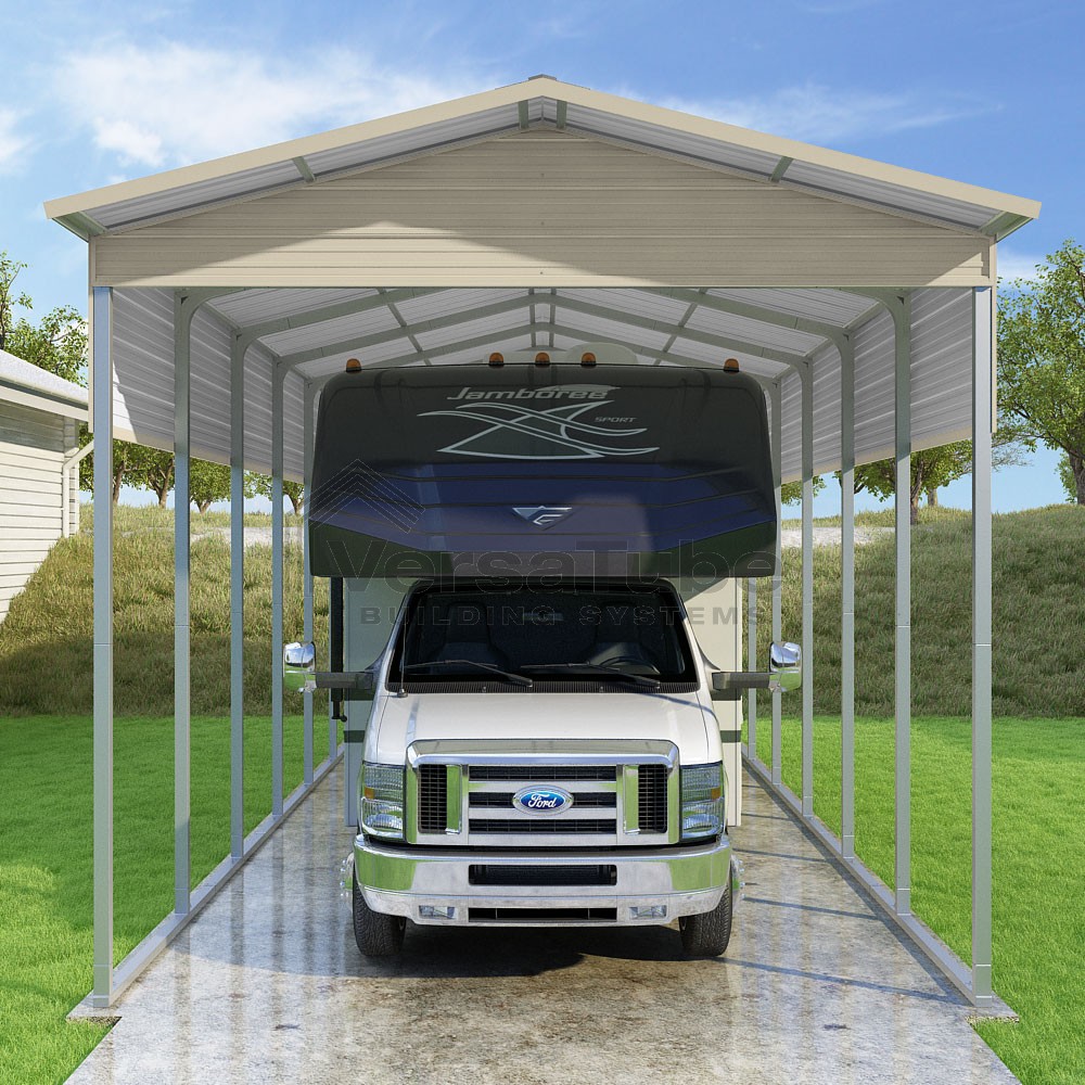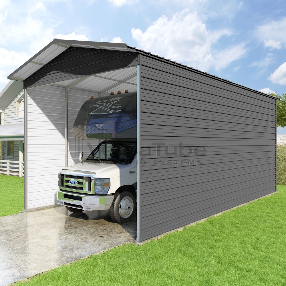 Pinnacle Series DIY carport kit features vertical sheet metal roof panels with ridge cap, gable and eave trim for an A-frame roof style and extended coverage on both ends.