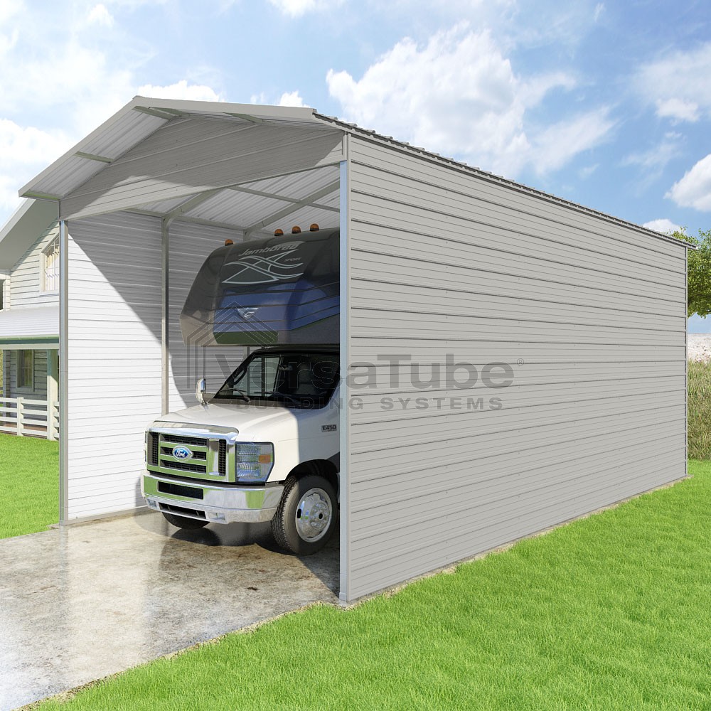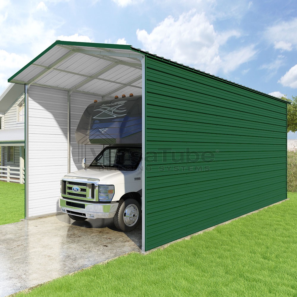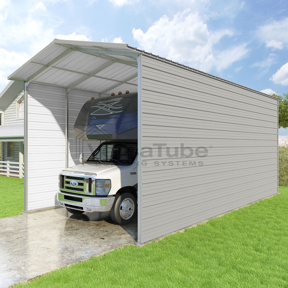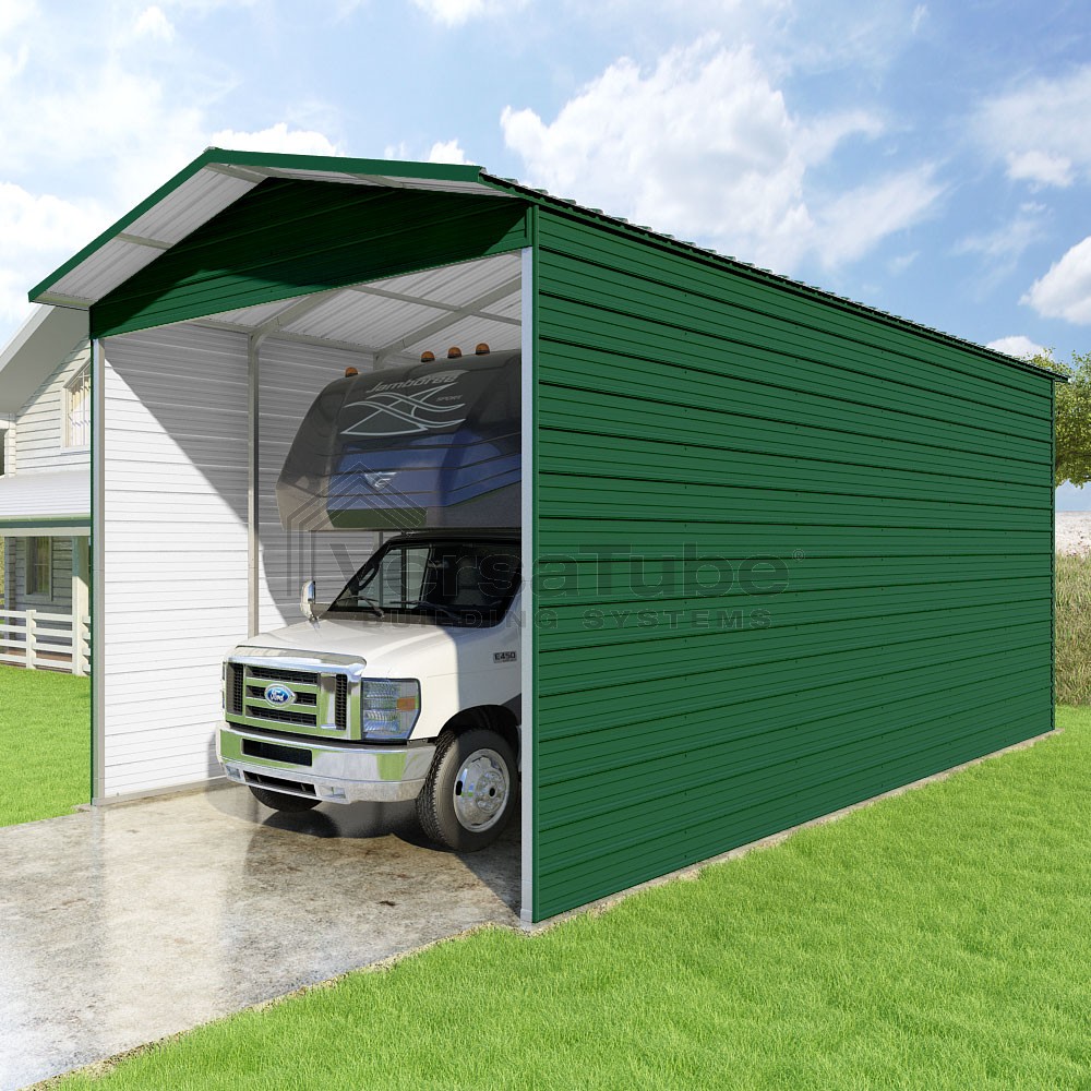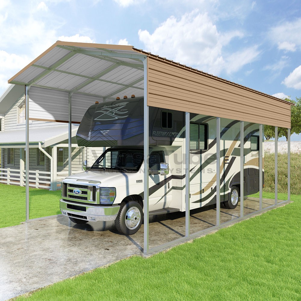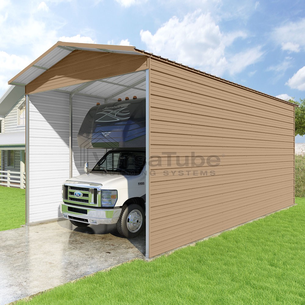 Pinnacle Series DIY carport kit features vertical sheet metal roof panels with ridge cap, gable and eave trim for an A-frame roof style and extended coverage on both ends.