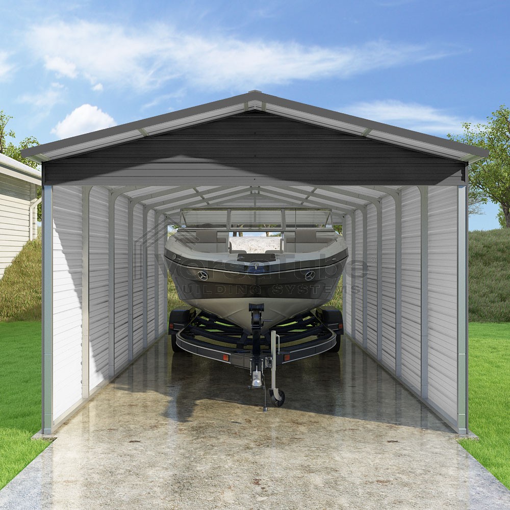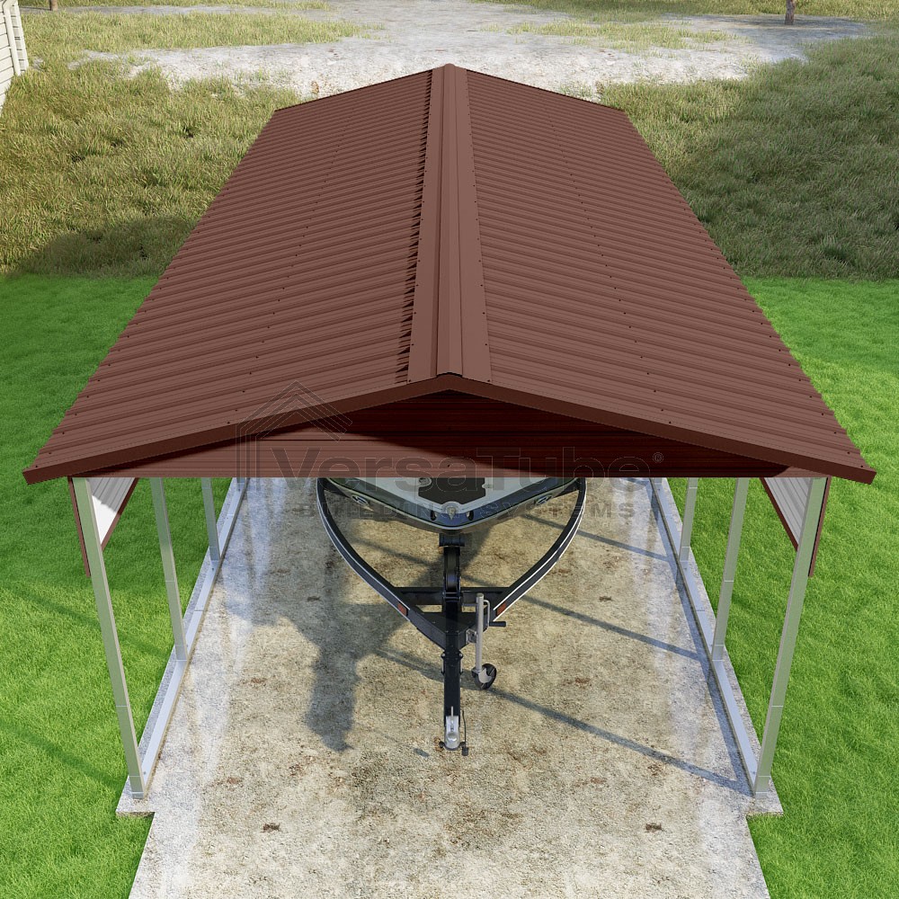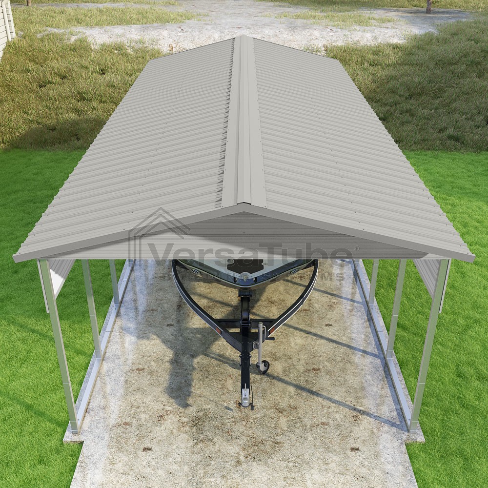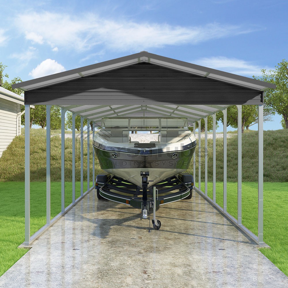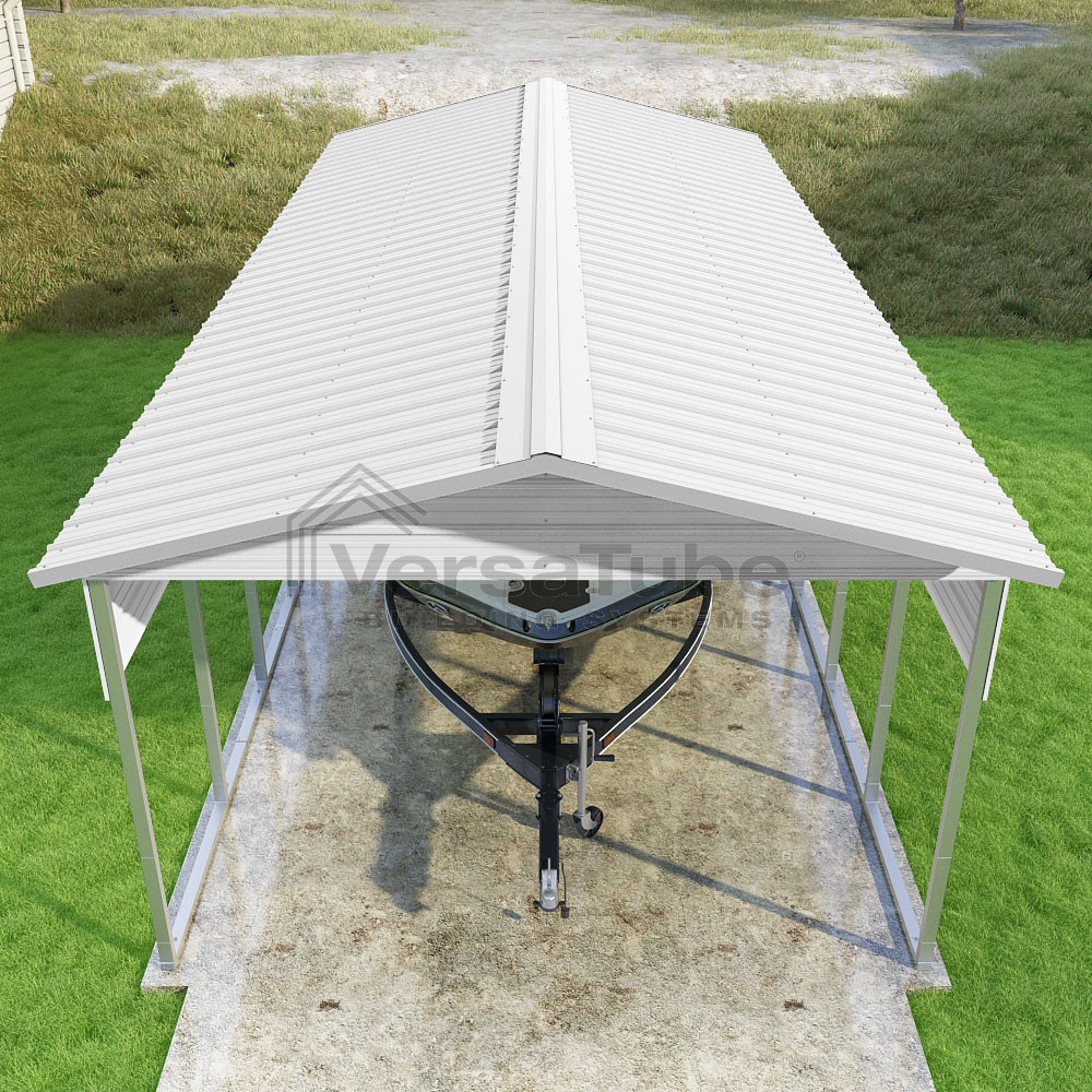 Pinnacle Series DIY carport kit features vertical sheet metal roof panels with ridge cap, gable and eave trim for an A-frame roof style and extended coverage on both ends.