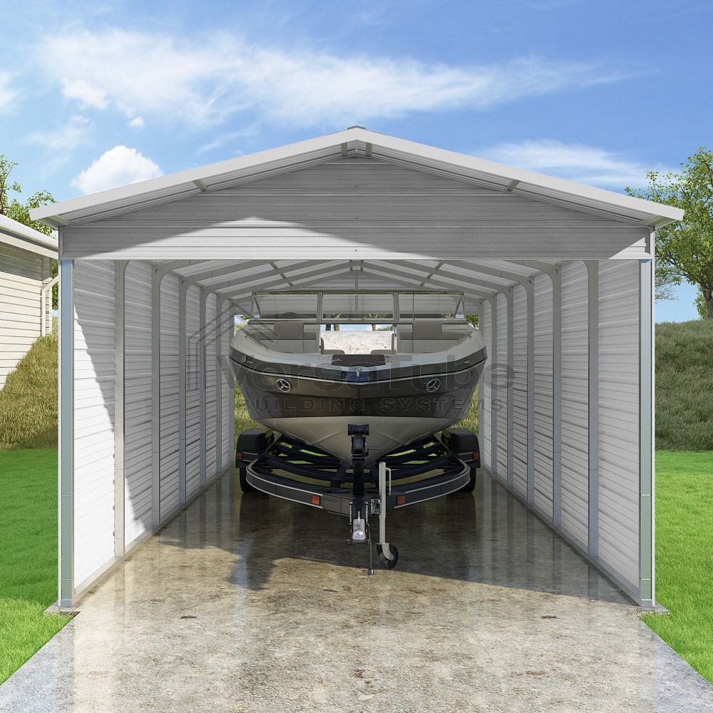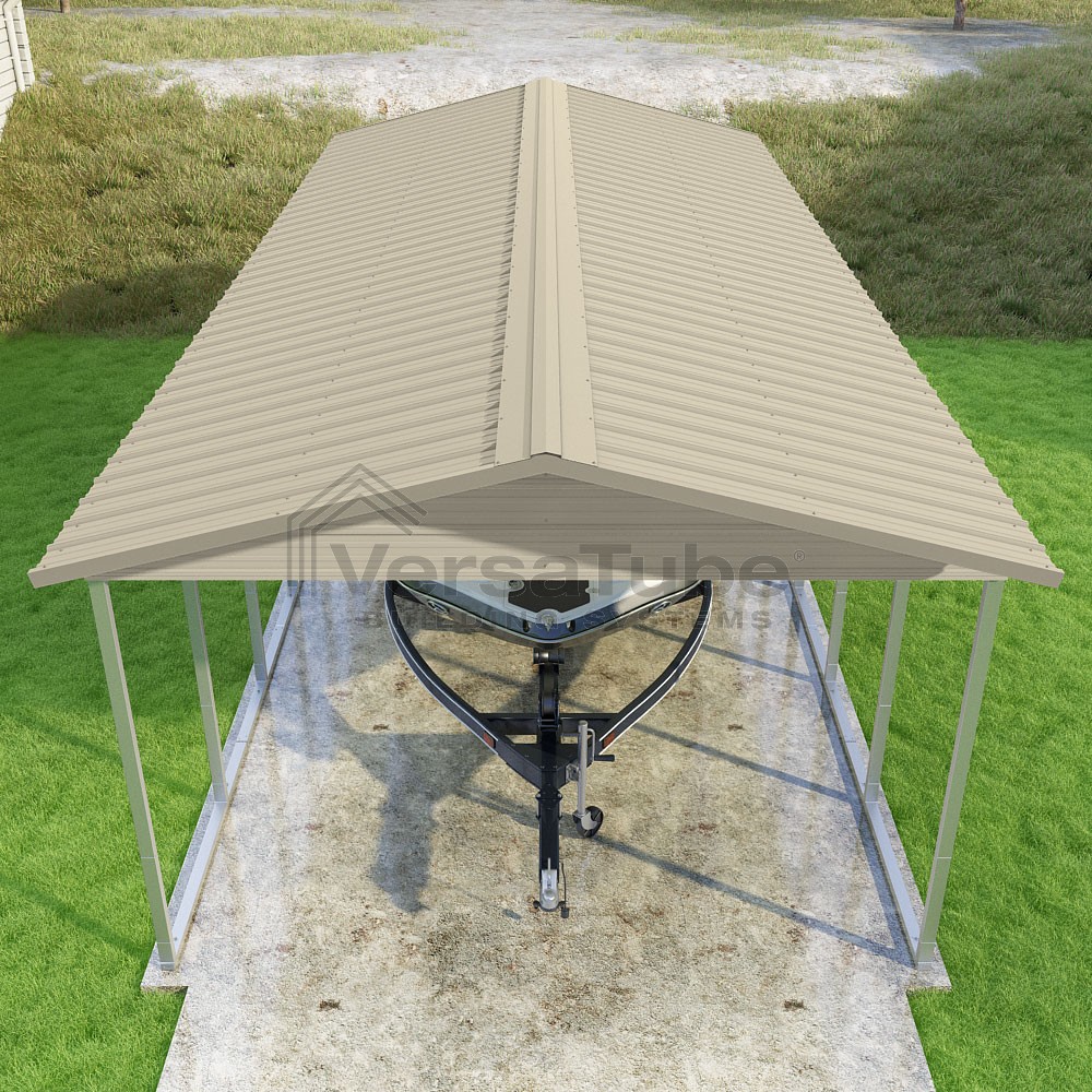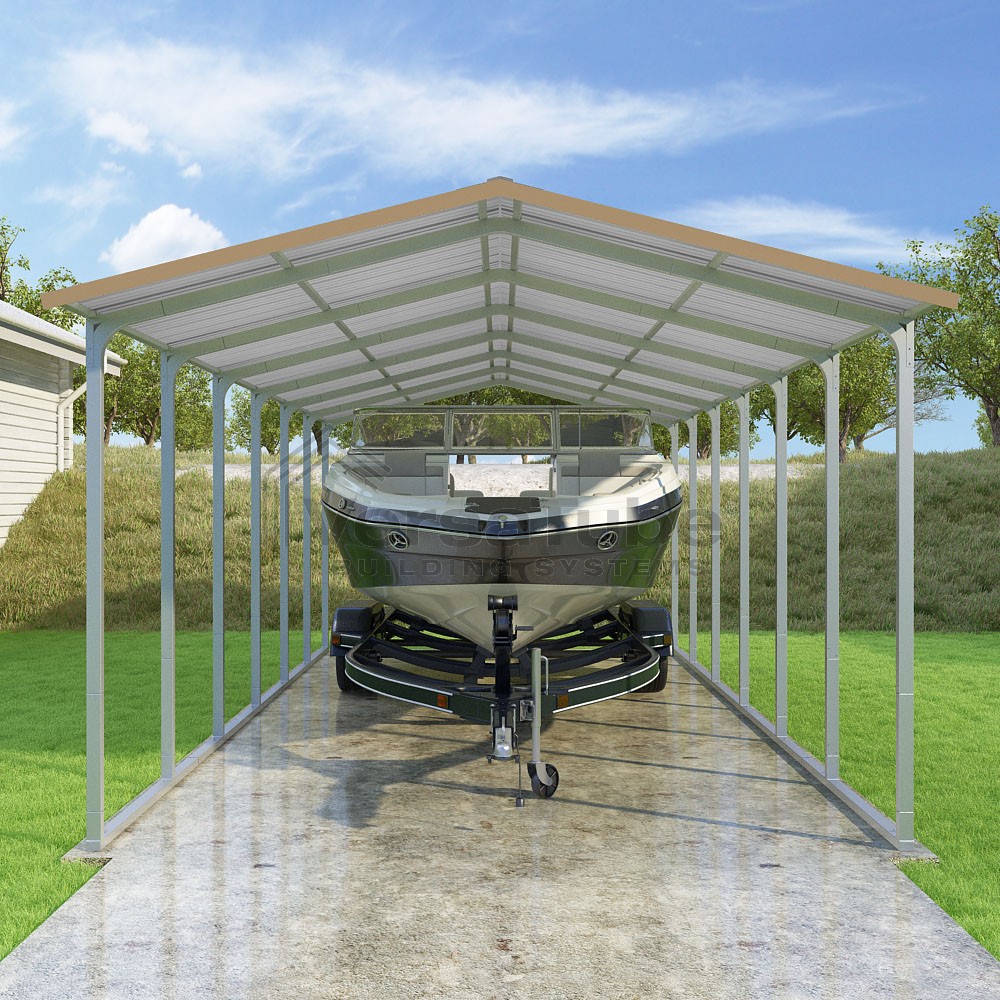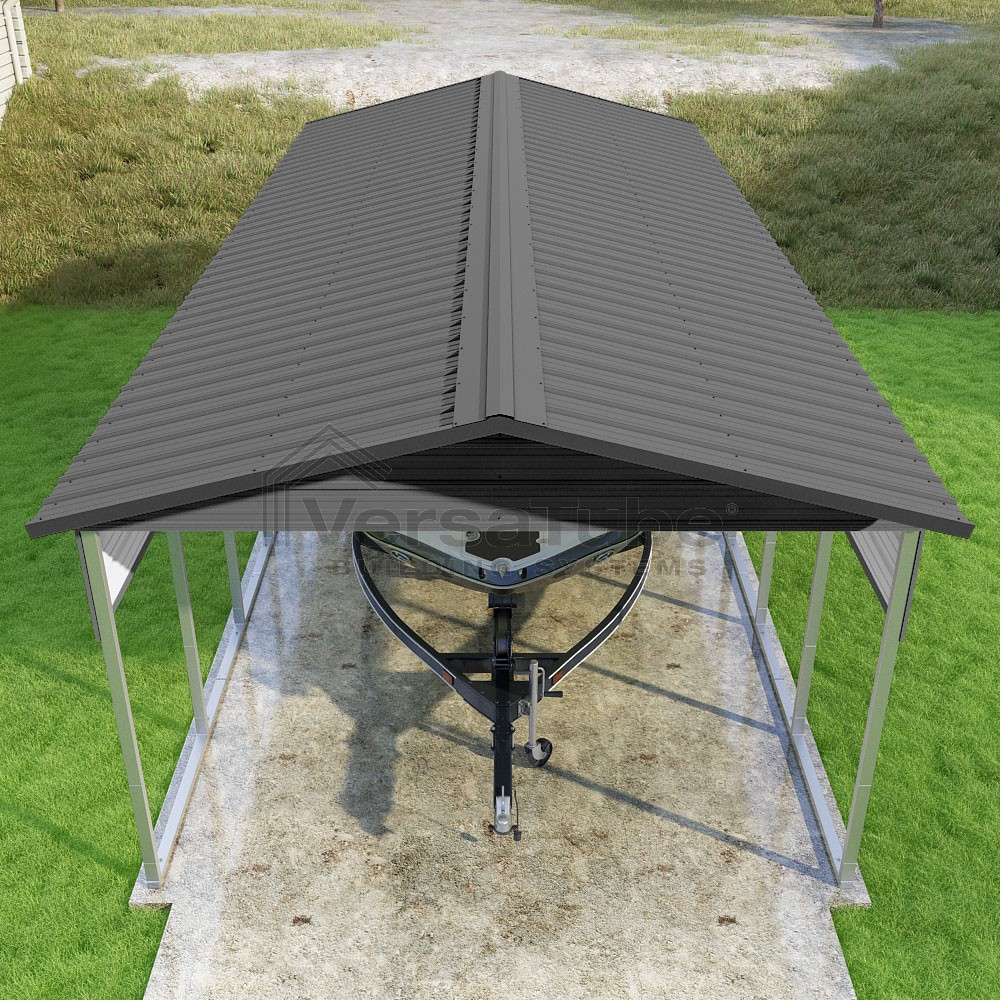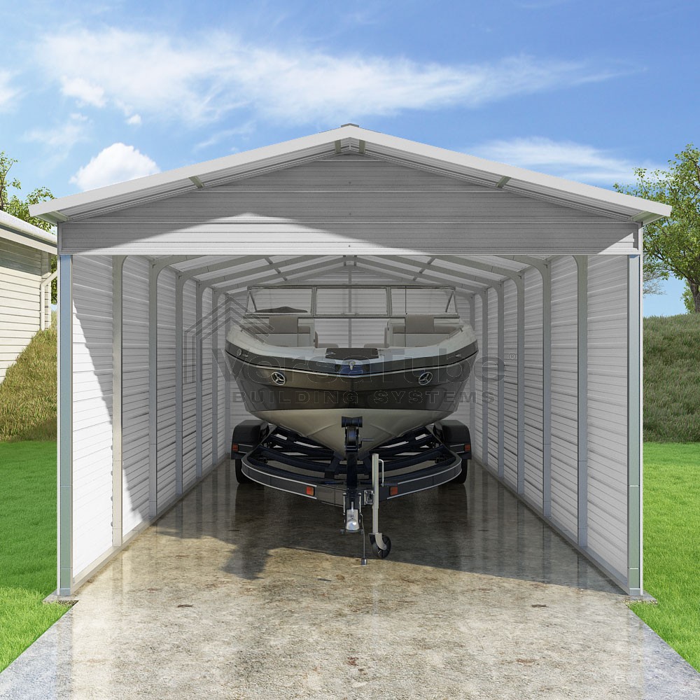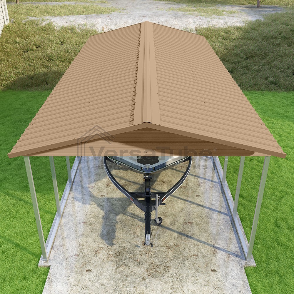 Pinnacle Series DIY carport kit features vertical sheet metal roof panels with ridge cap, gable and eave trim for an A-frame roof style and extended coverage on both ends.